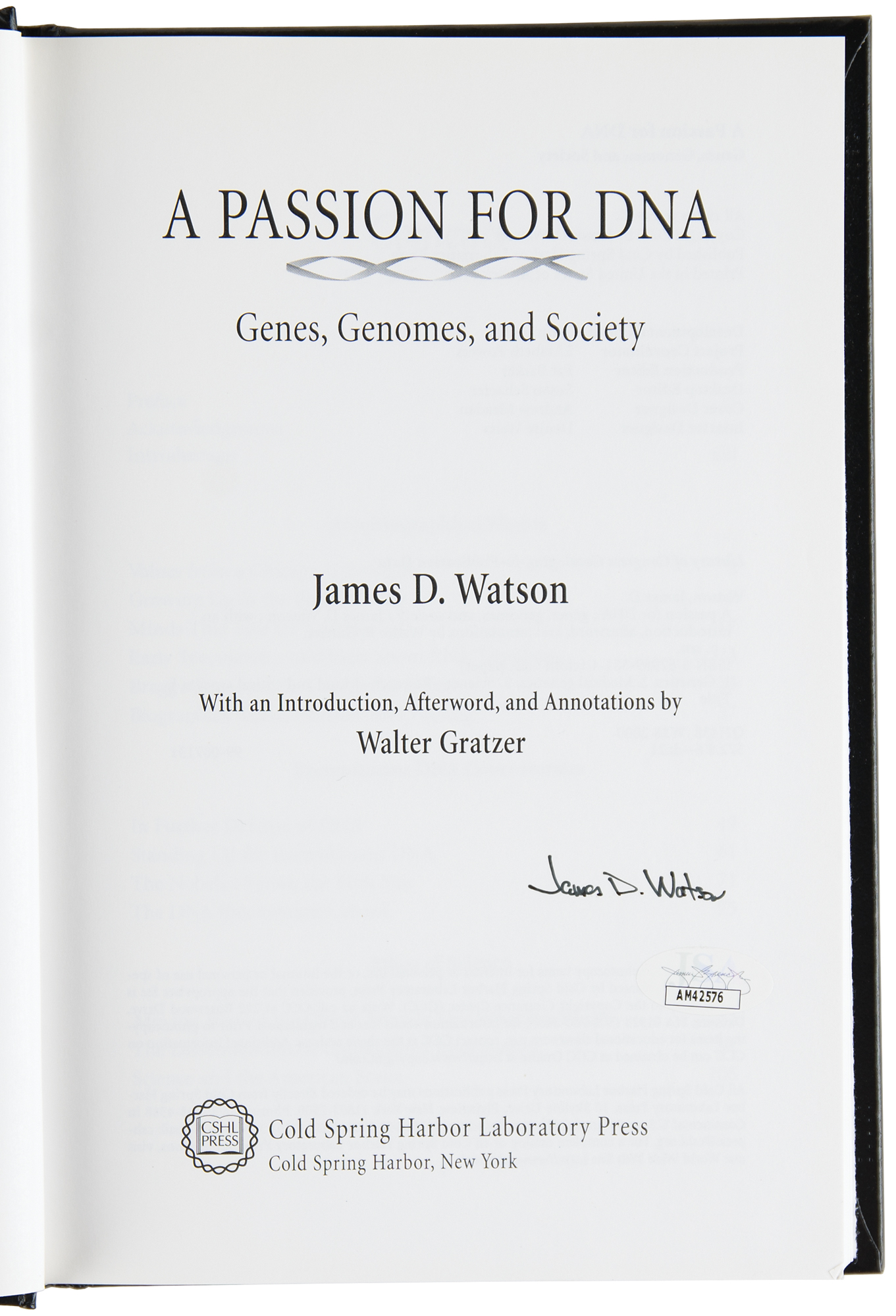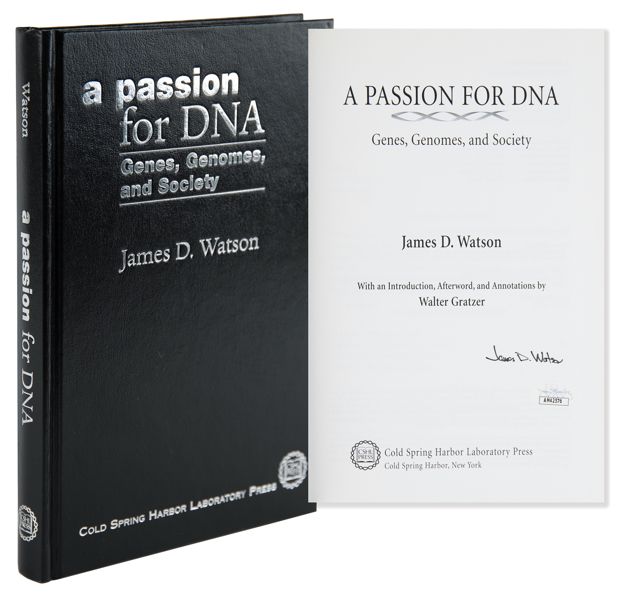 Signed book: A Passion for DNA: Genes, Genomes and Society. First edition. Cold Spring Harbor, NY: Cold Spring Harbor Laboratory Press, 2000. Hardcover, 6.25 x 9.5, 250 pages. Signed on the title page in black felt tip, "James D. Watson." In very fine condition, with a JSA label affixed to the signed page. Accompanied by a certificate of authenticity from JSA.
