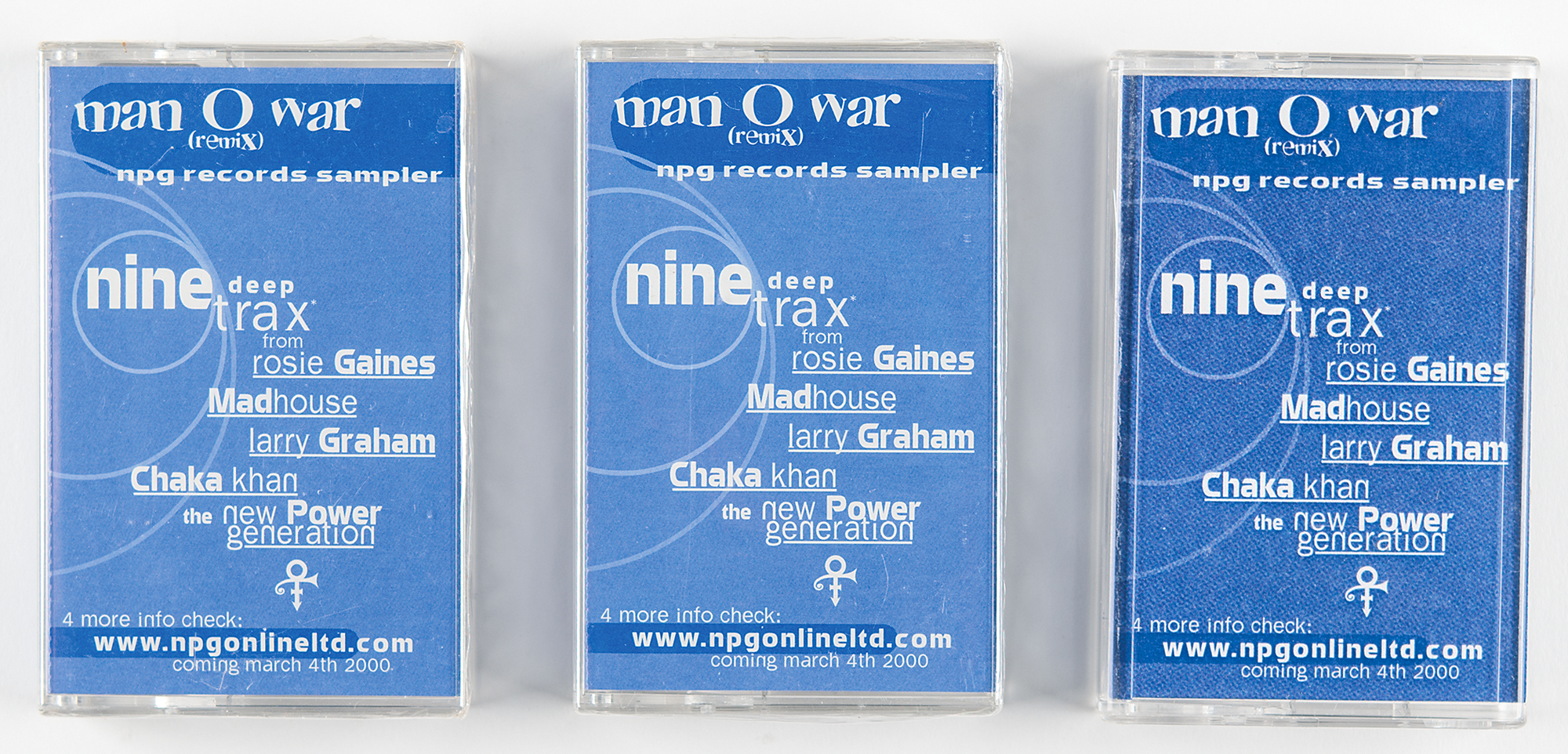 Rare set of three promotional cassette tapes for Prince’s ‘Man‘O’War (Remix) NPG Records Sampler,’ an unreleased sampler cassette planned for distribution by NPG Records in 2000 in conjunction with Prince’s 23rd album, Rave Un2 The Joy Fantastic. The spine of each tape is marked: “Promotional Copy, Not 4 Sale.” The artwork included the phrase ‘Nine Deep Trax,’ and the cassette is often referred to as such. It included edits of several unreleased tracks by various NPG Records artists, many of which remain unreleased. Unlike many samplers, the edits contained the beginning and end of most tracks, with the edits taking place in the core of the song, rather than a simple fade-out at the end. In overall fine condition, with two tapes sealed in their original wrapper.