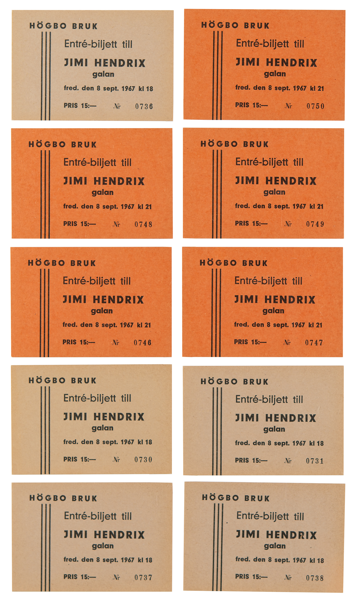 Ten original unused concert tickets for Jimi Hendrix’s concerts at the Popladan Hogbo Bruk, Gastrikland, Sweden on September 8, 1967. All tickets measure 3.5 x 2.5, with five consecutive-numbered beige tickets for the 18:00 show, and five consecutive-numbered orange tickets for the 21:00 show. In overall fine condition. Hendrix was in the midst of his second European tour.