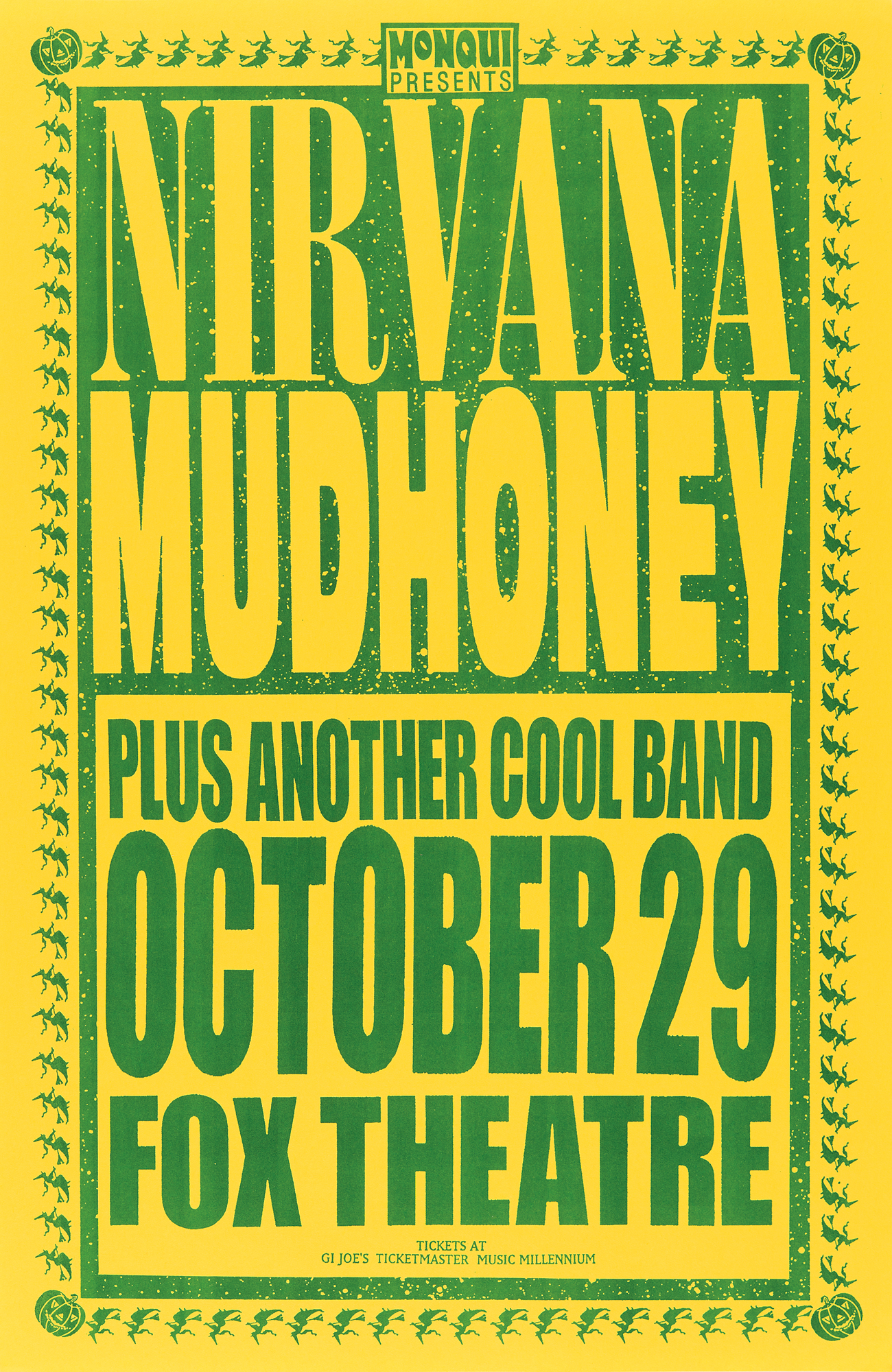 Original bright green-and-yellow 11 x 17 concert poster for Nirvana at the Fox Theatre in Portland, Oregon, on October 29, 1991, as part of the 'Nevermind' North American Tour, supported by Mudhoney "plus another cool band," which would end up being Sprinkler. Designed by Mike King, the Halloween-themed poster features witches lining the borders with pumpkins in each corner. In fine condition.