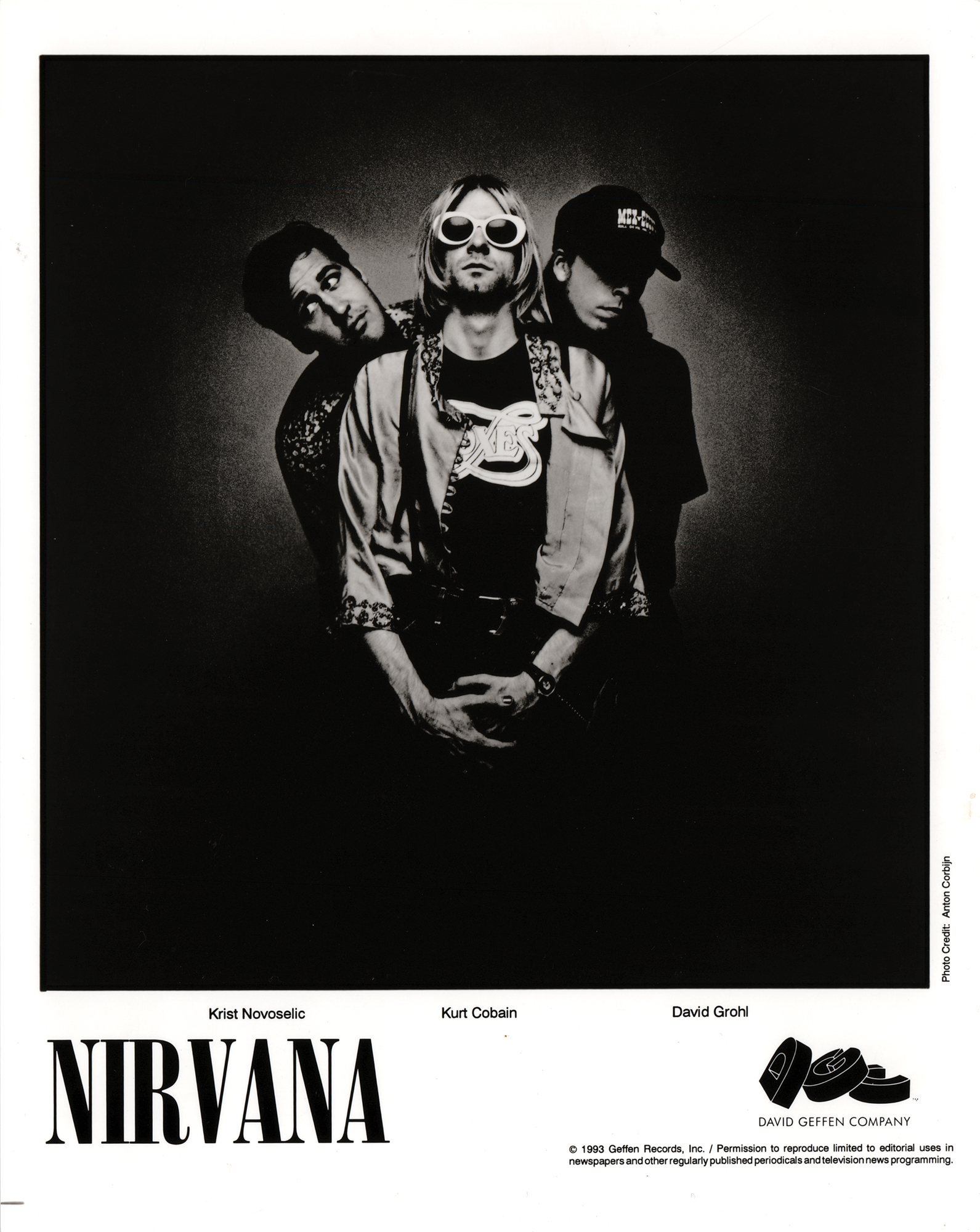 Circa 1993 satin-finish 8 x 10 Geffen Records promo photo of Nirvana, showing Kurt Cobain flanked by Krist Novoselic and Dave Grohl. In fine condition.