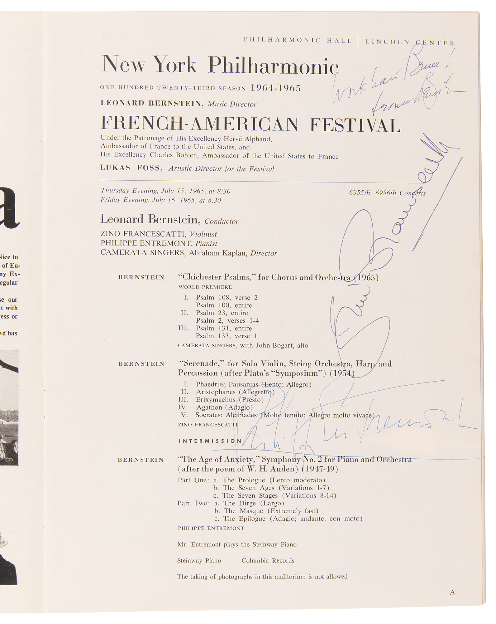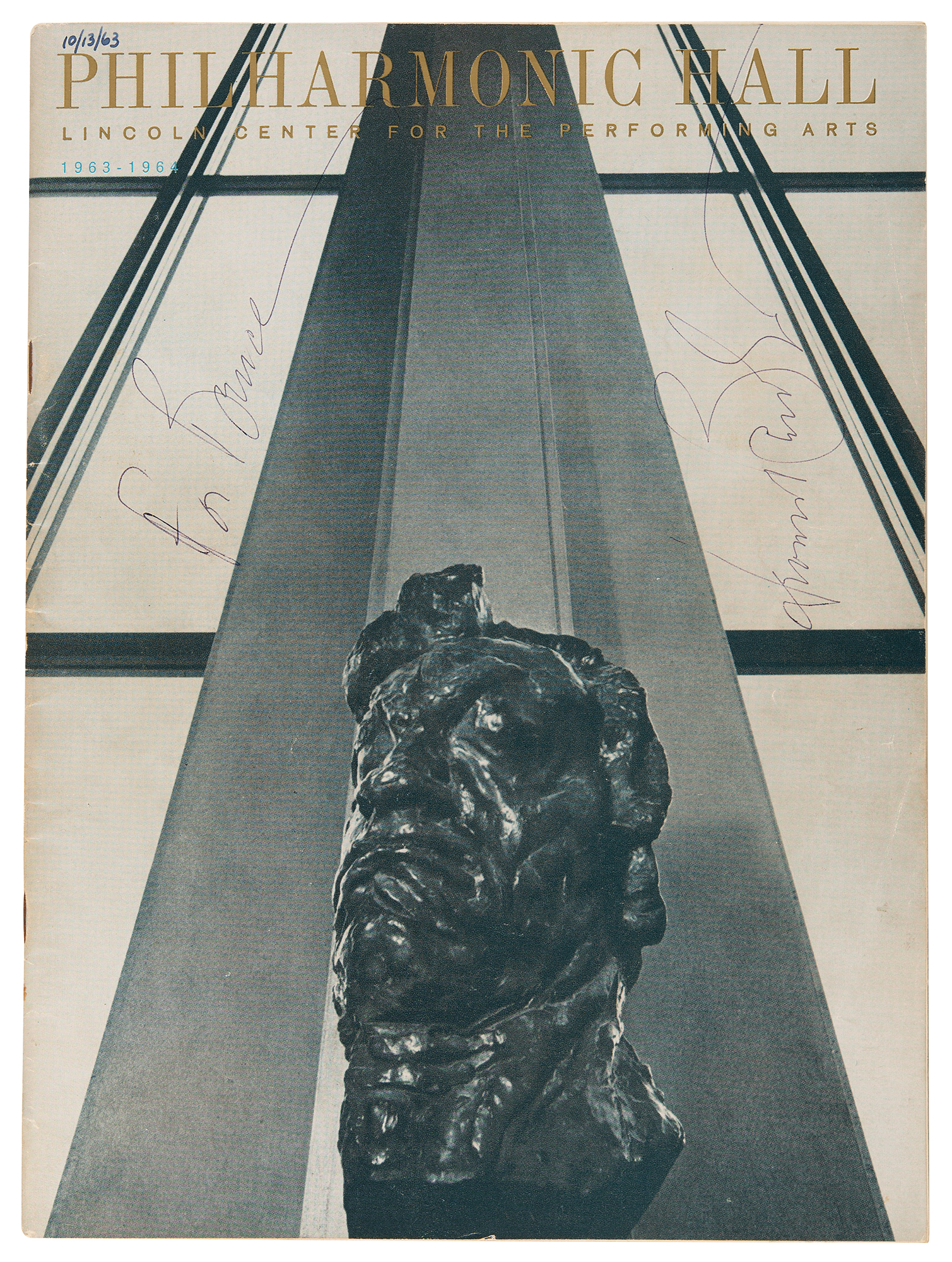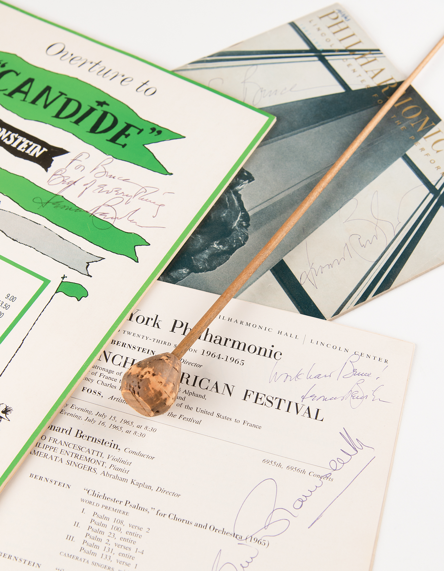 Includes three pieces signed by Leonard Bernstein: a program for the Philharmonic Hall's 1963–64 season, signed and inscribed on the front cover in black ballpoint, "For Bruce, Leonard Bernstein"; a program for the New York Philharmonic French-American Festival, July 14–July 31, 1965, signed and inscribed in blue ballpoint on the program page for the debut of Bernstein's Chichester Psalms, "Work hard Bruce! Leonard Bernstein," "Zino Francescatti," and "Philippe Entremont"; and the "Overture to 'Candide'" score referenced in the consignor's story, signed and inscribed on the front cover in black felt tip, "For Bruce—Best of everything, Leonard Bernstein."