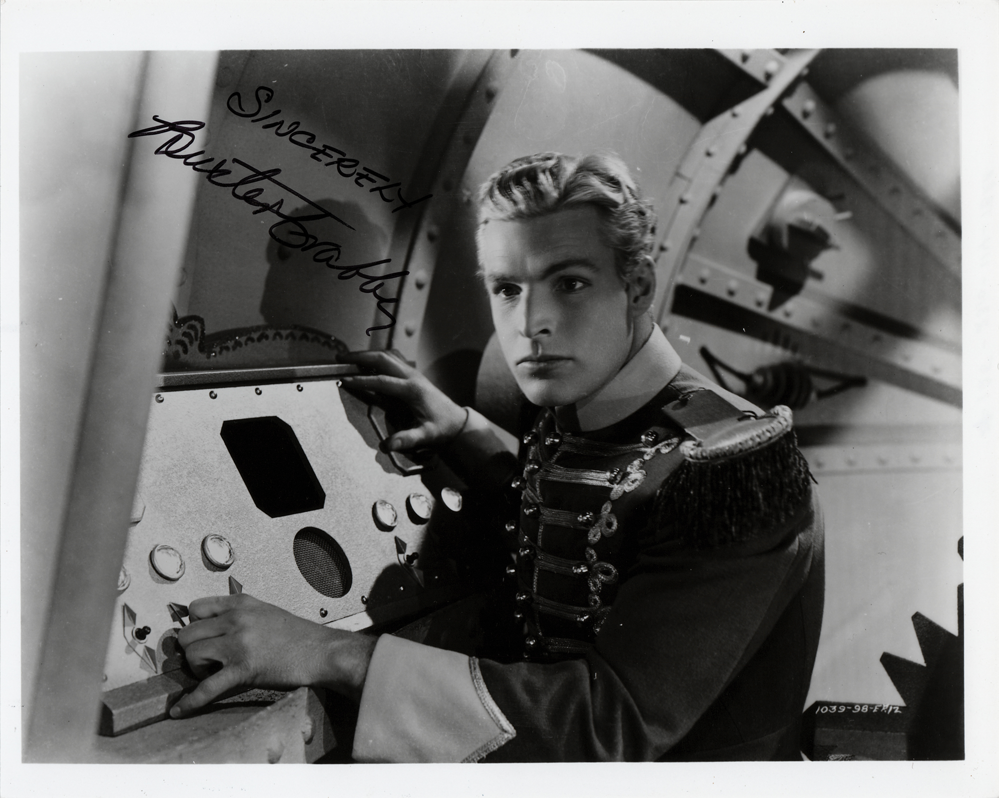 Glossy 10 x 8 photo of Buster Crabbe as Flash Gordon from the 1938 science-fiction movie serial Flash Gordon's Trip to Mars, signed in black felt tip, “Sincerely, Buster Crabbe.” In very fine condition.