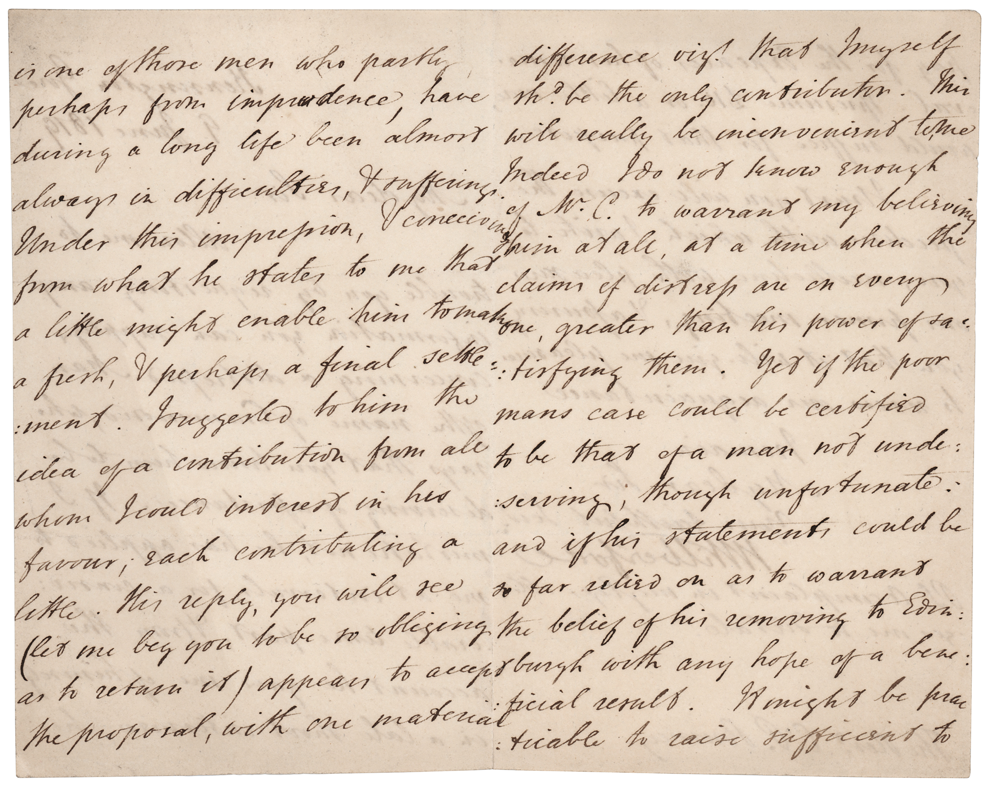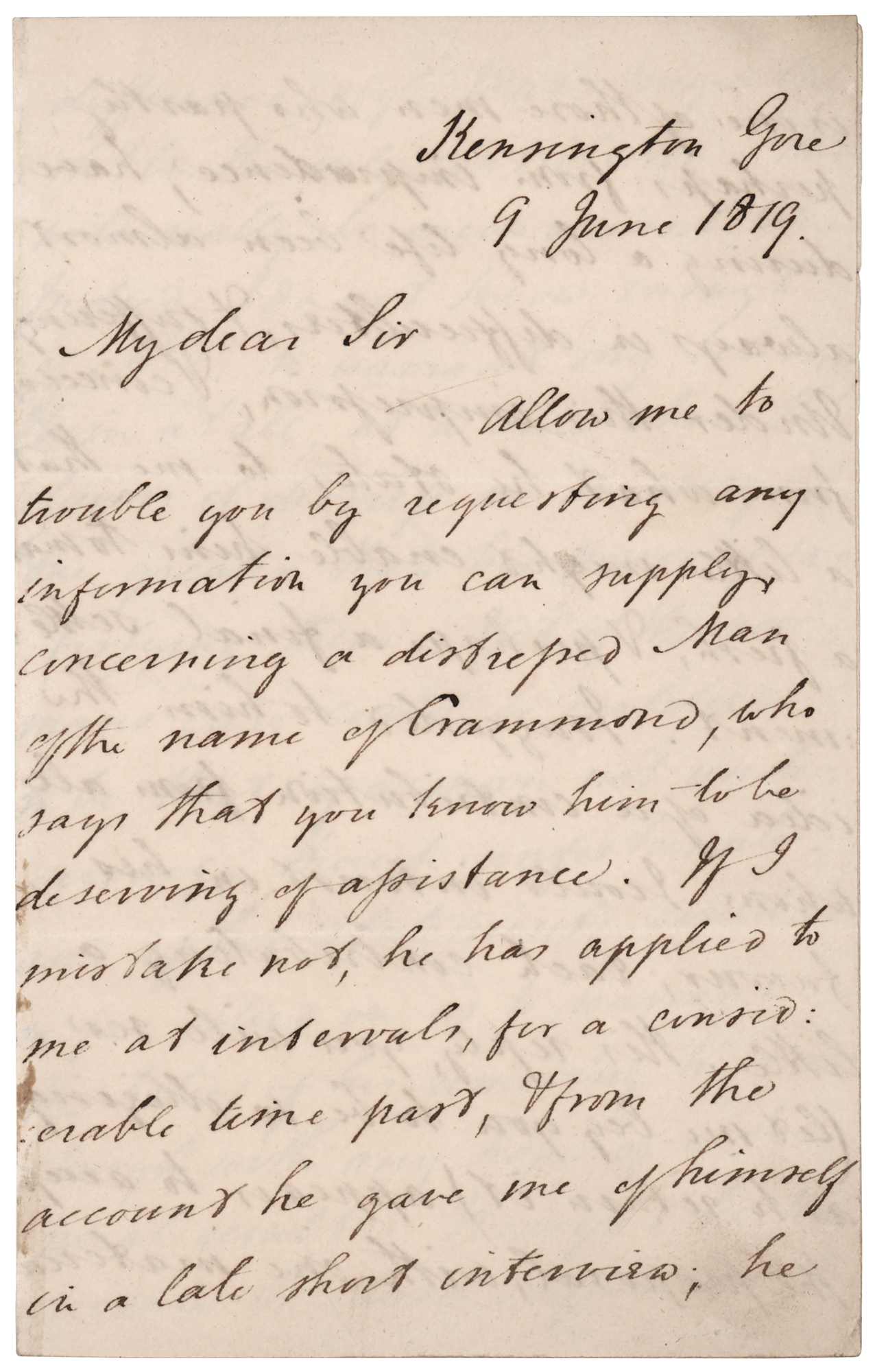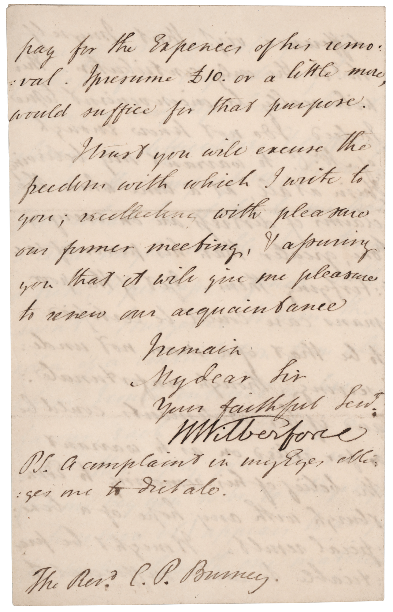 British politician, evangelist, and philanthropist (1759–1833) who played an important role in the movement to abolish slavery. LS signed “W. Wilberforce,” four pages on two adjoining sheets, 4.5 x 7.25, June 9, 1819. Addressed from Kensington Gore, a letter to Reverend Charles P. Burney, in part: “Allow me to trouble you by requesting any information you can supply concerning a distressed Man of the name of Crammond, who says that you know him to be deserving of assistance. If I mistake not, he has applied to me at intervals, for a considerable time past, & from the account he gave me of himself in a late short interview; he is one of those men who partly perhaps from imprudence, have during a long life been almost always in difficulties, & suffering…I suggested to him the idea of a contribution from all whom I could interest in his favour; each contributing a little. His reply, you will see…appears to accept the proposal.” In fine condition.