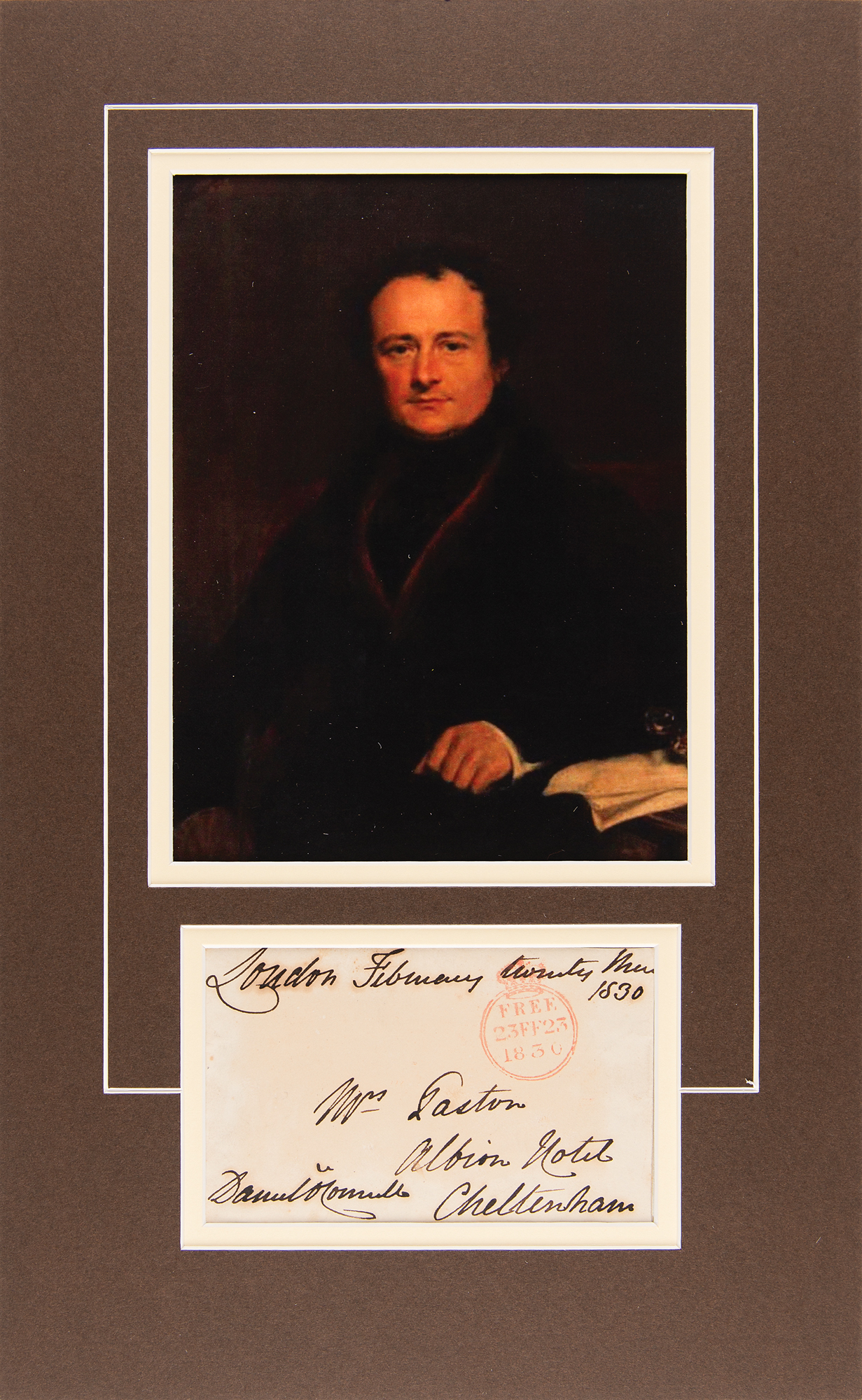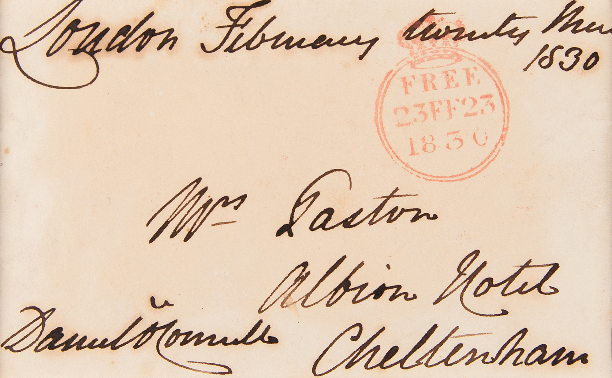 Irish political leader (1775-1847) best known for his tireless efforts on behalf of Catholic Emancipation and the repeal of the Act of Union which combined Ireland and Great Britain. Hand-addressed and free-franked address panel, 5 x 3, addressed by O'Connell to “Mrs. Gaston, Albion Hotel, Chesterham,” and franked in the lower left, "Daniel O'Connell." Also dated across the top by O'Connell, “London, February twenty three, 1830," and canceled with a “Free” postmark. Nicely double-matted with a color portrait to an overall size of 9.75 x 15.75. In fine condition, with slight haloing to the ink from a light stain.