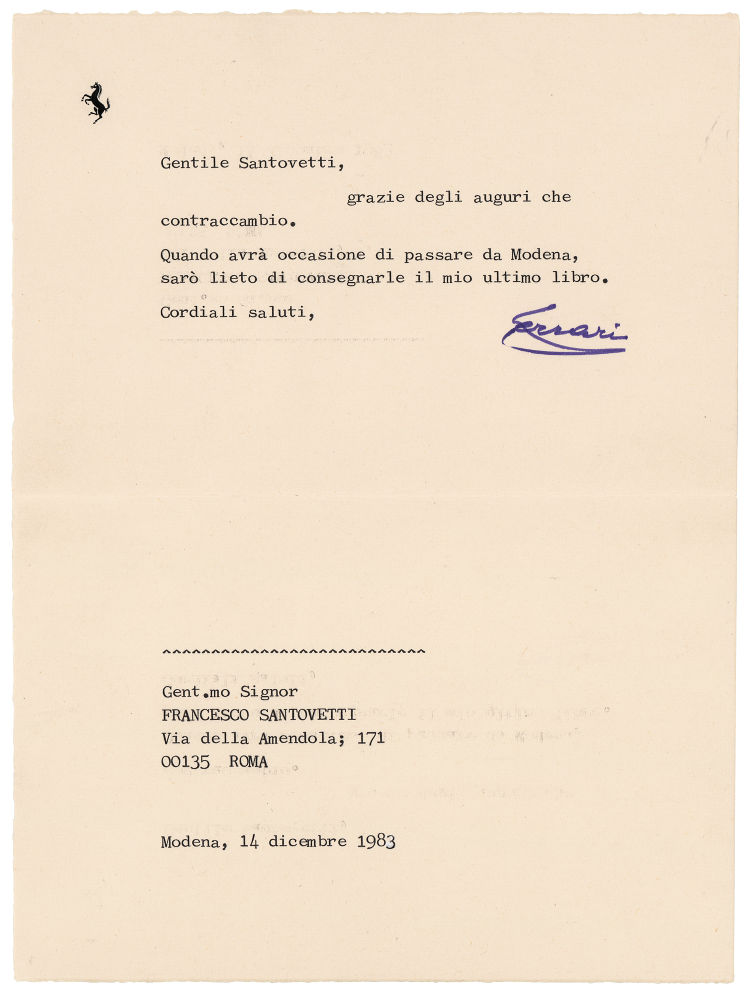 TLS in Italian, signed “Ferrari,” one page, 6.25 x 8.25, Ferrari letterhead, December 14, 1983. Letter to Francesco Santovetti, in full (translated): “Thank you for your greetings, which I reciprocate. When you have the opportunity to pass through Modena, I will be happy to deliver my latest book to you.” In very fine condition. Accompanied by the original mailing envelope.