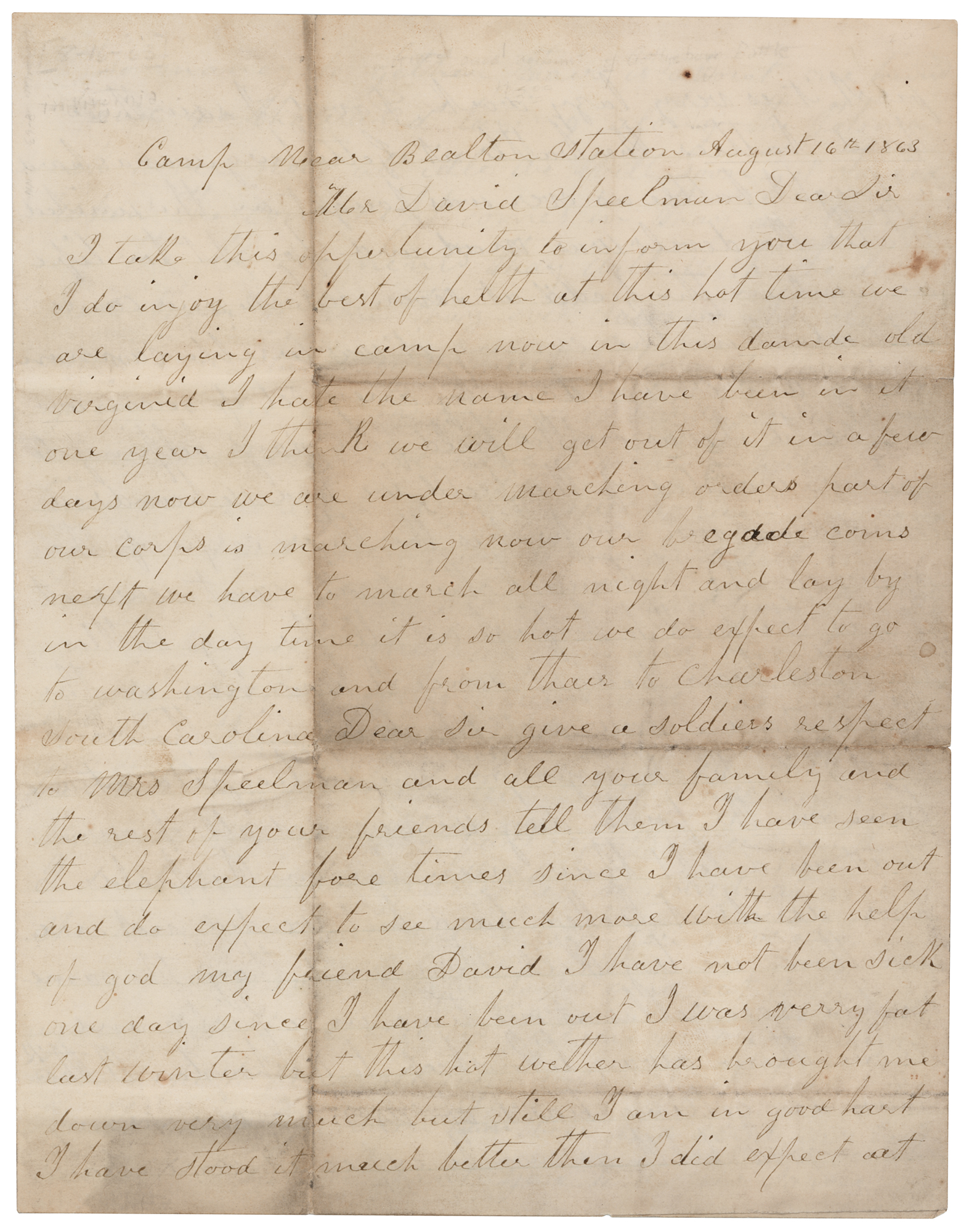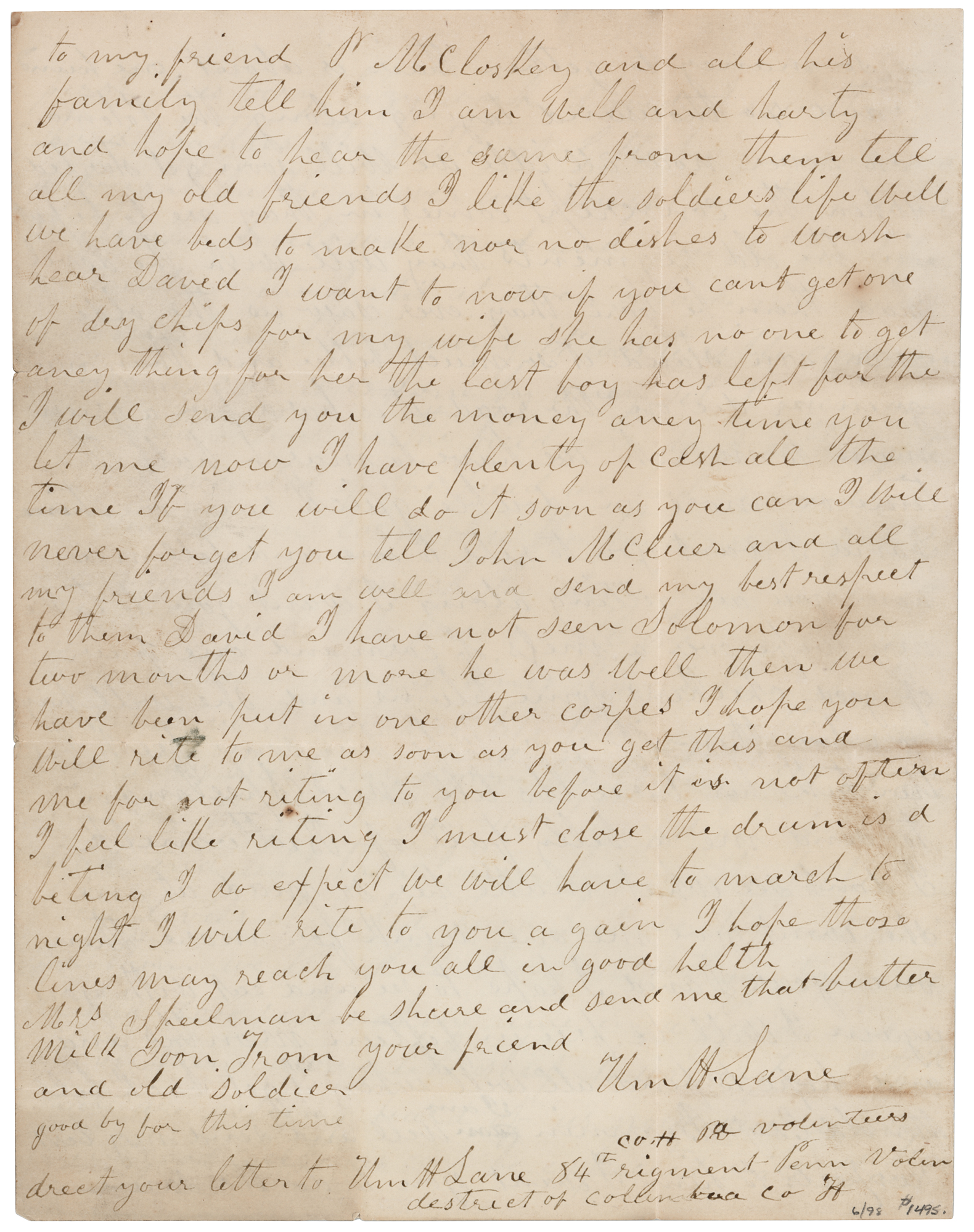 There is about one hundred and 40 thousand laying along the Potomac River now all idle. We will soon get started. When the conscripts come they are to be put in the old regiments. They will wish the devil had them before they ever saw us. The old men can stand it so much better and they must go or die. On the road it is hard for a green man to march. We half to march half the time or more on double quick rain or shine. David, I want you to write to me and tell me how you are getting along. I want you to take my wife over a mess of corn and one pair of good chickens, some plums, and she will pay you for them. If your wife has some fresh butter take her three lbs. Tell Mrs. Speelman to send me a belly full of Buttermilk. I don't see what makes her so mad at me. She won't give me one drink for more than one year. David, I hope to see and eat with you again. I will be free in fifteen months and hope to find all well when I get back." In fine condition, with slightly irregular light toning.