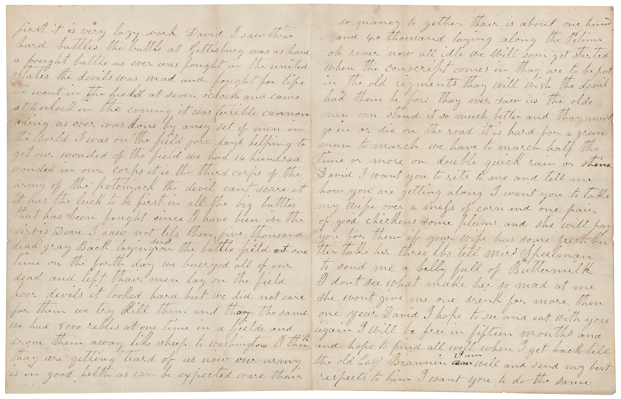 ALS signed “Wm. H. Lane, Co. H, Pa. Volunteers,” four pages on two adjoining sheets, 7.5 x 9.75, August 16, 1863. Handwritten letter from "Camp Near Bealton Station," Virginia, describing experiences during the Battle of Gettysburg, with a reference to Pickett's charge. In part (phonetic spelling corrected): "I take this opportunity to inform you that I do enjoy the best of health at this hot time. We are laying in camp in this damned old Virginia. I hate the name. I have been in it one year. I think we will get out of it in a few days now. We are under marching orders. Part of our Corps is marching now. Our Brigade comes next. We have to march all night and lay by in the day. It is so hot. We do expect to go to Washington and from there to Charleston, South Carolina…