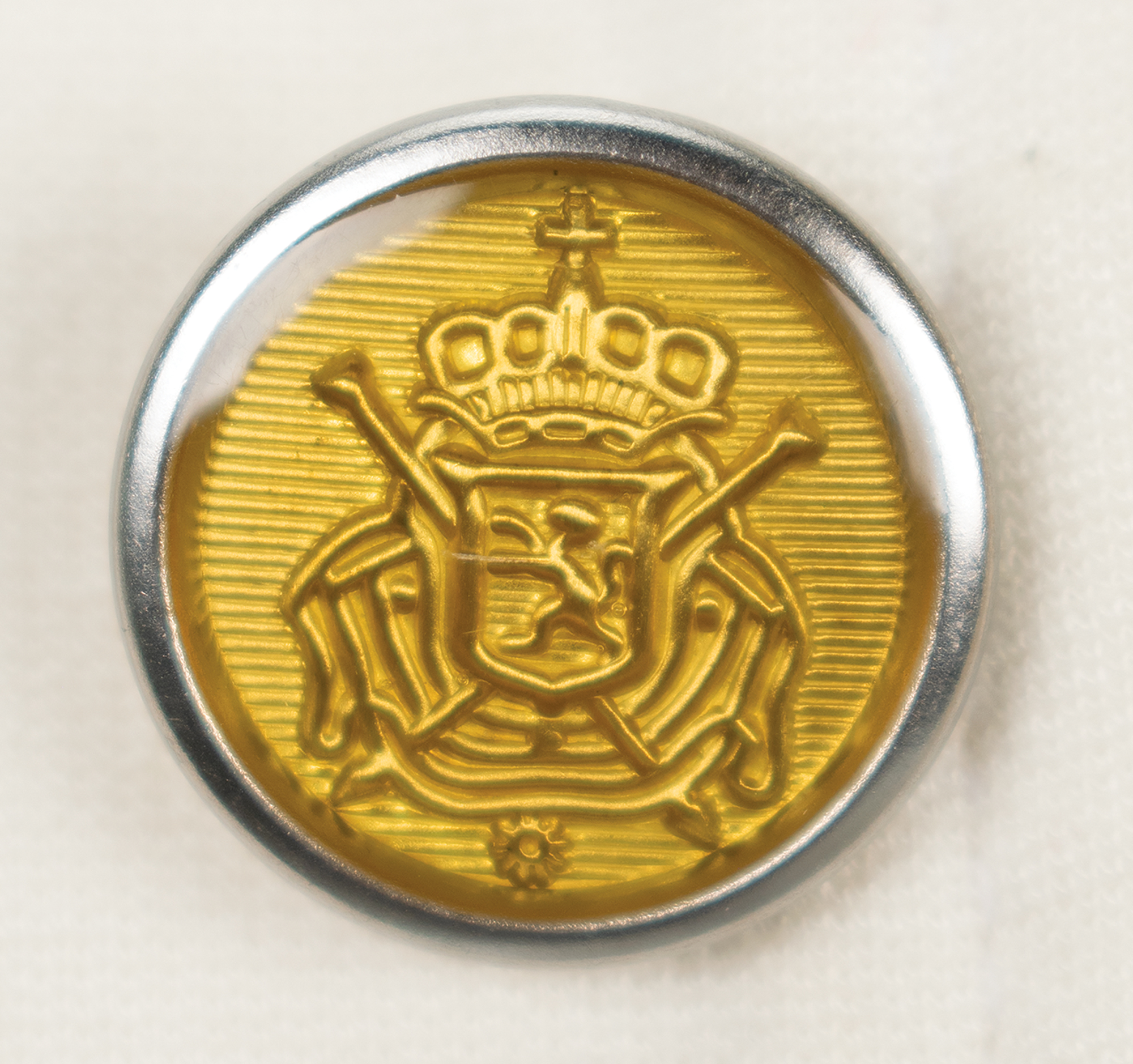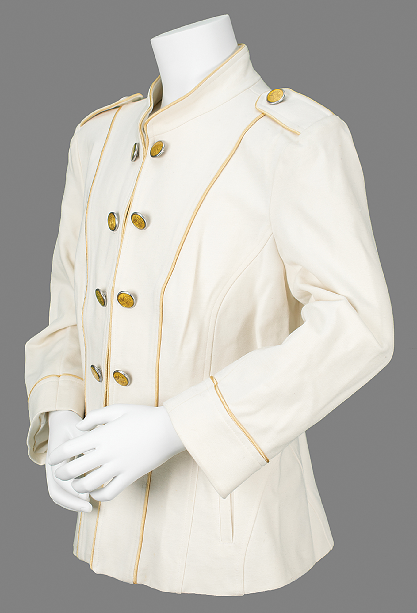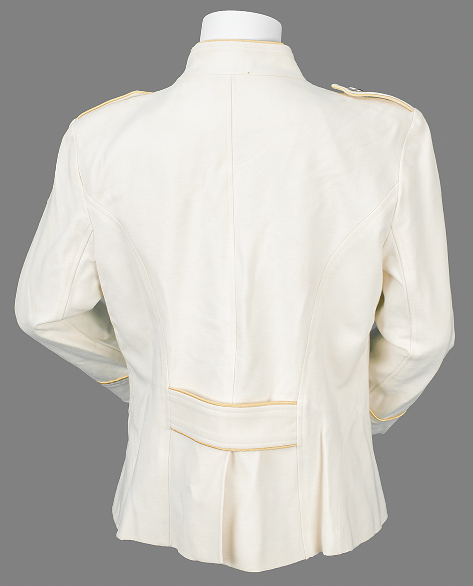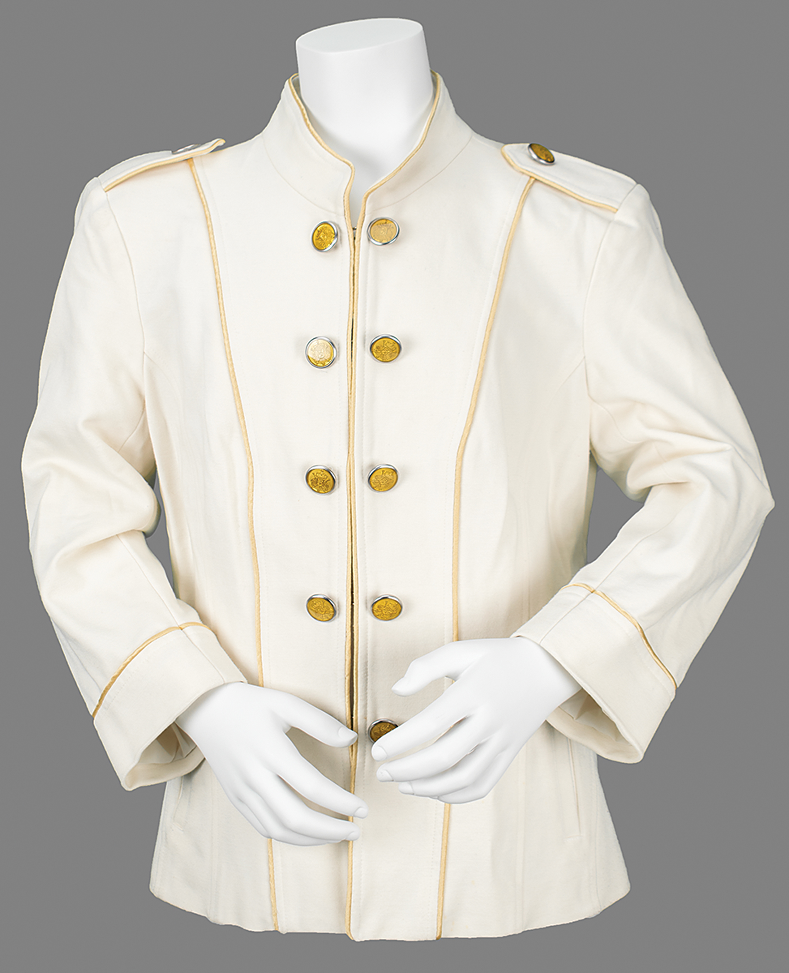 Prince’s personally-owned and -worn long-sleeved cream military jacket, accented with handsome gold piping and decorative regal crest buttons on the placket and epaulets. Gorgeously made in a classic Versace-style design, the coat is lined in white silk and boasts impeccable detail and craftsmanship throughout. Prince wore the jacket in and around his Glam Slam nightclub in Miami, Florida. In fine condition, with a few minor stains to the lining.
