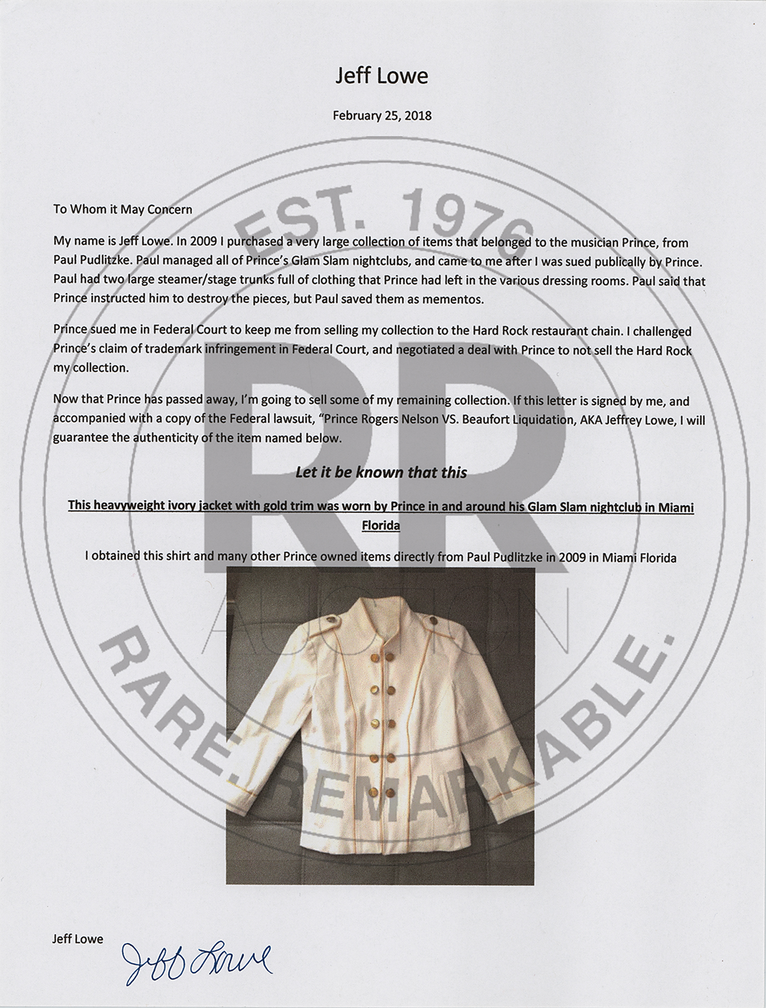 Accompanied by a letter of provenance from Jeff Lowe (of Tiger King fame), stating that he acquired the jacket in 2009 from Glam Slam club manager Paul Pudlitzke. In part: "In 2009 I purchased a very large collection of items that belonged to the musician Prince, from Paul Pudlitzke. Paul managed all of Prince's Glam Slam nightclubs."
