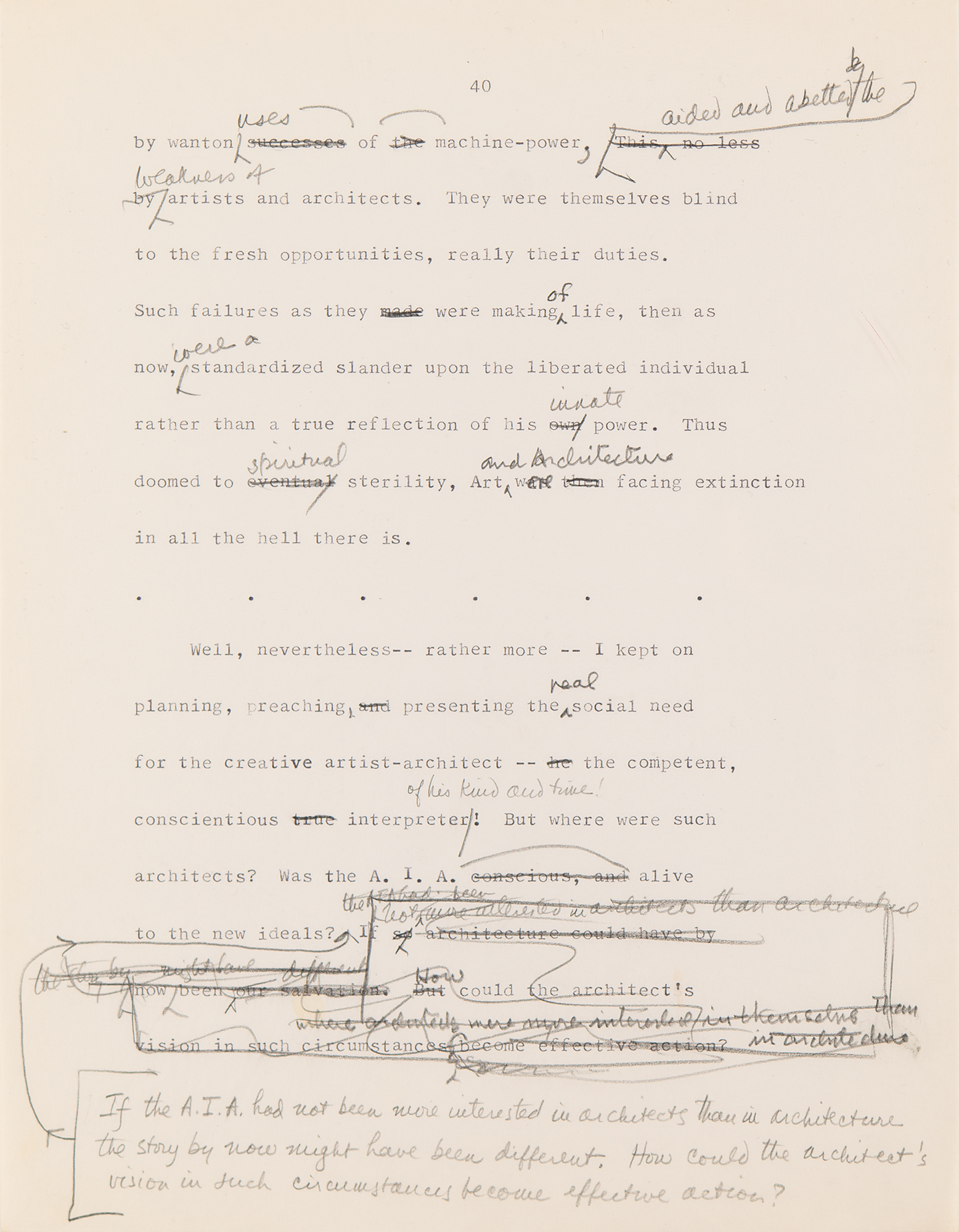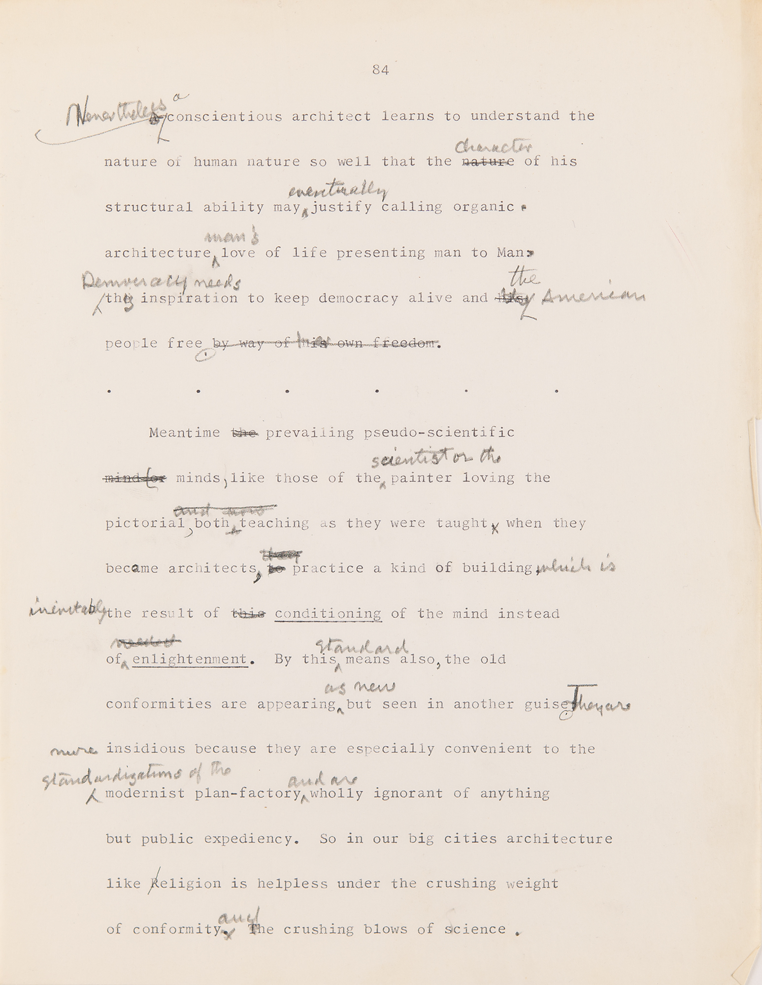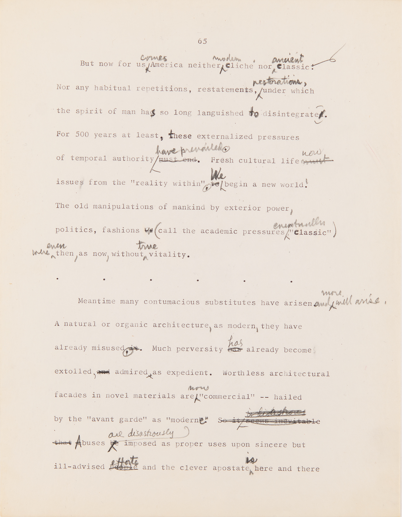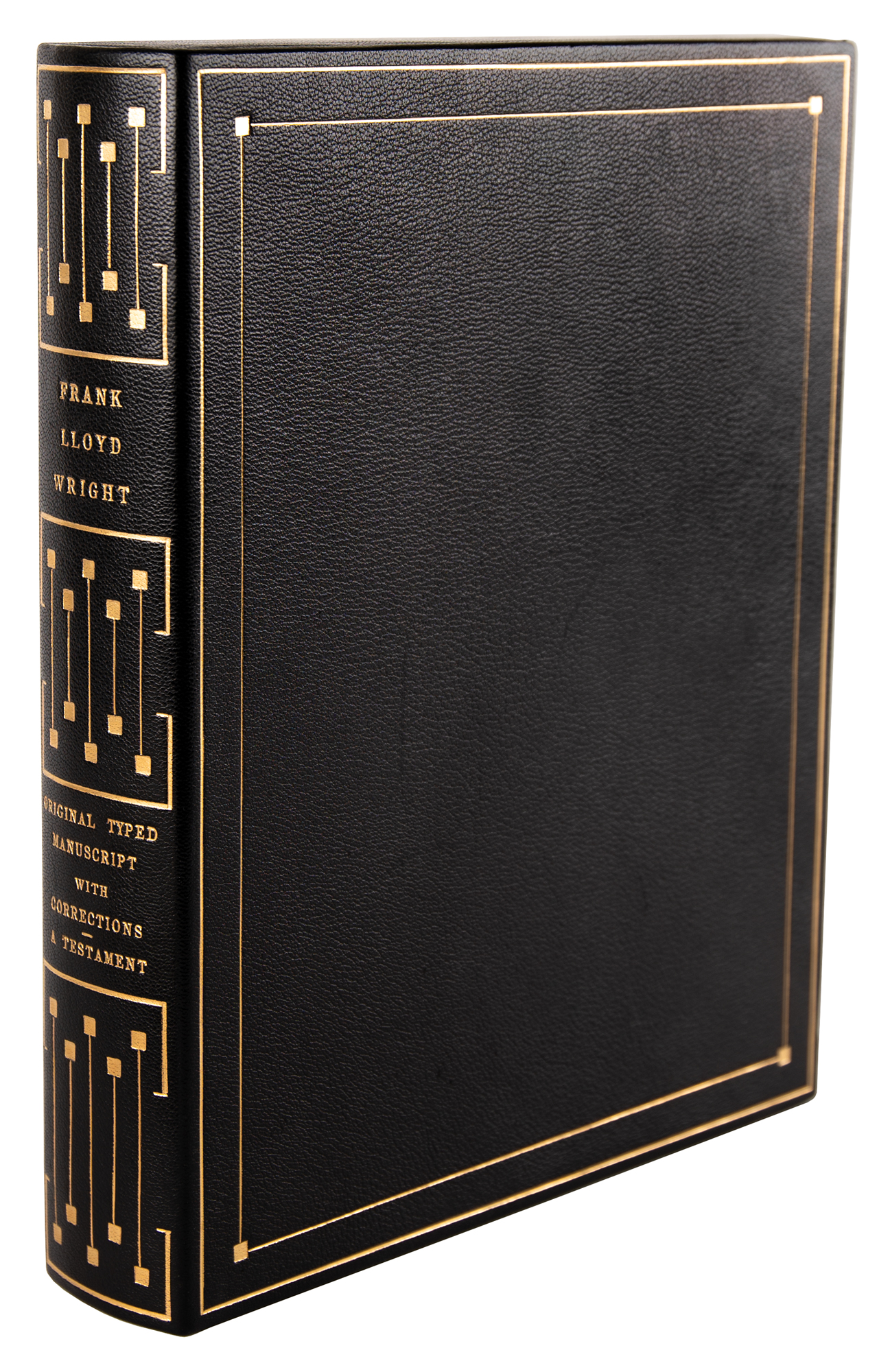Wright discusses the development of American architecture at length, levying criticisms at the American Institute of Architects, writing at the bottom of one page: "If the A.I.A. had not been more interested in architects than in architecture, the story by now might have been different. How could the architect's vision in such circumstances become effective action?" In a section headed "The Common Man and His Education," Wright pens a complete passage: "Form—birth—is needed. But it is not to be formed in sporadic endeavour to remodel our philosophy by hearsay, or by imported aesthetics. We will not be able to maintain the religion of democracy by profit-system equipment, nor help it grow by the conditioning our youngsters receive by current education. Managed publicity of any kind designed to please the public taste cannot be good enough." Commenting on the politics in America, he writes: "When quality does not find its way into government, the individual becomes sacrificed to quantity." In addition to writing out these longer revisions, Wright makes frequent edits and deletions to single words or sentences as he formulates his final draft for publication. In fine condition. Accompanied by a handsome custom-made full morocco slipcase with chemise.