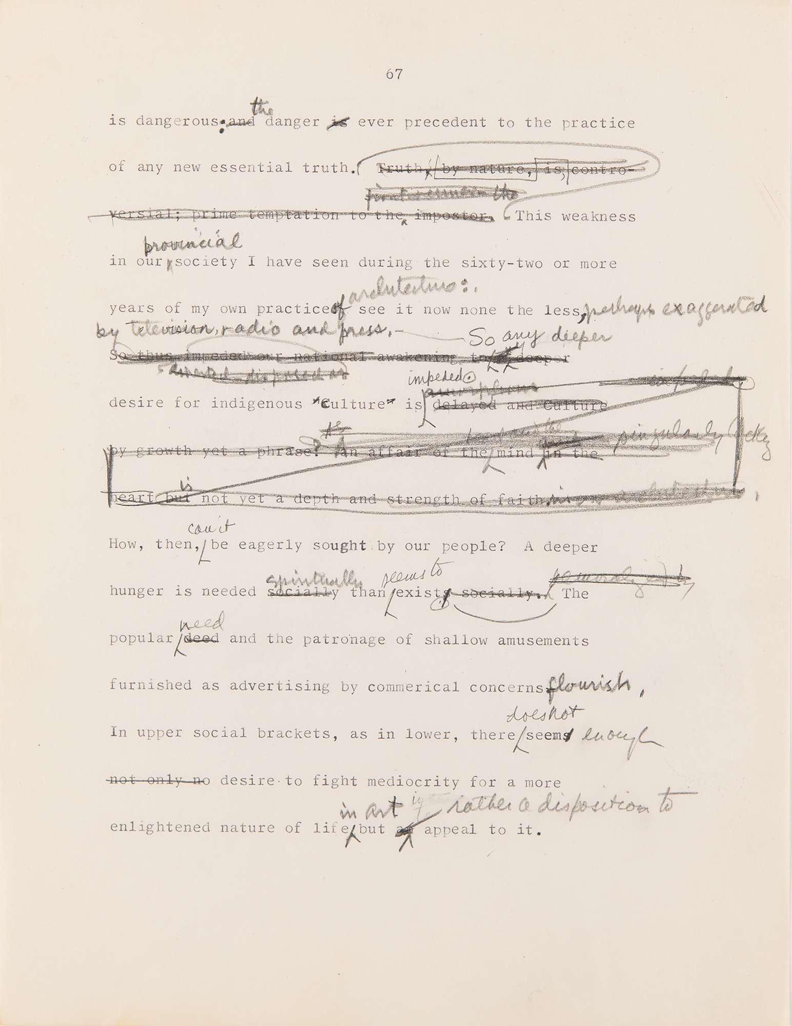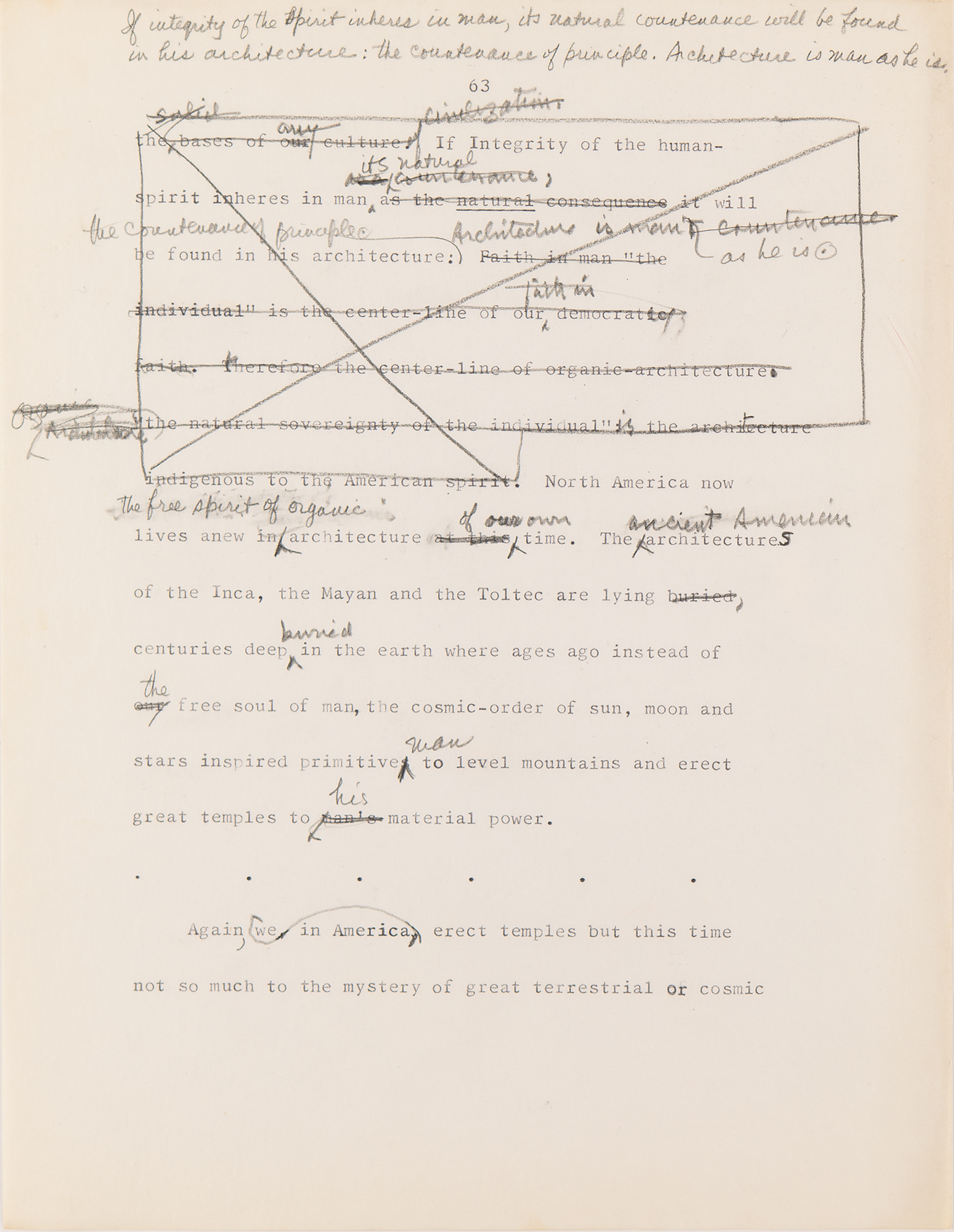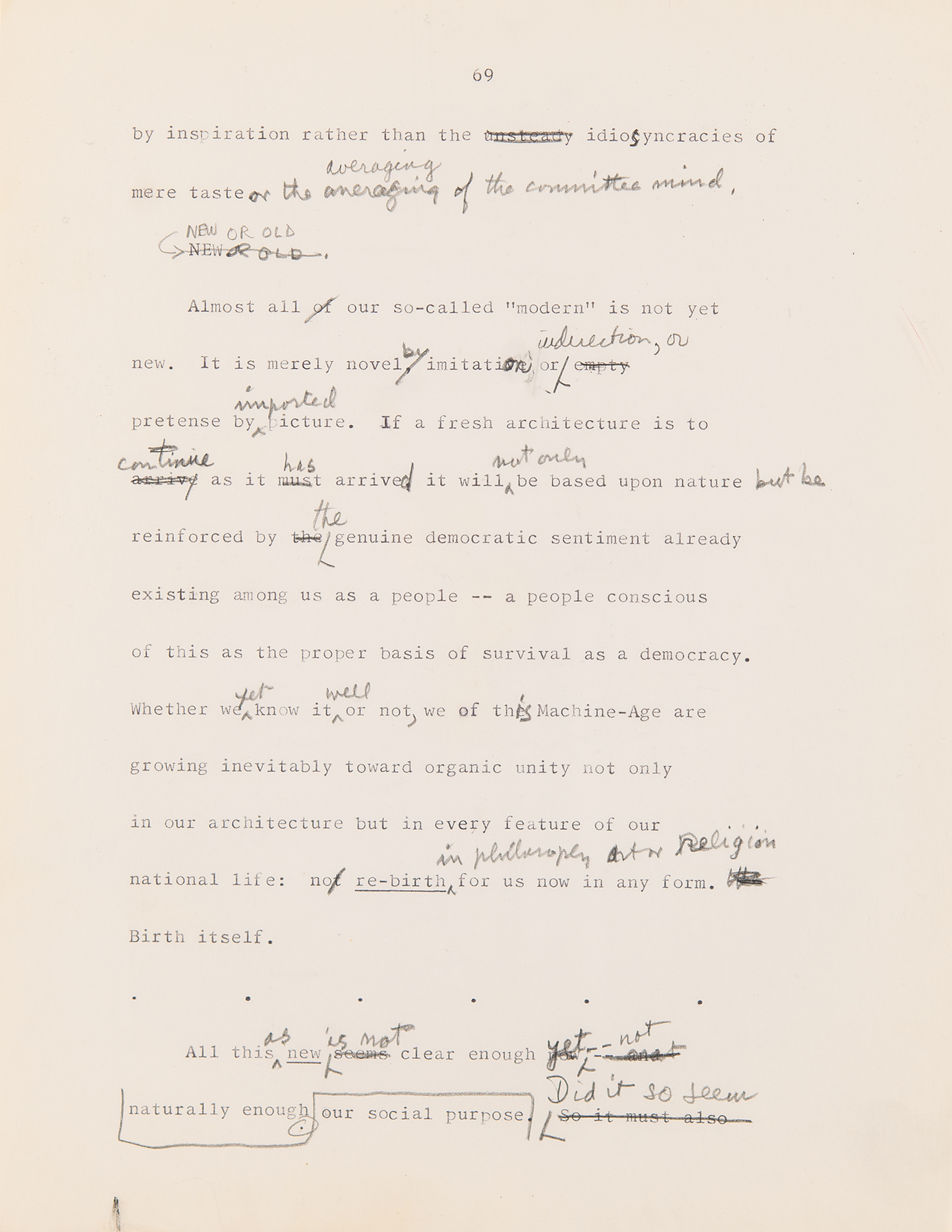 Wright discusses the development of American architecture at length, levying criticisms at the American Institute of Architects, writing at the bottom of one page: "If the A.I.A. had not been more interested in architects than in architecture, the story by now might have been different. How could the architect's vision in such circumstances become effective action?" In a section headed "The Common Man and His Education," Wright pens a complete passage: "Form—birth—is needed. But it is not to be formed in sporadic endeavour to remodel our philosophy by hearsay, or by imported aesthetics. We will not be able to maintain the religion of democracy by profit-system equipment, nor help it grow by the conditioning our youngsters receive by current education. Managed publicity of any kind designed to please the public taste cannot be good enough." Commenting on the politics in America, he writes: "When quality does not find its way into government, the individual becomes sacrificed to quantity." In addition to writing out these longer revisions, Wright makes frequent edits and deletions to single words or sentences as he formulates his final draft for publication. In fine condition. Accompanied by a handsome custom-made full morocco slipcase with chemise.
