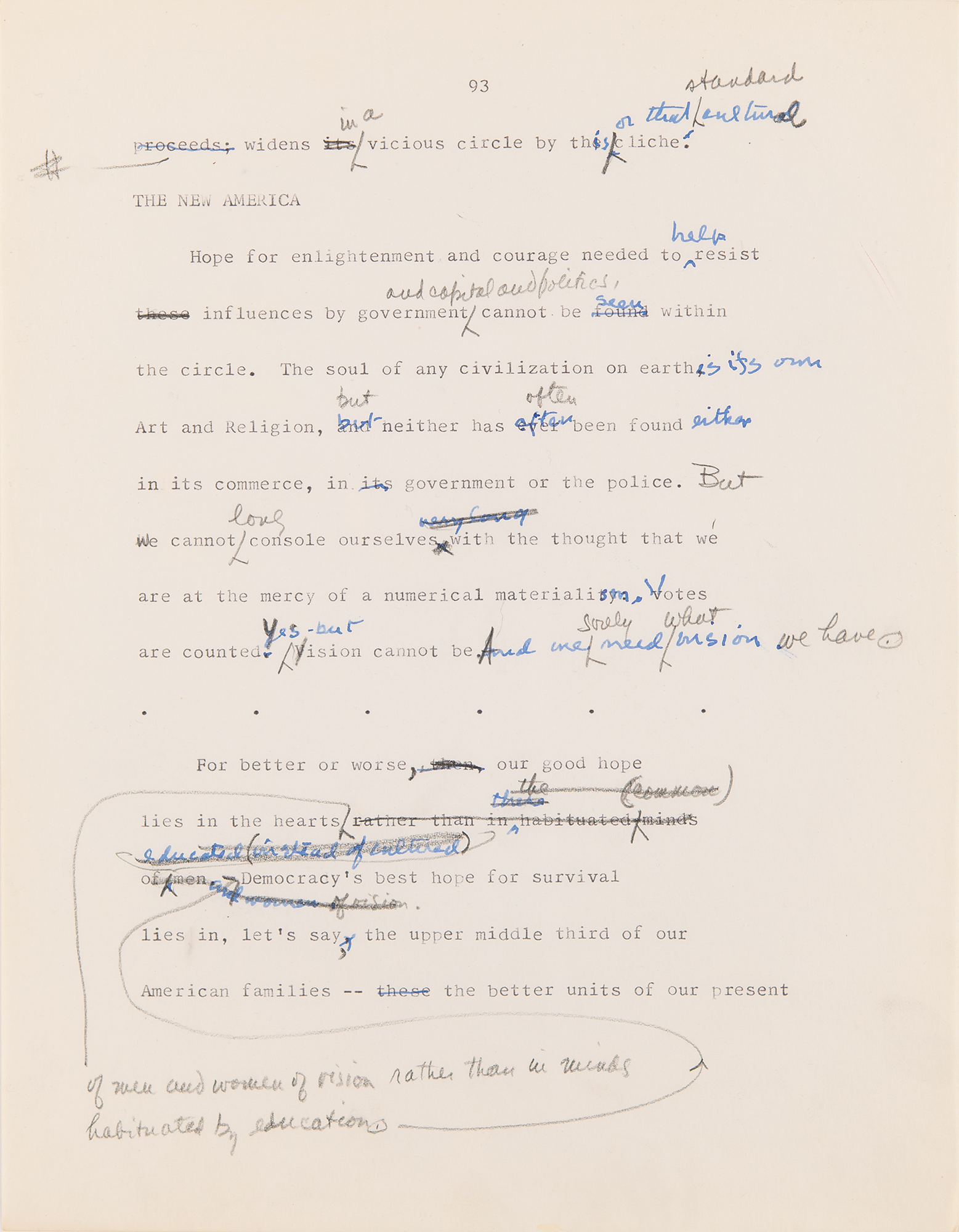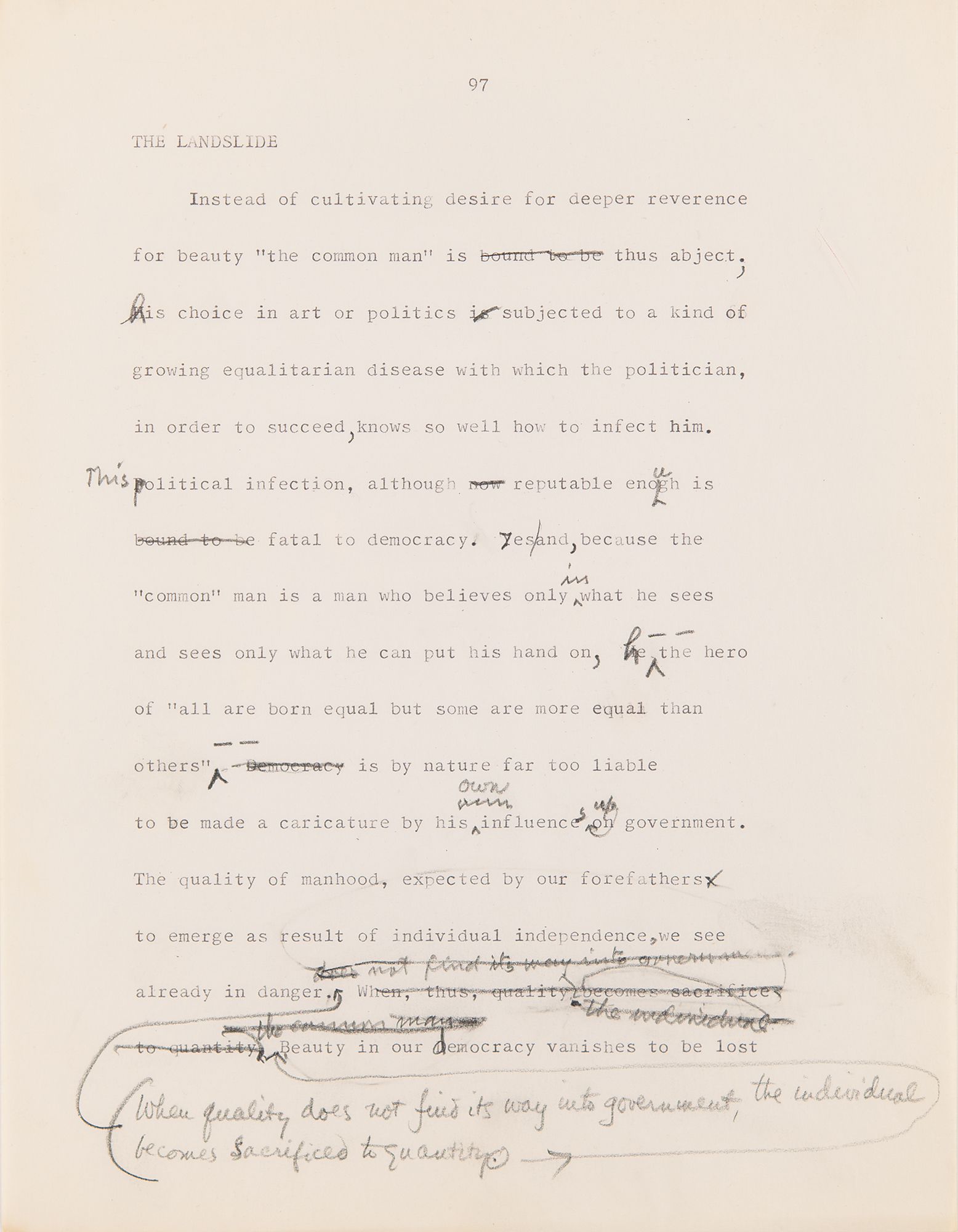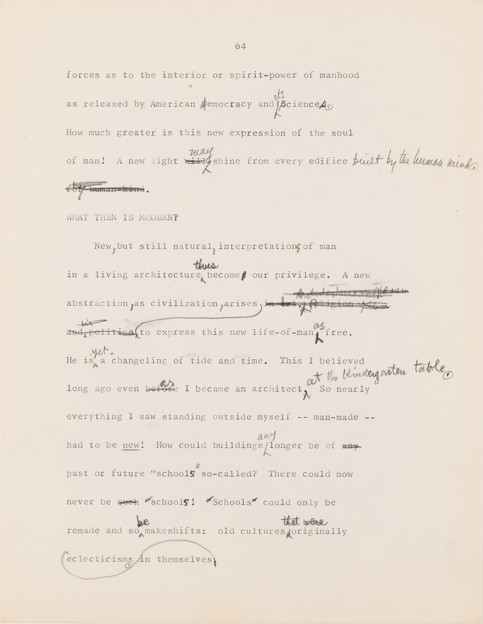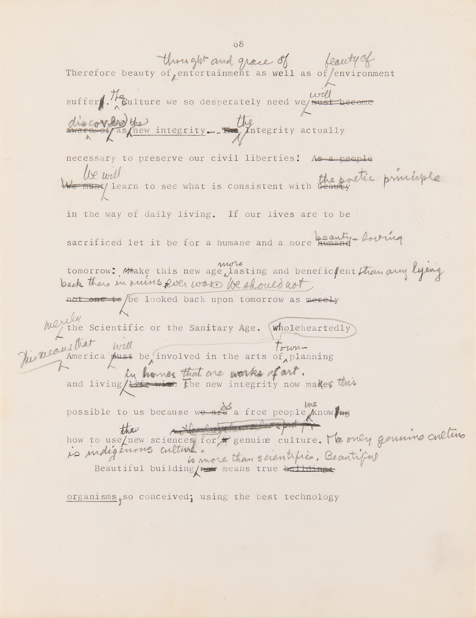 Wright discusses the development of American architecture at length, levying criticisms at the American Institute of Architects, writing at the bottom of one page: "If the A.I.A. had not been more interested in architects than in architecture, the story by now might have been different. How could the architect's vision in such circumstances become effective action?" In a section headed "The Common Man and His Education," Wright pens a complete passage: "Form—birth—is needed. But it is not to be formed in sporadic endeavour to remodel our philosophy by hearsay, or by imported aesthetics. We will not be able to maintain the religion of democracy by profit-system equipment, nor help it grow by the conditioning our youngsters receive by current education. Managed publicity of any kind designed to please the public taste cannot be good enough." Commenting on the politics in America, he writes: "When quality does not find its way into government, the individual becomes sacrificed to quantity." In addition to writing out these longer revisions, Wright makes frequent edits and deletions to single words or sentences as he formulates his final draft for publication. In fine condition. Accompanied by a handsome custom-made full morocco slipcase with chemise.
