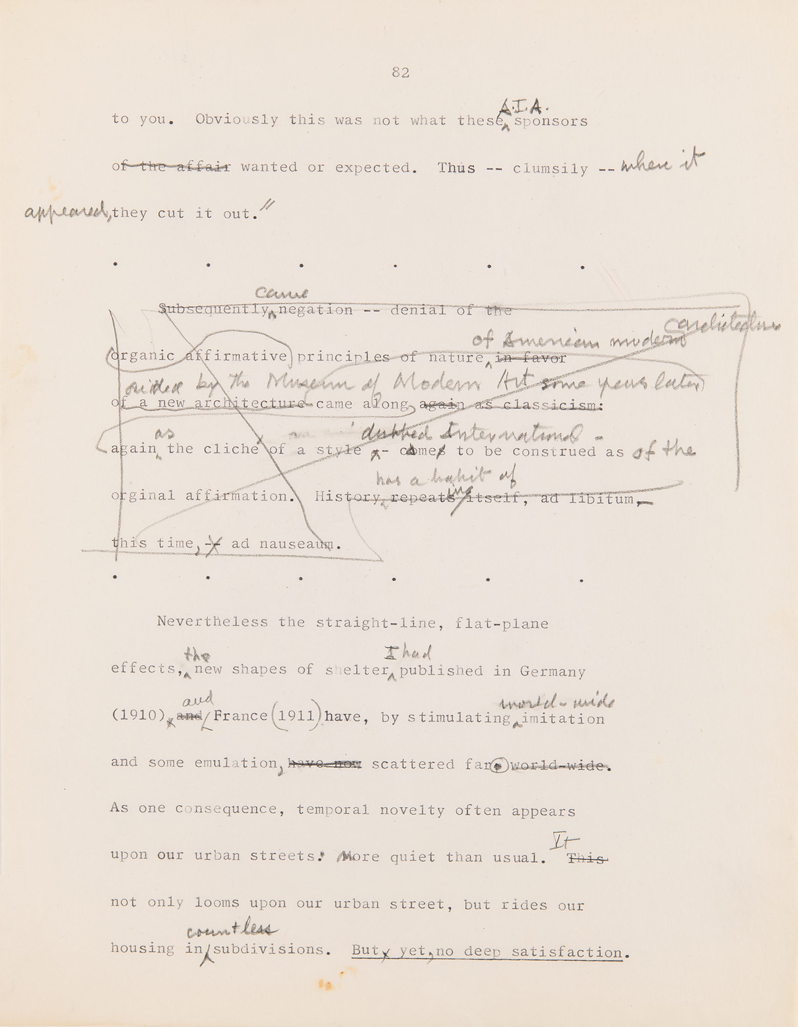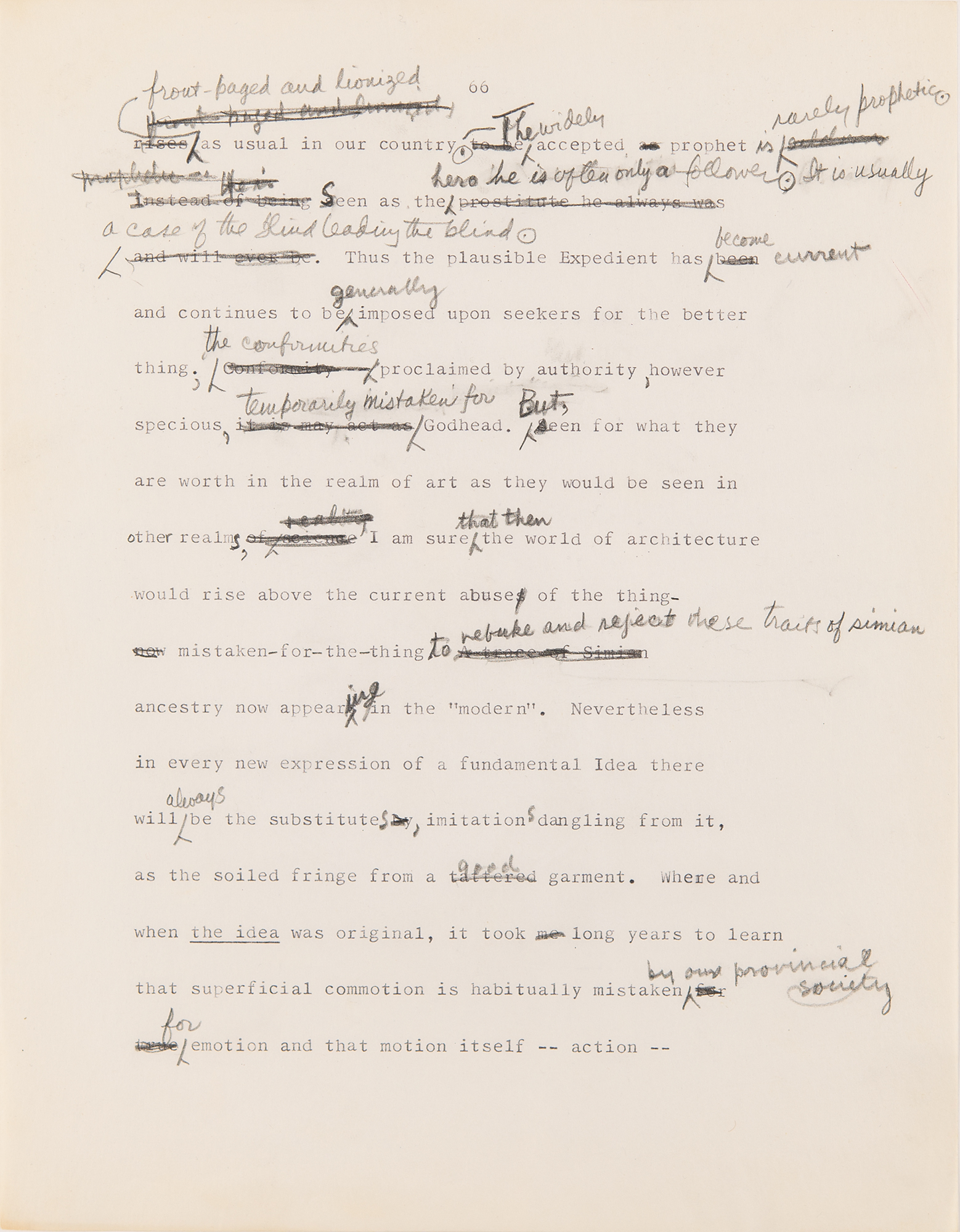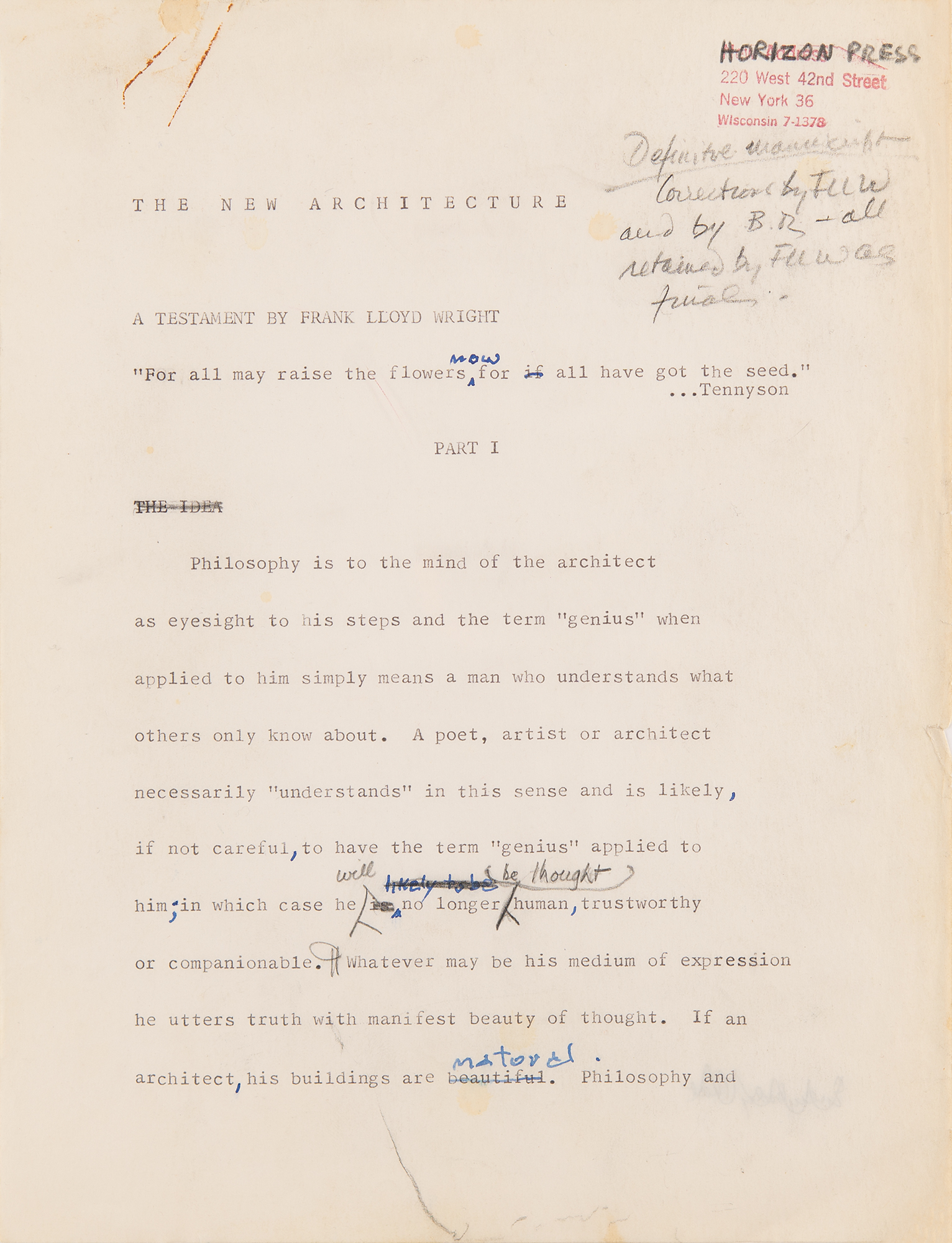 Extensively hand-corrected typed manuscript draft for "The New Architecture: A Testament" by Frank Lloyd Wright, 224 pages, 8.5 x 11, annotated at the head of the first page in another hand, "Definitive manuscript. Corrections by FLLW and by B. R.—all retained by FLLW as final," and stamped with the address of the publisher, Horizon Press in New York. This definitive, hand corrected, pre-publication manuscript opens (as corrected): "Philosophy is to the mind of the architect as eyesight to his steps and the term 'genius' when applied to him simply means a man who understands what others only know about. A poet, artist or architect necessarily 'understands' in this sense and is likely, if not careful, to have the term 'genius' applied to him; in which case he will no longer be thought human, trustworthy or companionable. Whatever may be his medium of expression he utters truth with manifest beauty of thought…