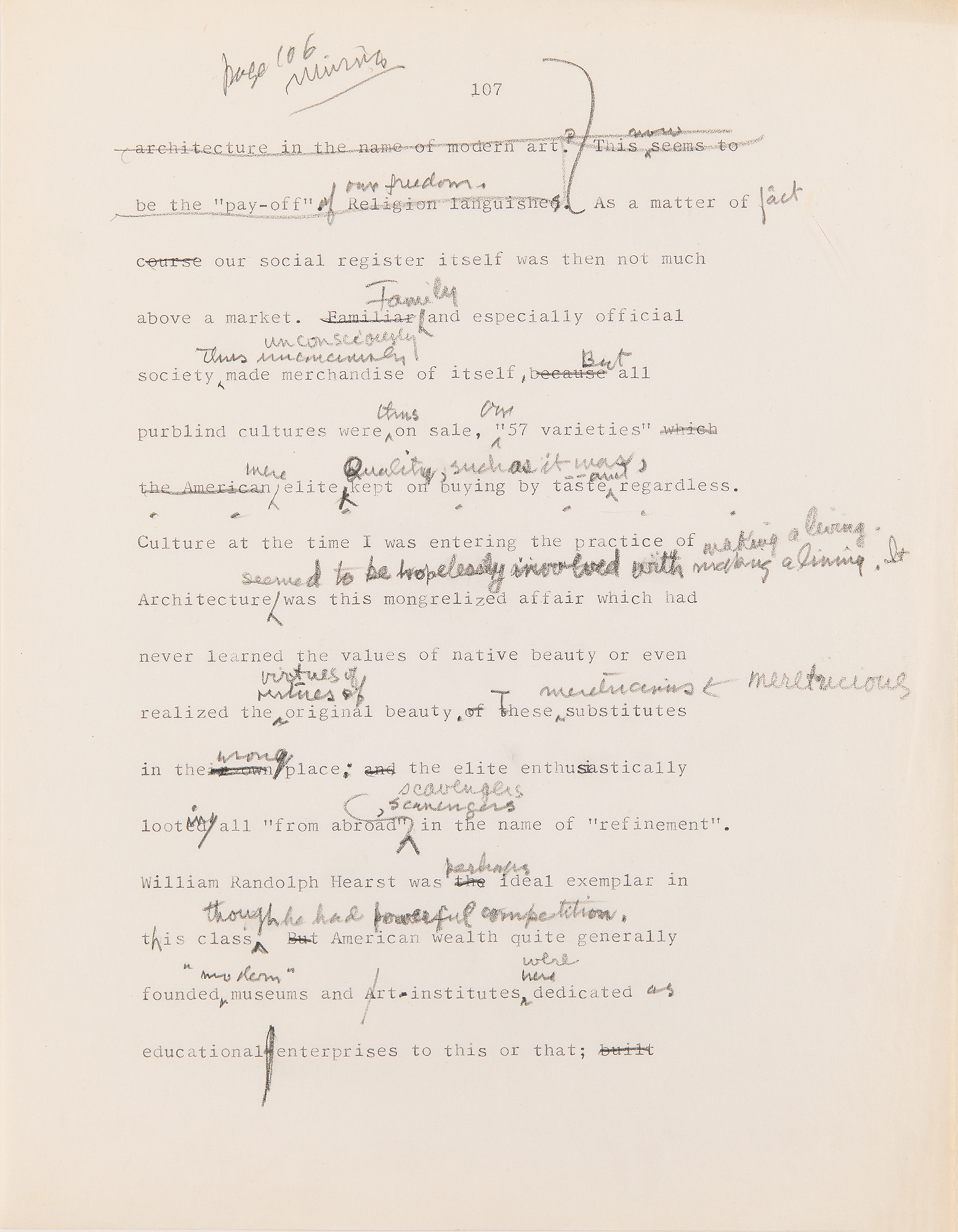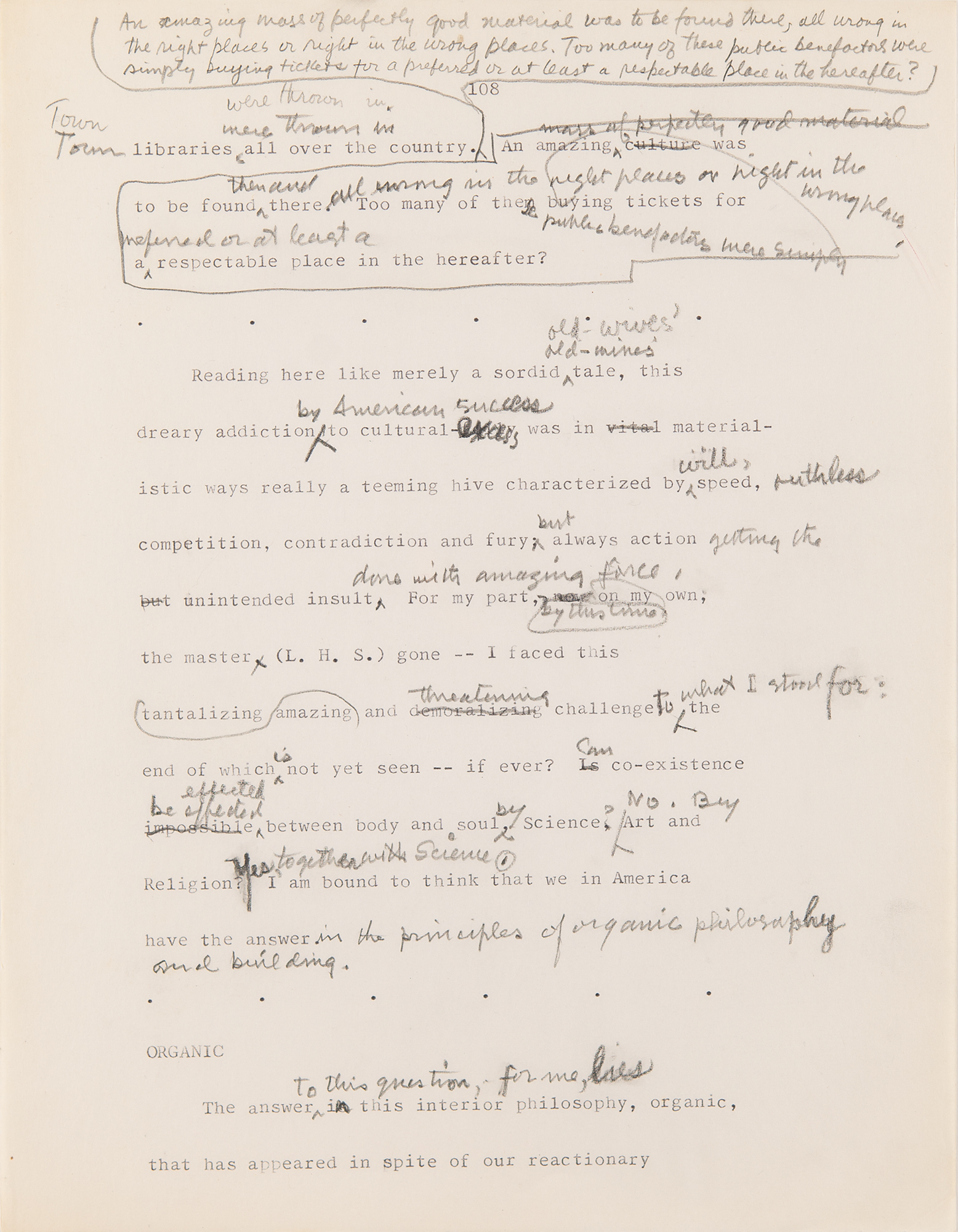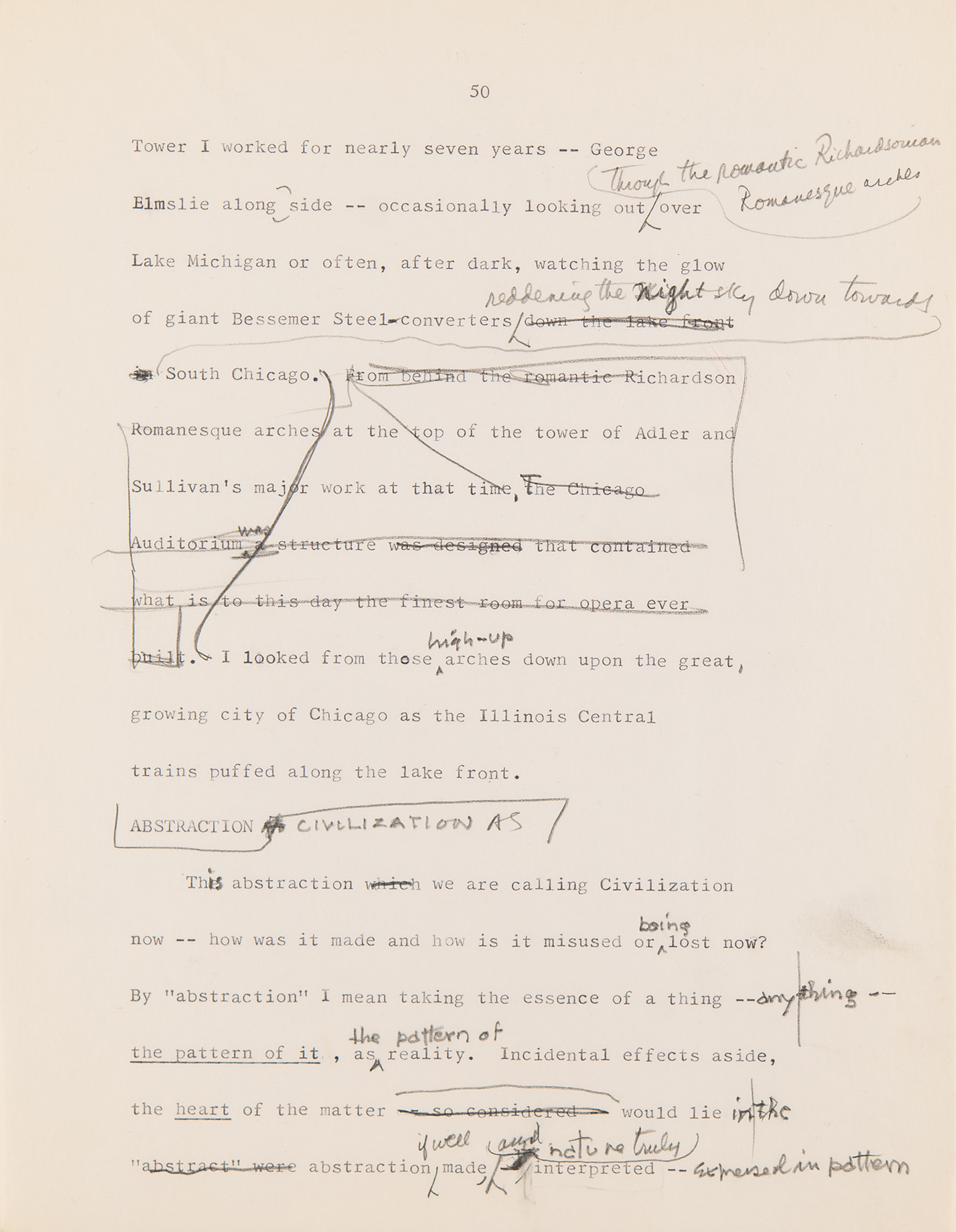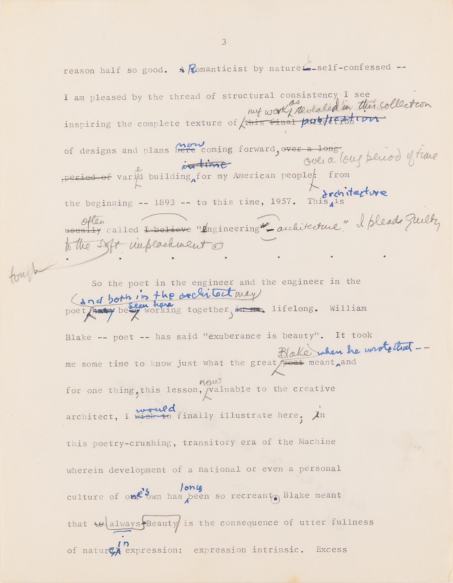 Wright goes on to touch upon some of his artistic influences—William Blake, Victor Hugo, and others—and offers a robust philosophical summation of his architectural career. Hardly a page goes by without major edits and revisions; Wright's are typically made in pencil in his distinctive cursive, while those by editor Ben Raeburn are often printed in blue ink.