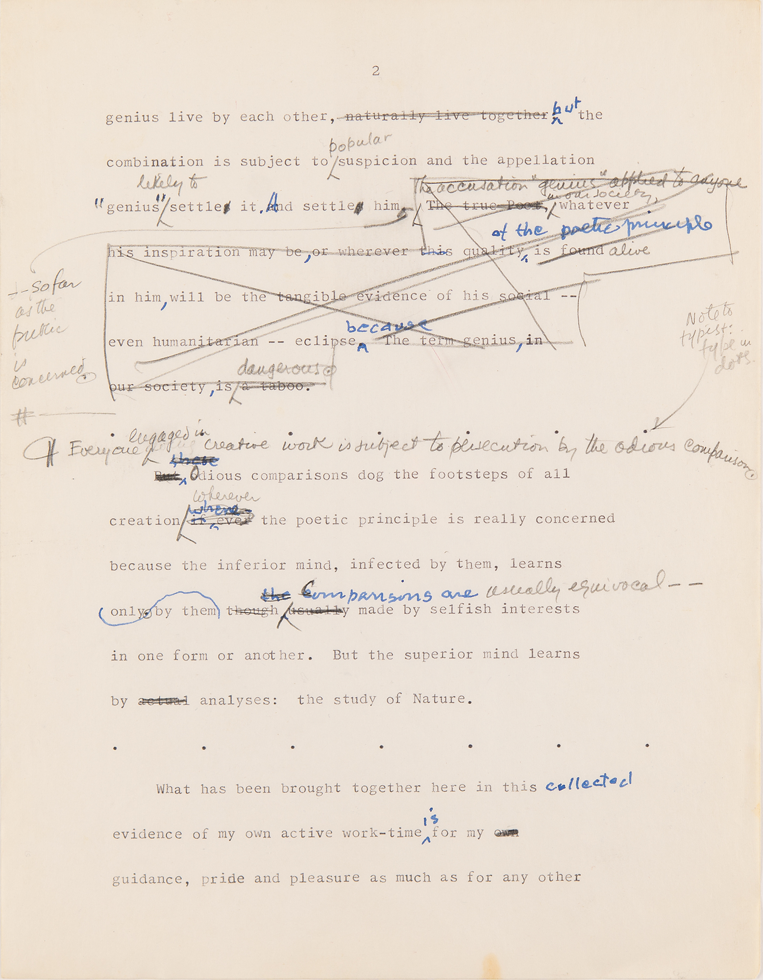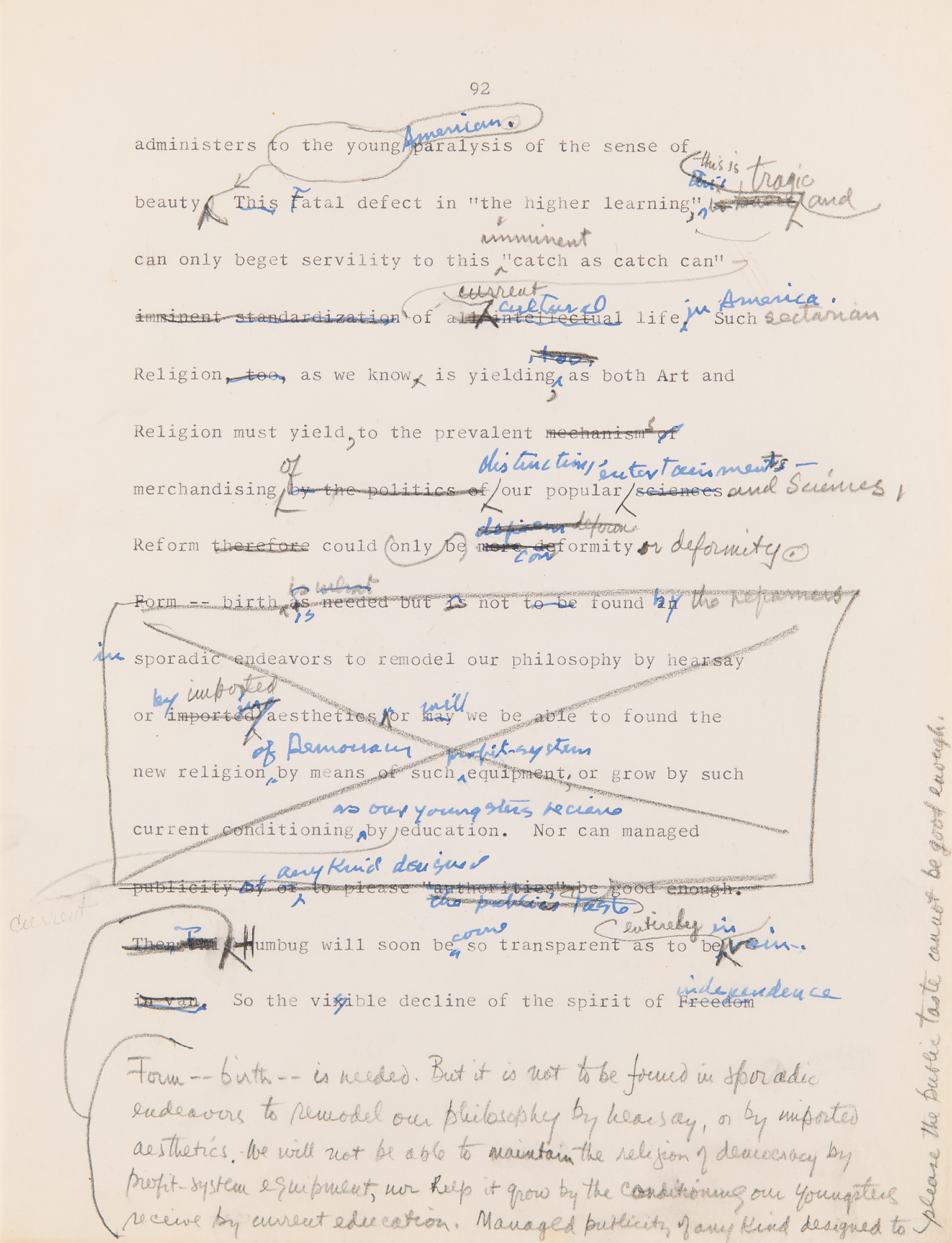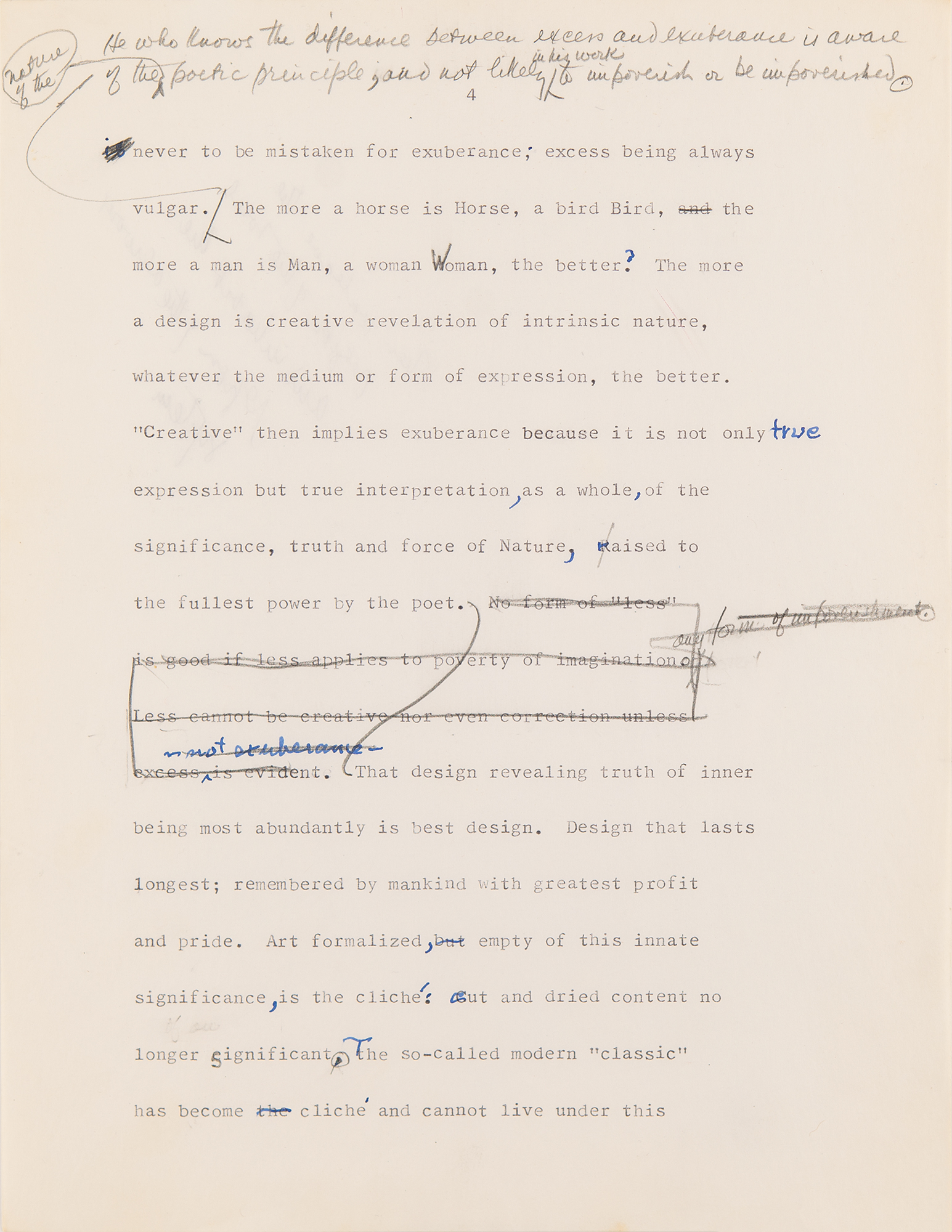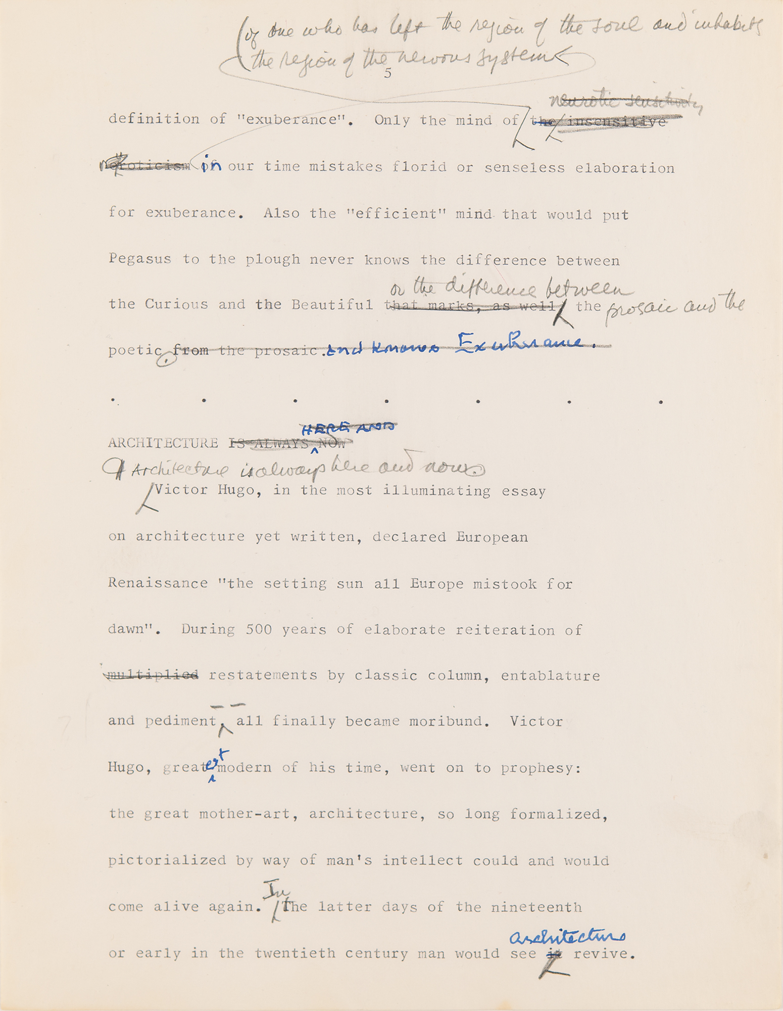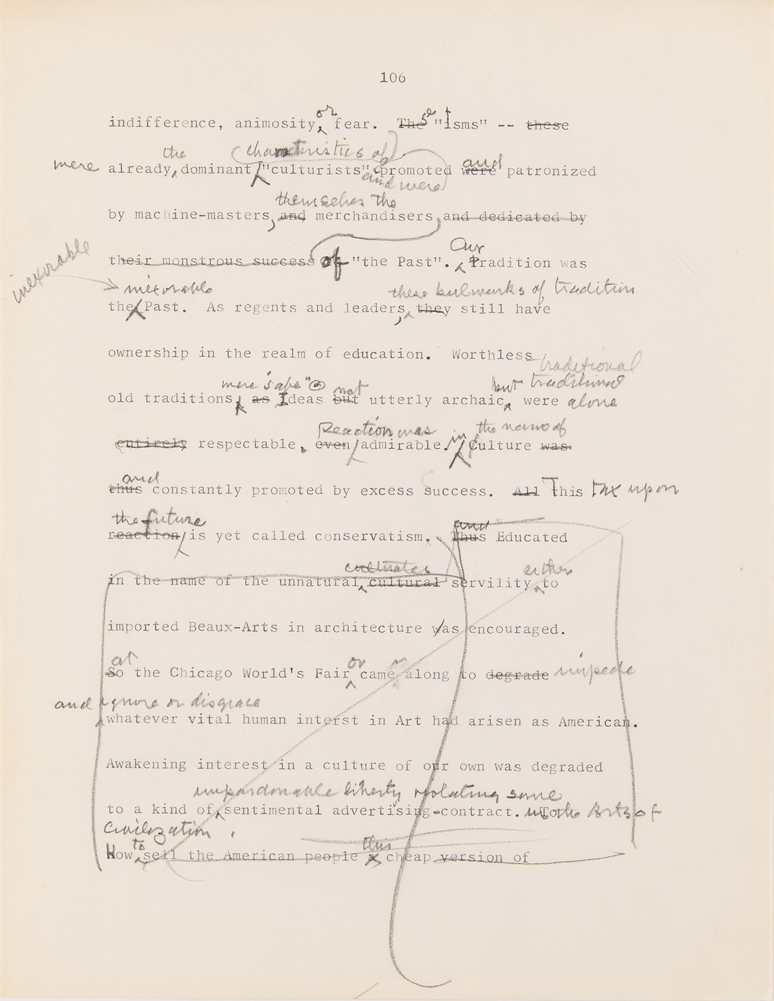 Wright goes on to touch upon some of his artistic influences—William Blake, Victor Hugo, and others—and offers a robust philosophical summation of his architectural career. Hardly a page goes by without major edits and revisions; Wright's are typically made in pencil in his distinctive cursive, while those by editor Ben Raeburn are often printed in blue ink.