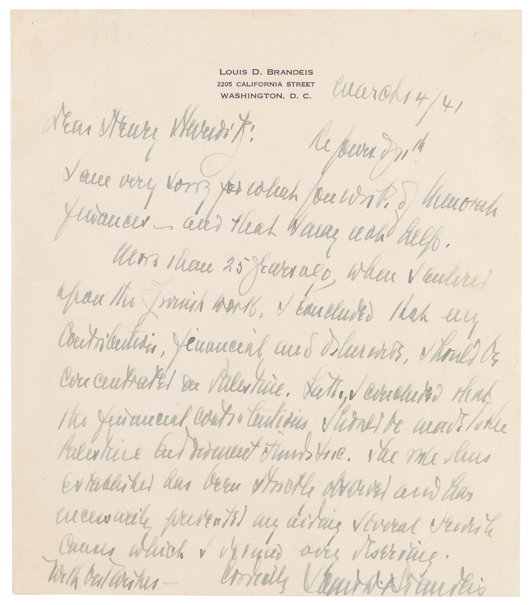Associate justice of the US Supreme Court (1856–1941) from 1916 to 1939, who was the first Jewish justice to serve on the nation's highest bench. ALS signed “Louis D. Brandeis,” one page, 6 x 7, personal letterhead, March 14, 1941. Handwritten letter discussing the cause of Zionism, in part: "More than 25 years ago, when I entered upon the Jewish work, I concluded that my contributions, financial and otherwise, should be concentrated on Palestine. Later I concluded that the financial contributions should be made to the Palestine Endowment Funds Inc." In fine condition. Accompanied by a handsome custom-made half-morocco presentation folder.