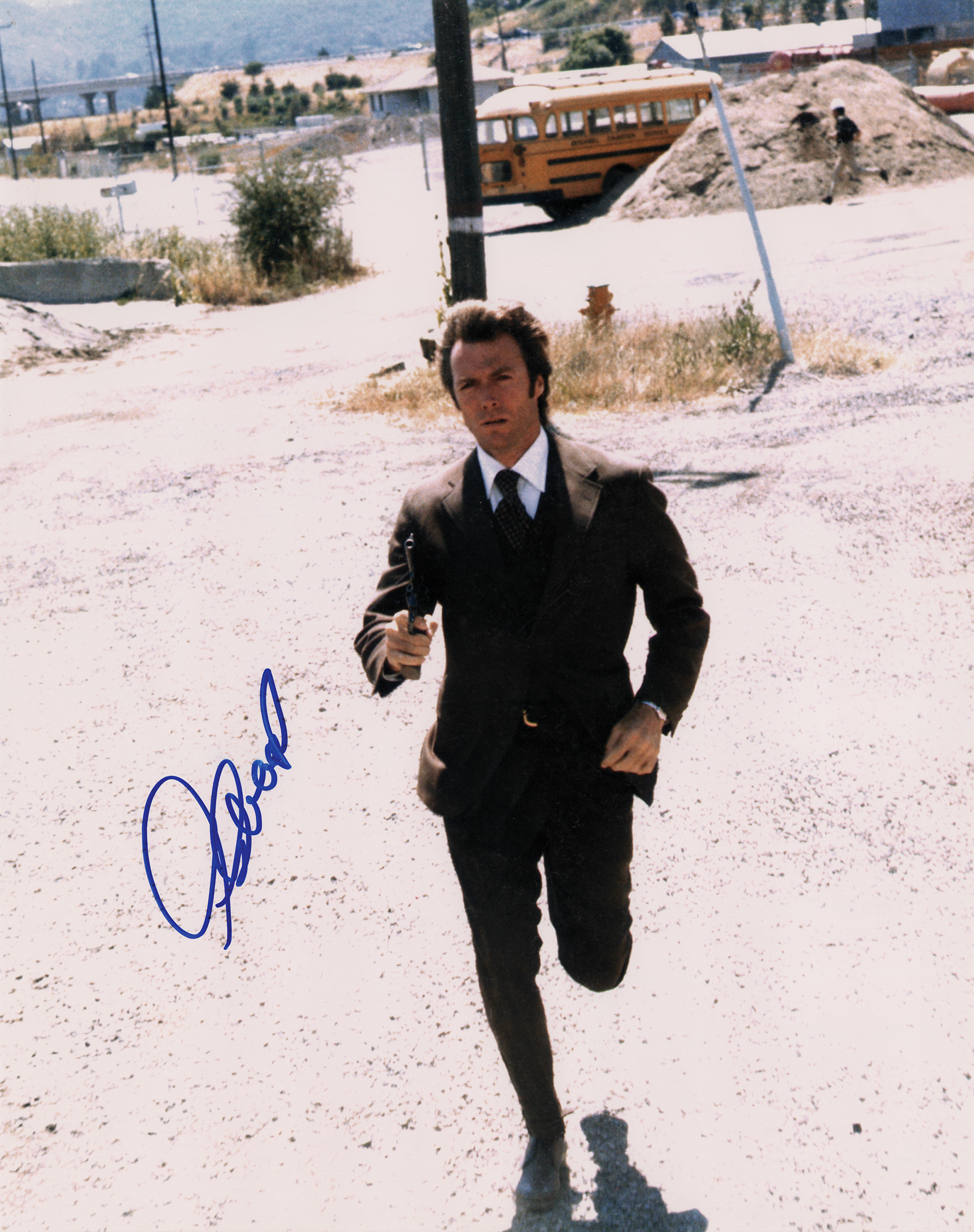 Glossy 11 x 14 full-length photo of Clint Eastwood running with a gun in the 1971 film Dirty Harry, signed in blue felt tip. In very fine condition. Originally obtained by in-person specialist Mike Wehrmann.