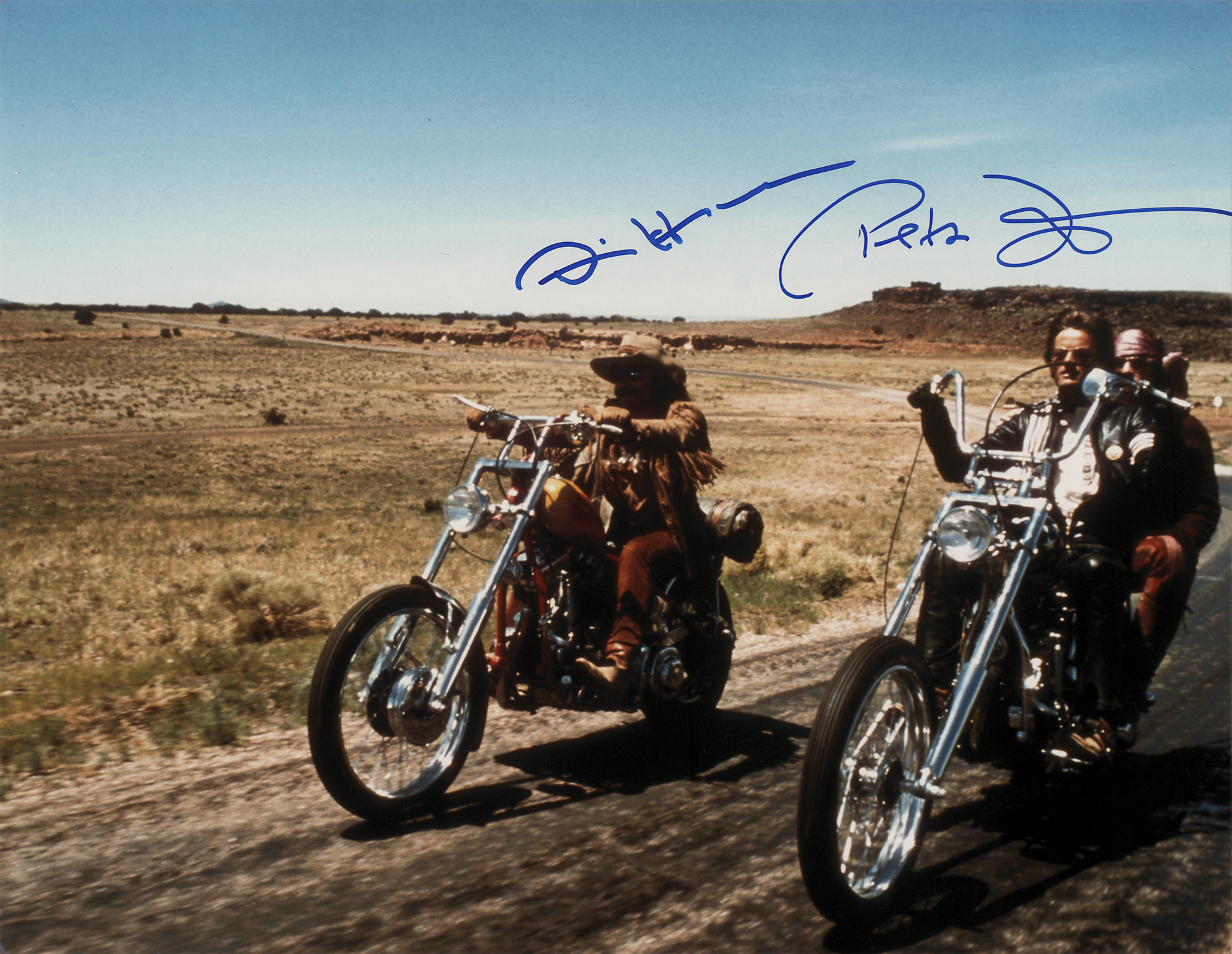 Color satin-finish 14 x 11 photo of Billy and Wyatt cruising on their motorcycles in the 1969 film Easy Rider, signed by Dennis Hopper and Peter Fonda in blue felt tip. In fine condition. Originally obtained by in-person specialist Mike Wehrmann.