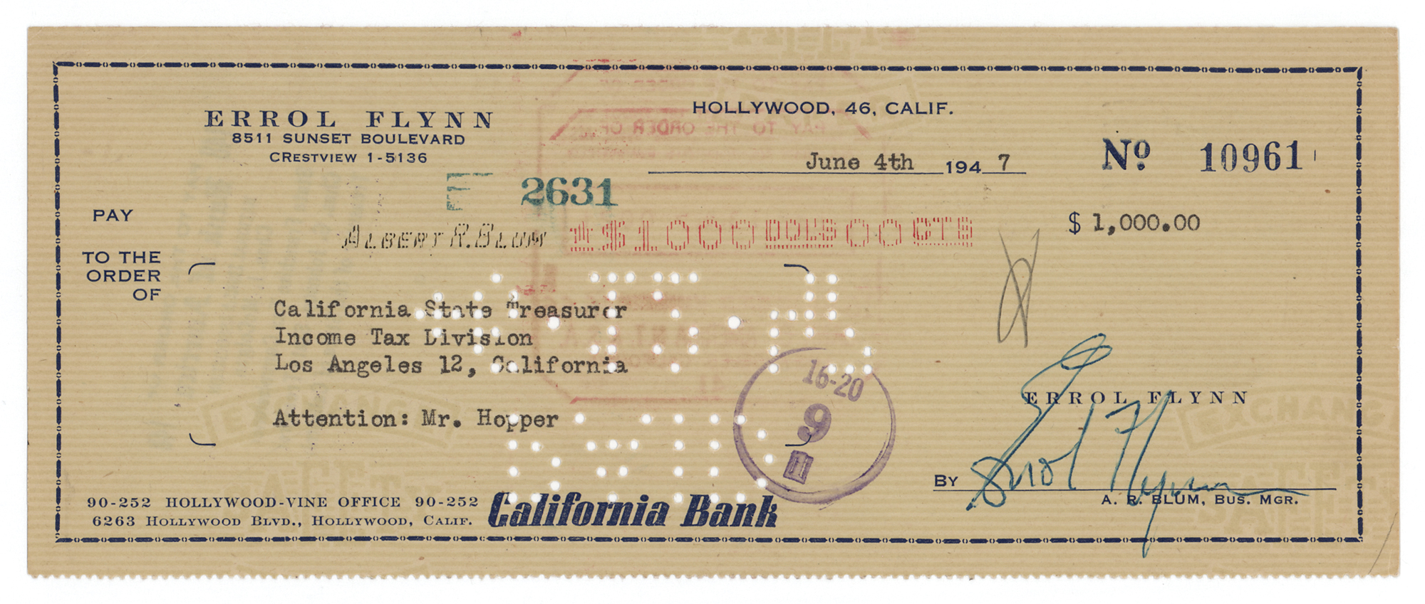 Personal check, 8.25 x 3.25, filled out in type and signed by Flynn, "Errol Flynn," payable to the California State Treasurer for $1000, June 4, 1947. In fine condition.