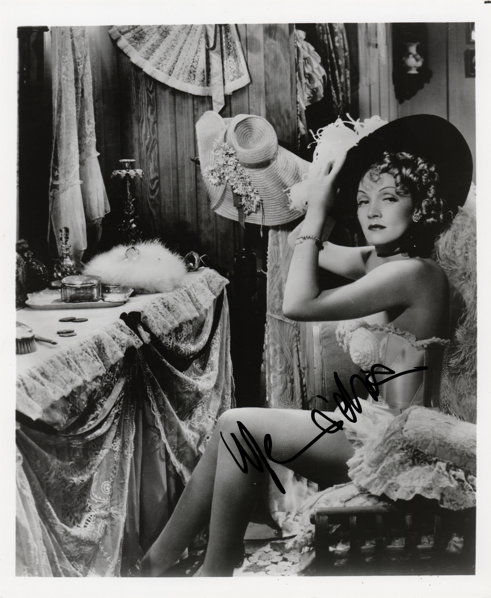 Glossy 8 x 10 photo of Marlene Dietrich getting ready in a dressing room, signed in black felt tip. In very fine condition.