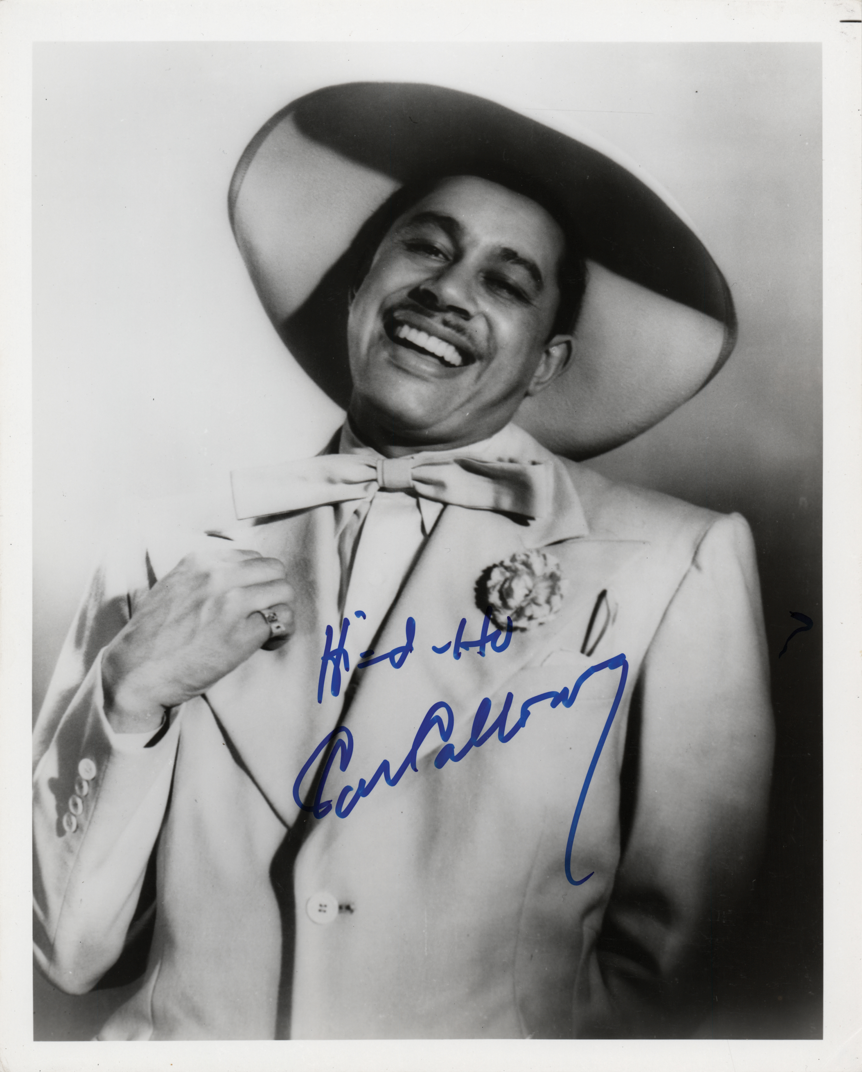 Glossy 8 x 10 photo of Calloway in a hat and bow tie, signed in blue felt tip, "Hi di ho, Cab Calloway.” In fine condition. Originally obtained by in-person specialist Mike Wehrmann.