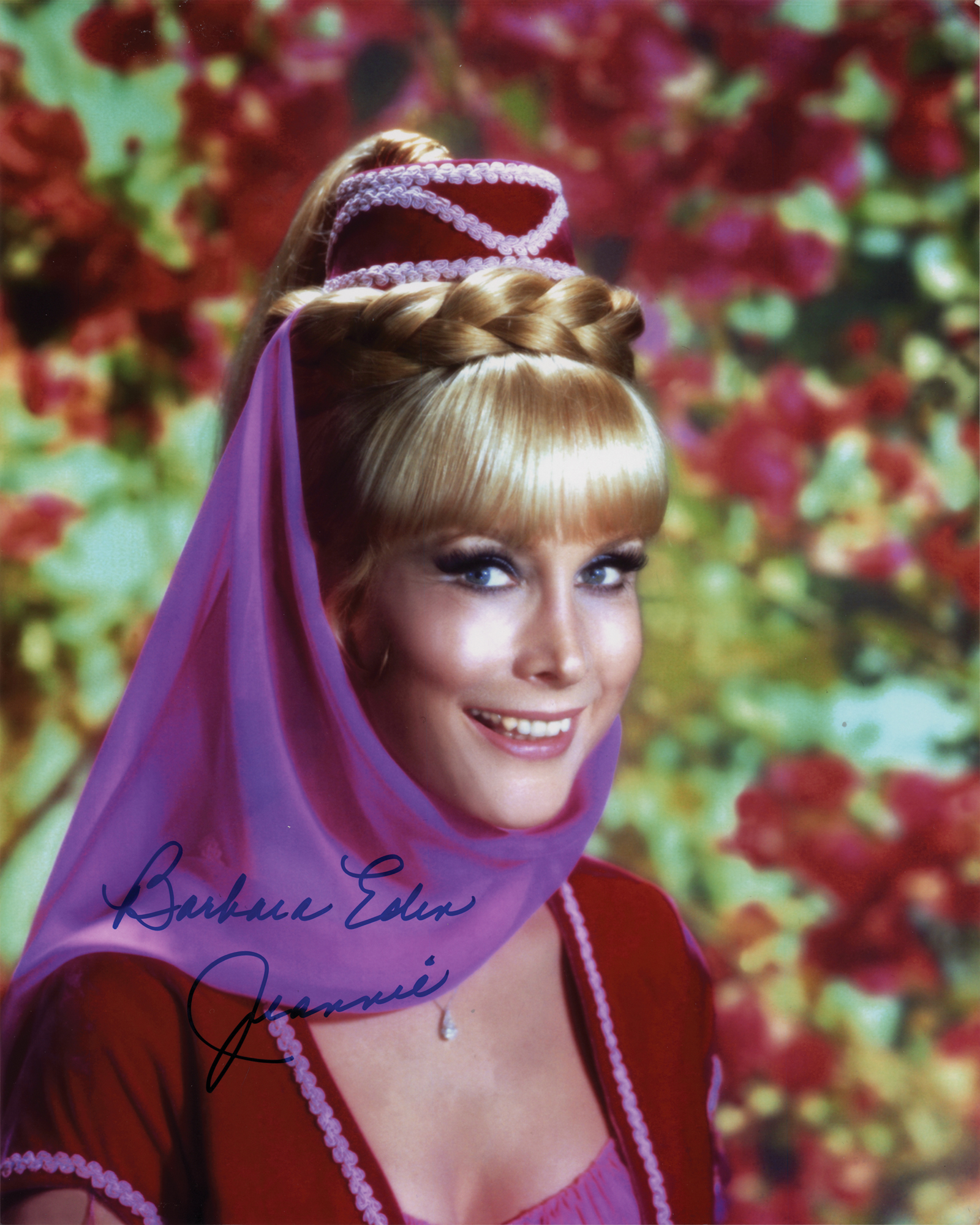 Color glossy 8 x 10 photo of Eden in her starring role in the sitcom I Dream of Jeannie, signed in blue felt tip, "Barbara Eden, Jeannie." In fine condition. Originally obtained by in-person specialist Mike Wehrmann.