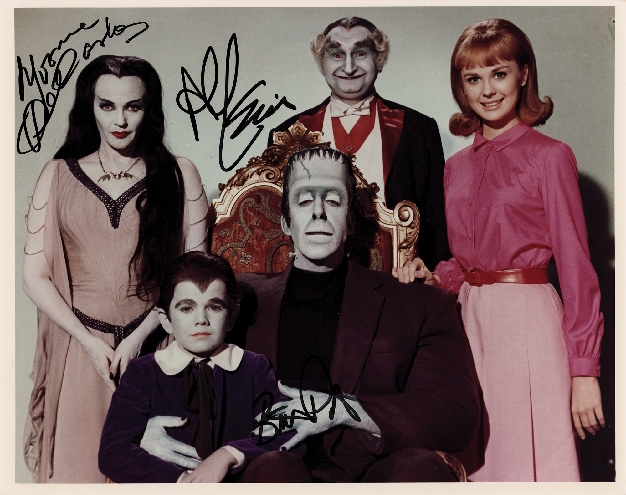 Color glossy 10 x 8 cast photo for The Munsters, signed in black felt tip by Yvonne DeCarlo, Al Lewis, and Butch Patrick. In very fine condition. Originally obtained by in-person specialist Mike Wehrmann.