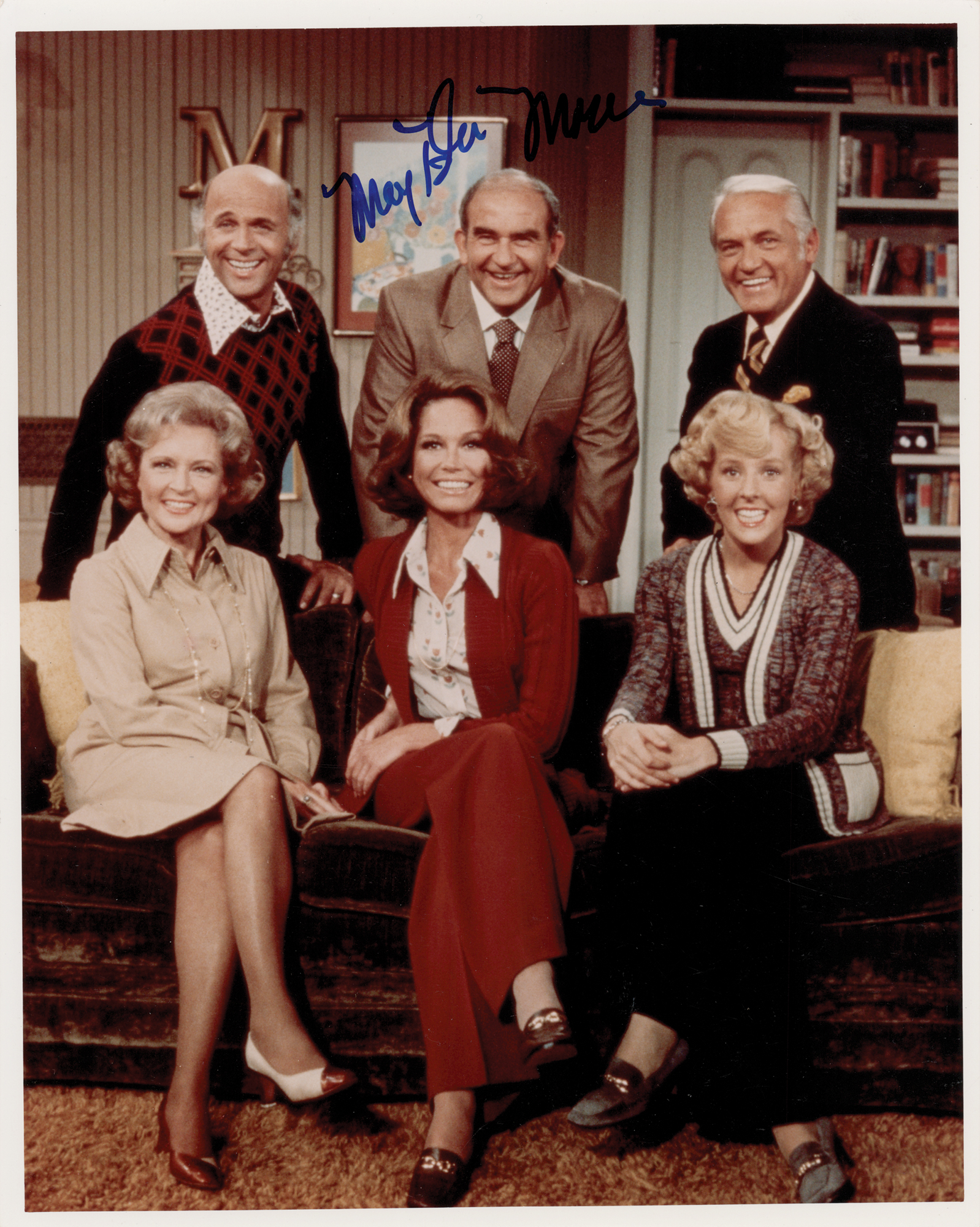 Color glossy 8 x 10 photo of the cast of the Mary Tyler Moore show, signed in blue felt tip by Mary Tyler Moore. In very fine condition. Originally obtained by in-person specialist Mike Wehrmann.