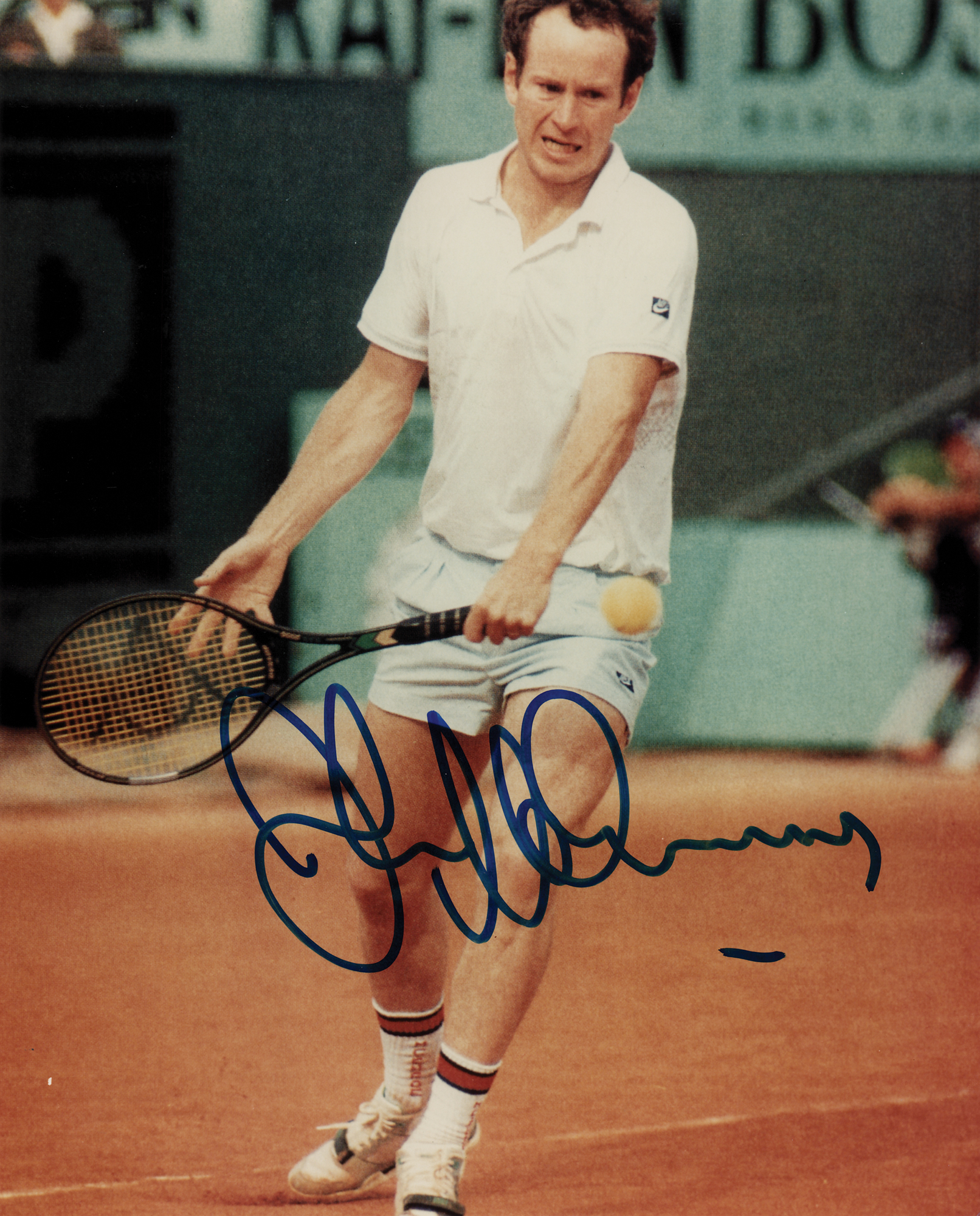 Color glossy 8 x 10 photo of John McEnroe delivering a backhand on the tennis court, signed in blue felt tip. In fine condition. Originally obtained by in-person specialist Mike Wehrmann.