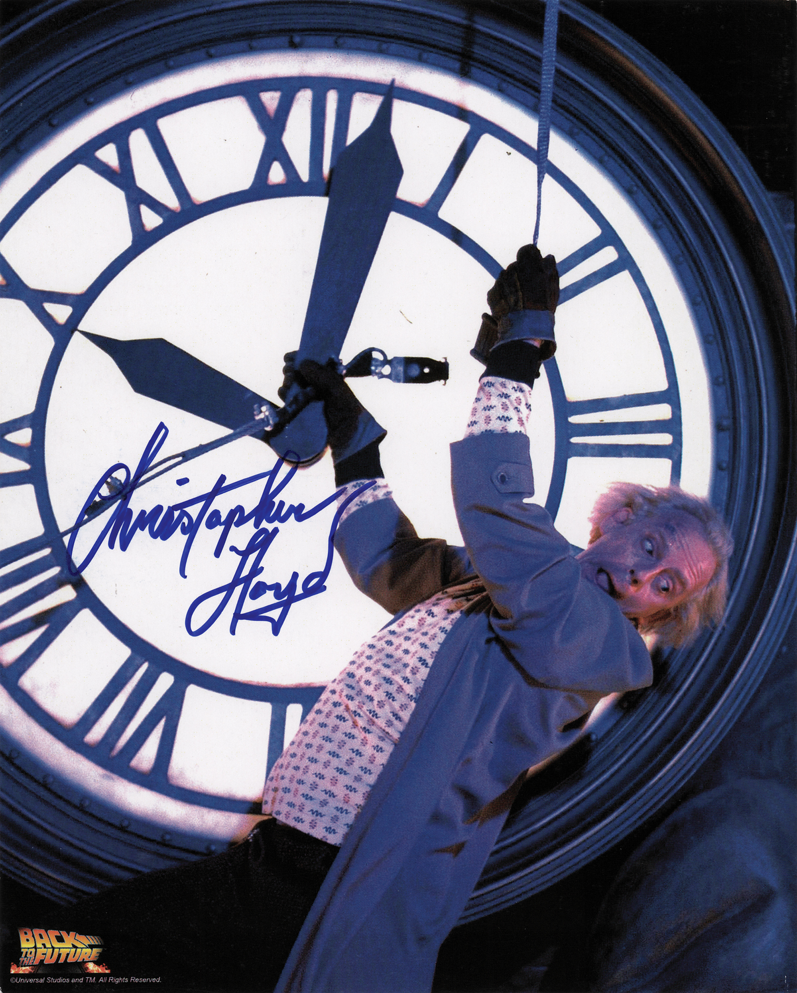 Color semi-glossy 8 x 10 Universal Studios promotional photo for Back to the Future, picturing Christopher Lloyd as Emmett ‘Doc’ Brown hanging from the hands of the clocktower, signed in blue felt tip. In fine condition. Originally obtained by in-person specialist Mike Wehrmann.