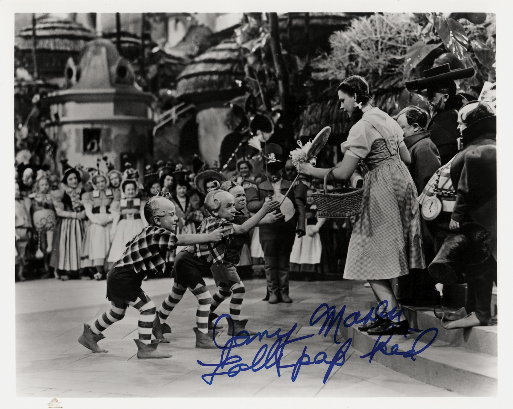 Glossy 10 x 8 photo of the Lollipop Guild welcoming Dorothy to Munchkinland in the classic 1939 musical fantasy The Wizard of Oz, signed in blue felt tip, “Jerry Maren, Lollipop Kid.” In very fine condition. Originally obtained by in-person specialist Mike Wehrmann.