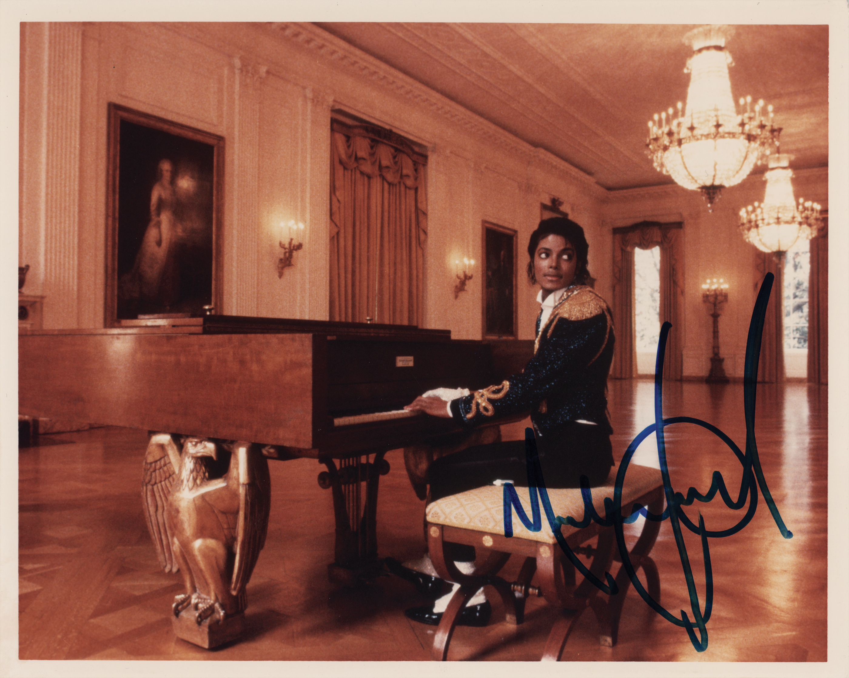 Color glossy 10 x 8 photo of Michael Jackson playing the piano in the White House when he visited the Reagans on May 14, 1984, signed in blue felt tip by the King of Pop. In fine condition. Originally obtained by in-person specialist Mike Wehrmann.