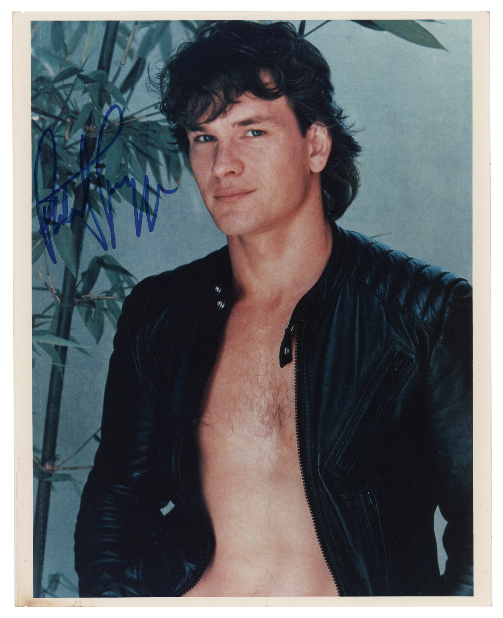 Color glossy 8 x 10 half-length photo of Patrick Swayze wearing an open leather jacket during a modeling shoot, signed in blue felt tip. In fine condition. Originally obtained by in-person specialist Mike Wehrmann.
