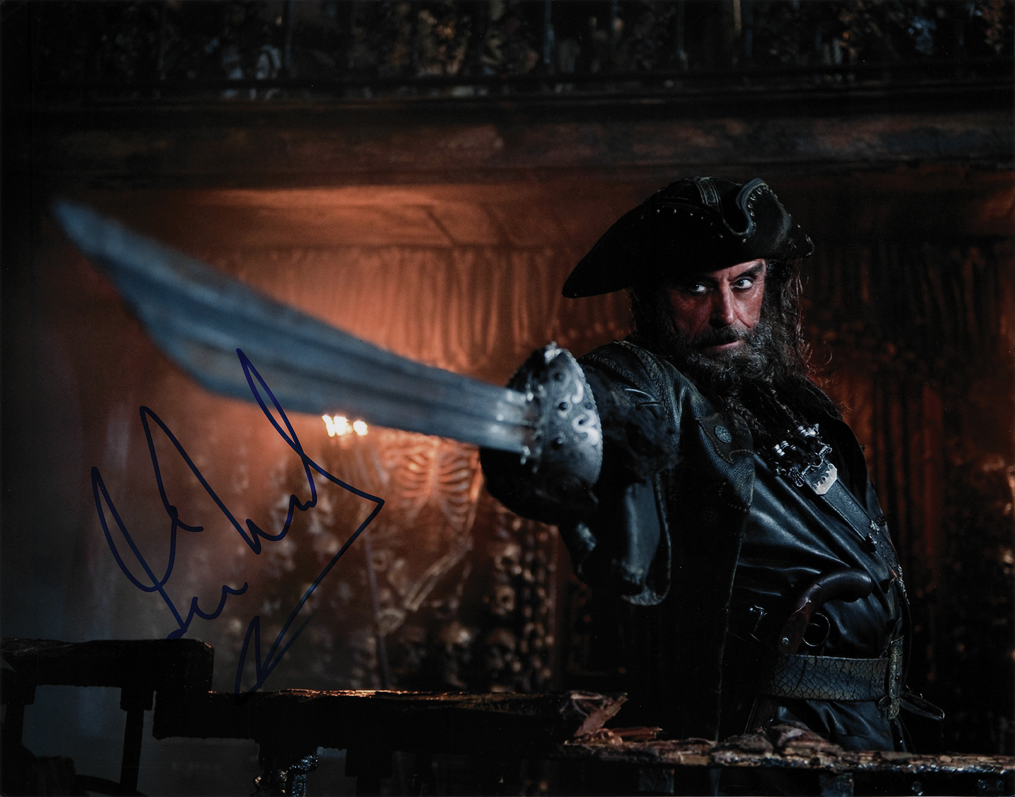 Color satin-finish 11 x 14 photo of Ian McShane as Blackbeard in Pirates of the Caribbean: On Stranger Tides, signed in blue felt tip. In very fine condition. Originally obtained by in-person specialist Mike Wehrmann.