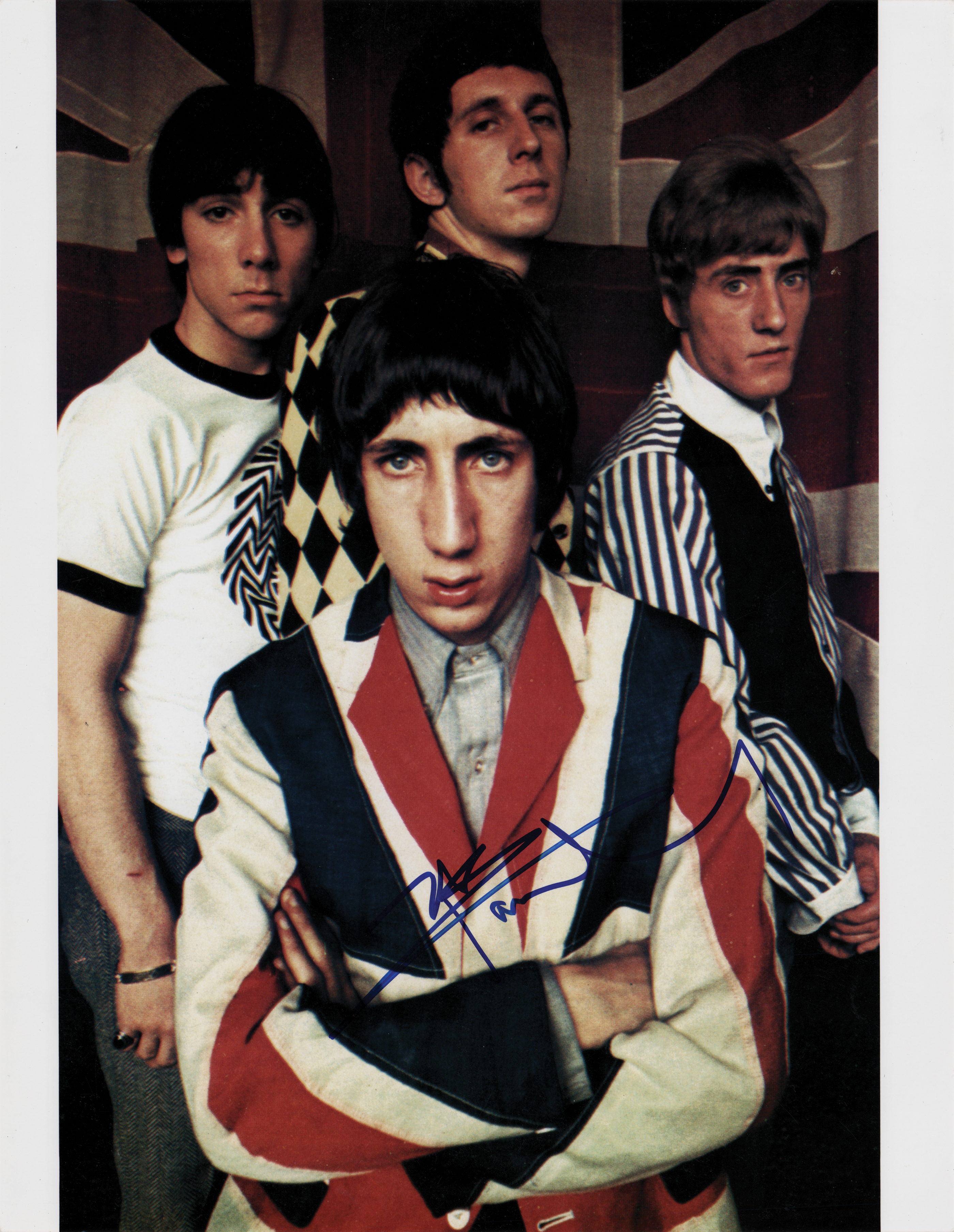 Color glossy 11 x 14 photo of The Who early in their career, signed in blue felt tip by Pete Townshend. In fine condition. Originally obtained by in-person specialist Mike Wehrmann.