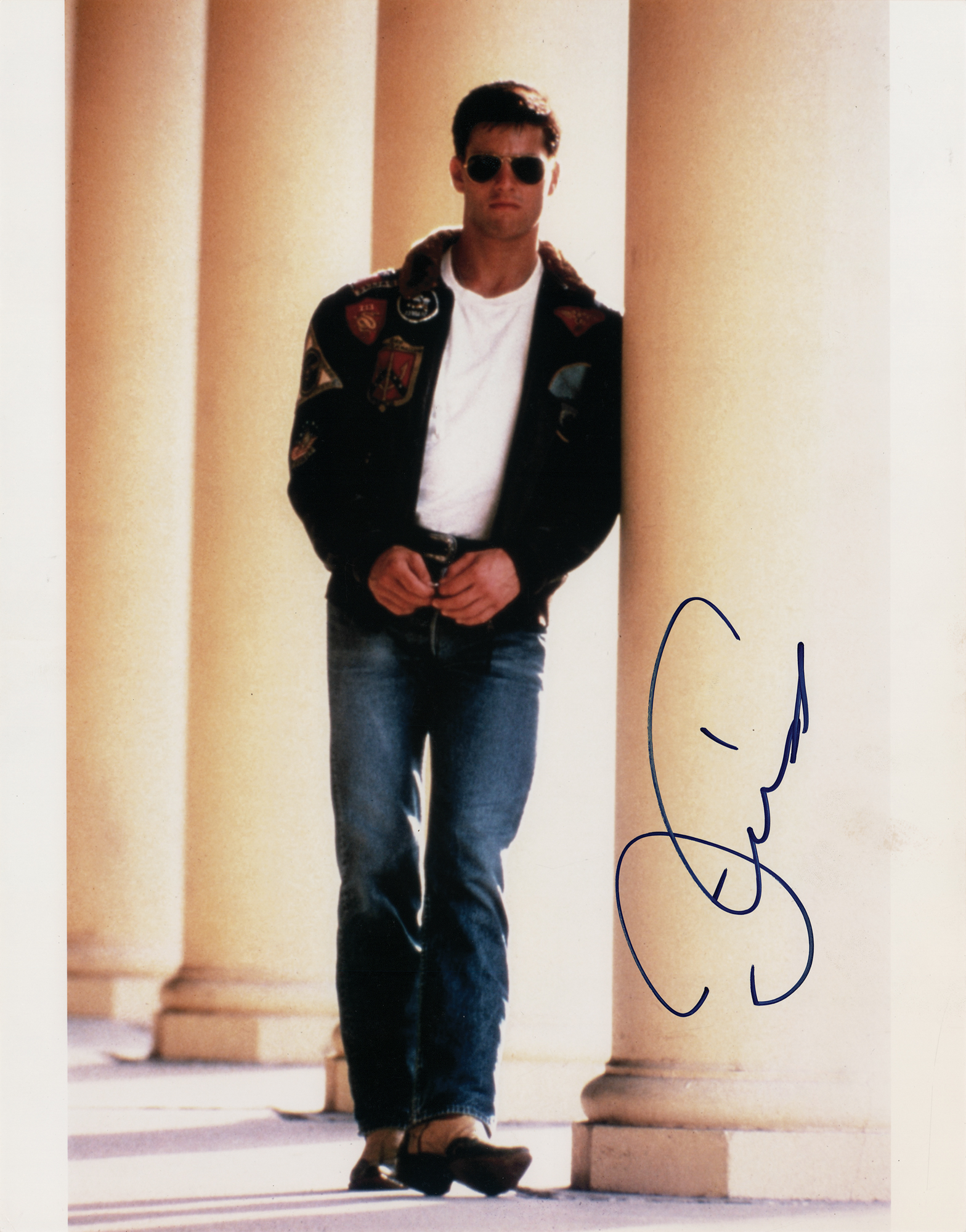 Color satin-finish 11 x 14 photo of Tom Cruise as Pete ‘Maverick’ Mitchell in the 1986 film Top Gun, signed in blue felt tip. In fine condition, with scattered small surface creases. Originally obtained by in-person specialist Mike Wehrmann.