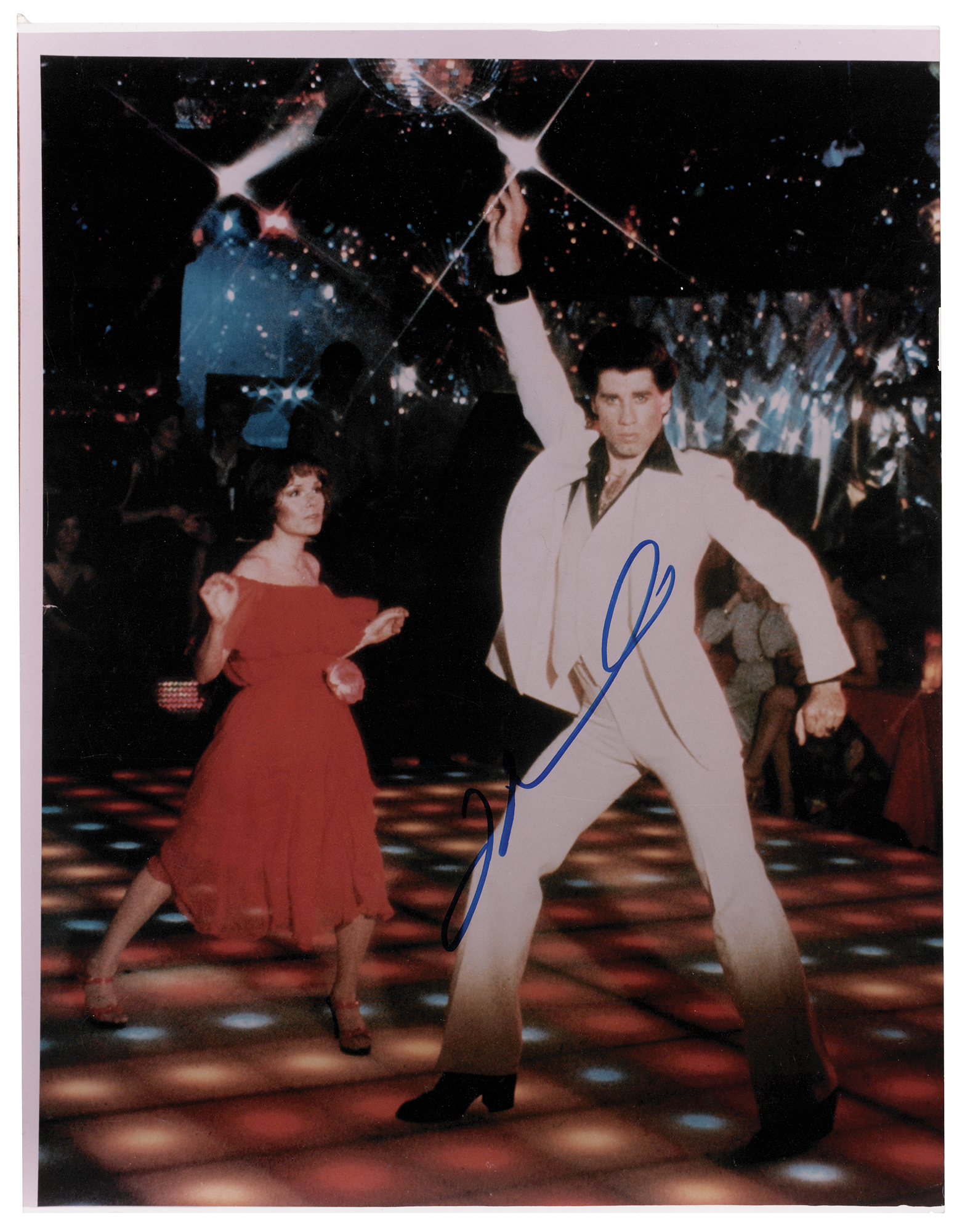 Color satin-finish 11 x 14 photo of John Travolta as Tony Manero in Saturday Night Fever, signed in blue felt tip. In fine condition, with scattered small surface creases. Originally obtained by in-person specialist Mike Wehrmann.