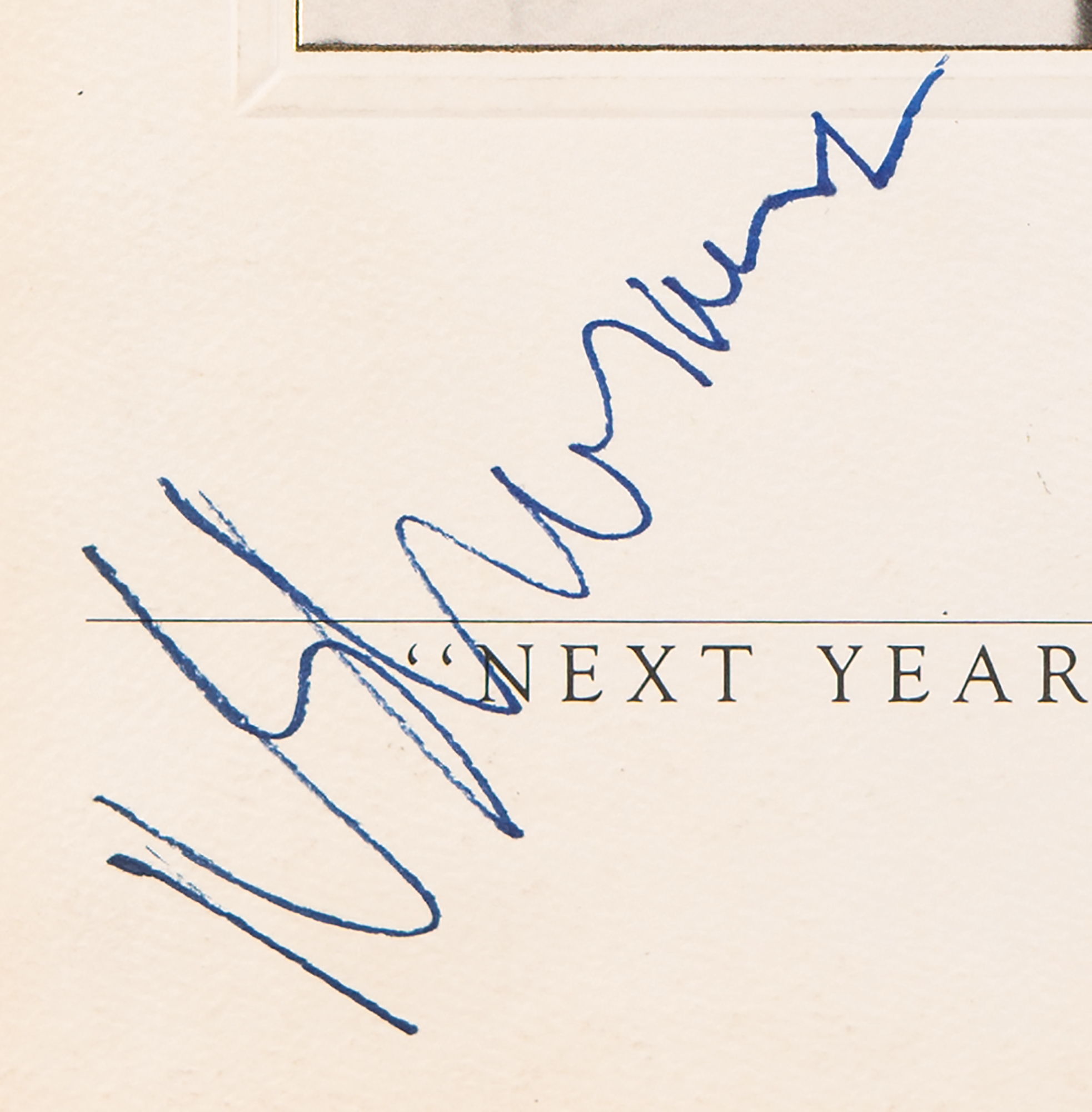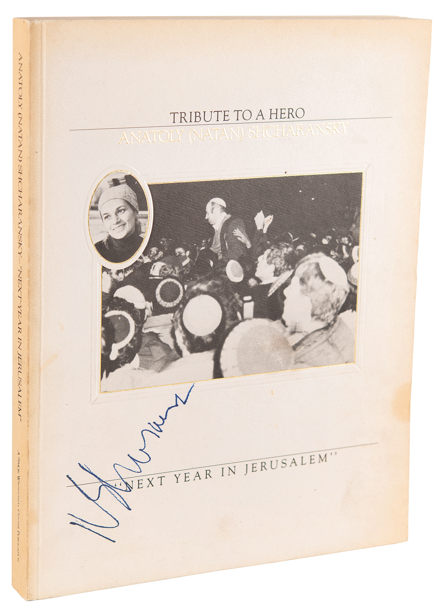 Israeli politician, human rights activist, and author (born 1948) who currently serves as Chairman for the Institute for the Study of Global Antisemitism and Policy. Signed book: Next Year in Jerusalem. First edition. Los Angeles, CA: Simon Wiesenthal, 1987. Paperback, 8.5 x 11. on the front cover in blue ink by Natan Sharansky. In very good to fine condition, with sunning to the spine, and edge toning and a stain to the front cover. Originally obtained by in-person specialist Mike Wehrmann.