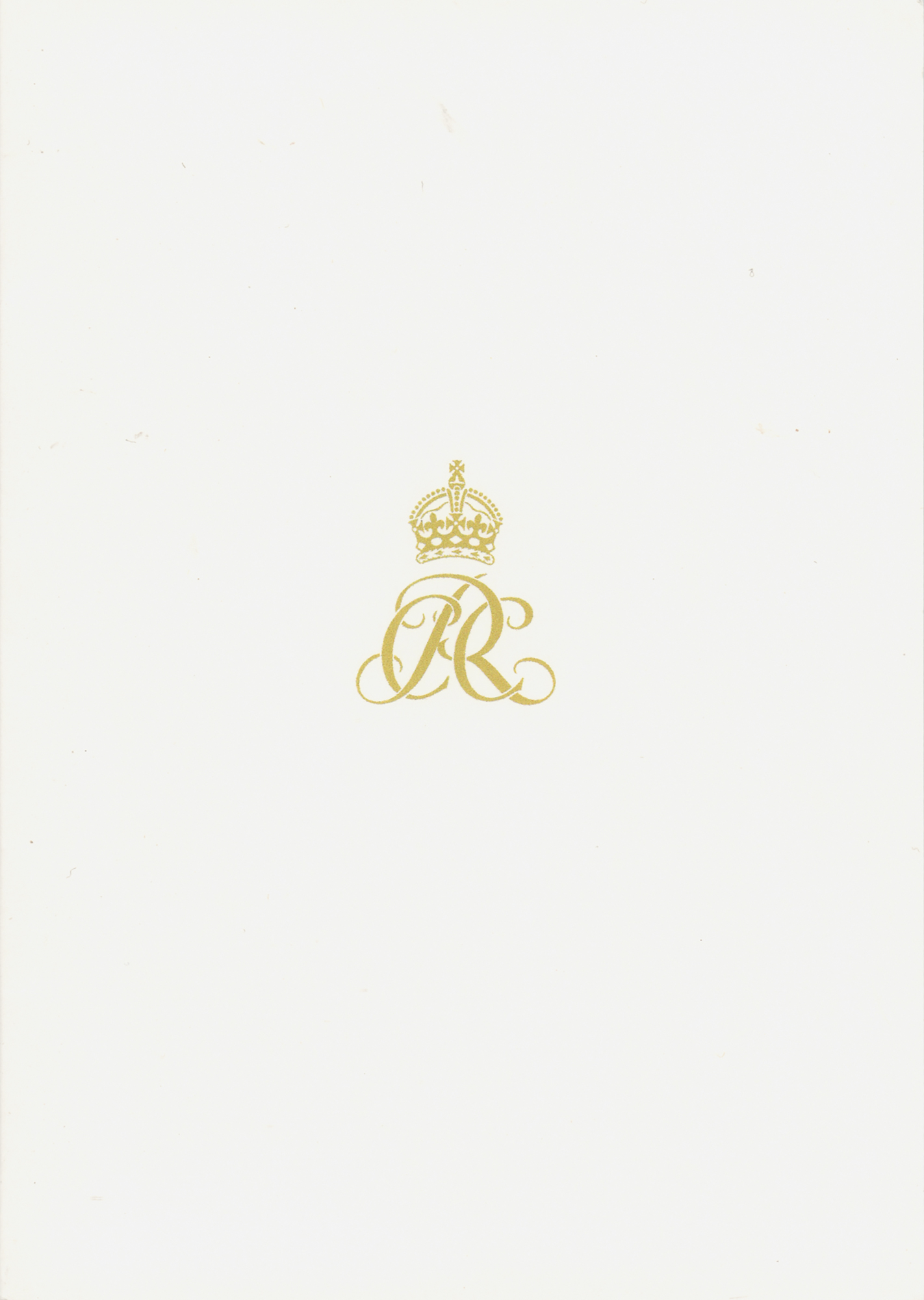 Royal coronation card with a golden crown and monogram on the front, measuring 8.25 x 5.75 open, the inside featuring a color coronation portrait and printed message, neatly signed and inscribed in black felt tip, "Dear Thomas, Best wishes, Camilla R." The message reads: "Thank you so much for your very kind message sent for the first anniversary of our Coronation. It was greatly appreciated by us both." In very fine condition.