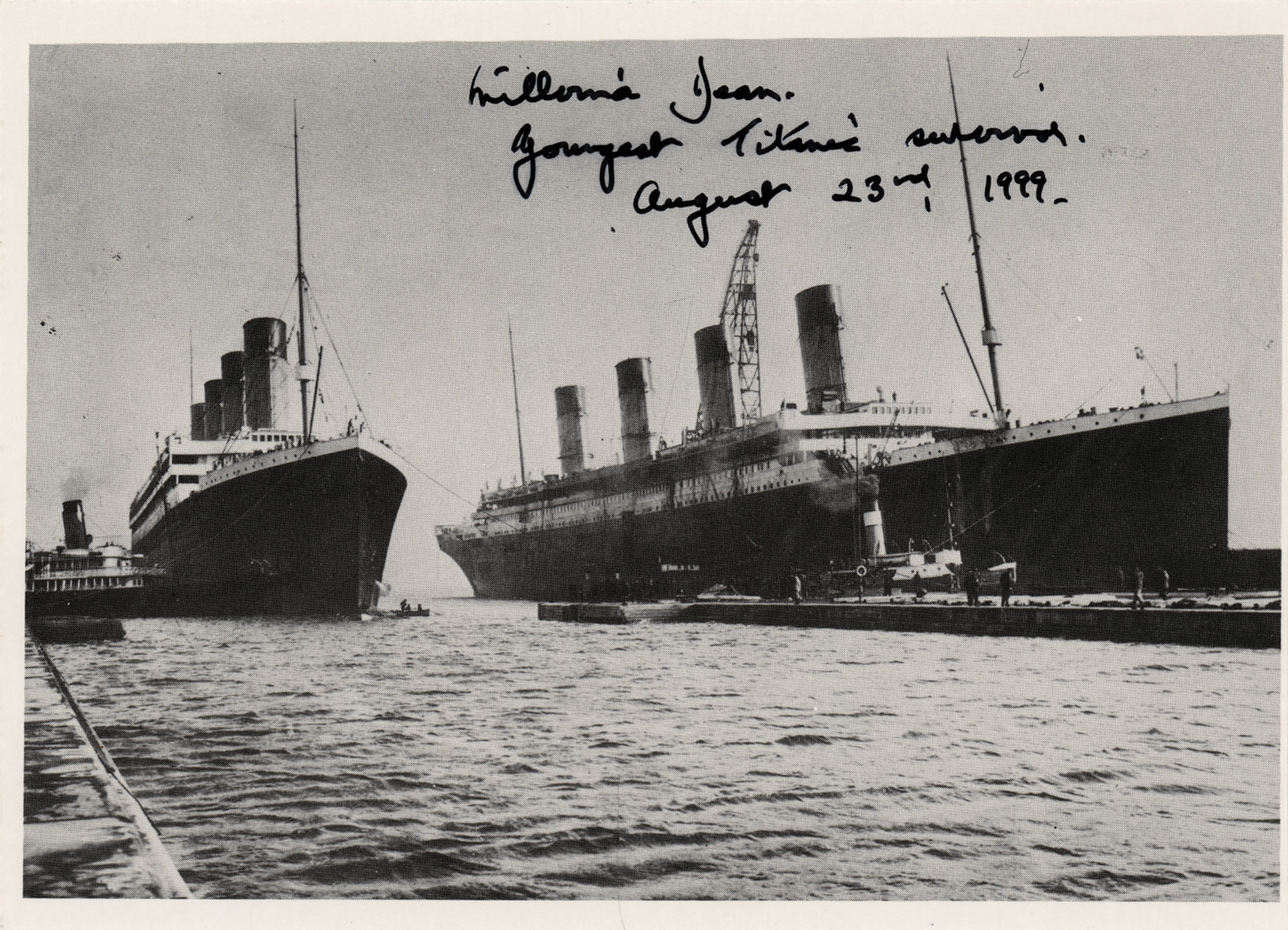 Semi-glossy 6 x 4.25 postcard photo of the Titanic with its sister ship, the Olympic, signed in black felt tip, "Millvina Dean, Youngest Titanic Survivor, August 23rd, 1999." In very fine condition.