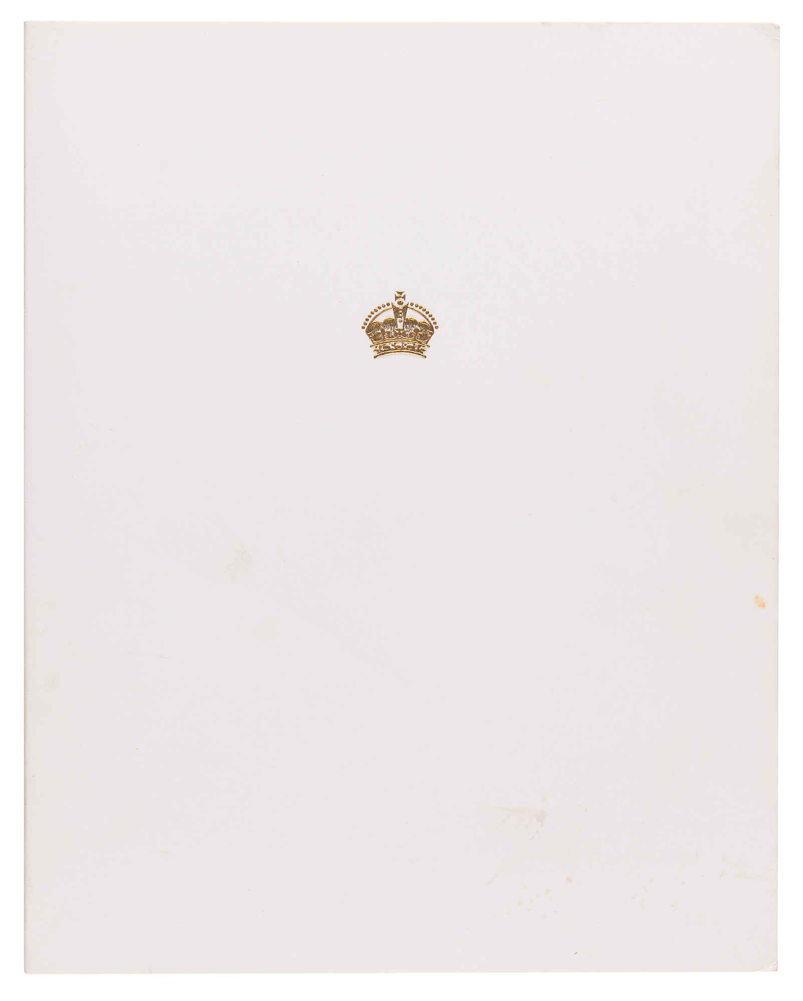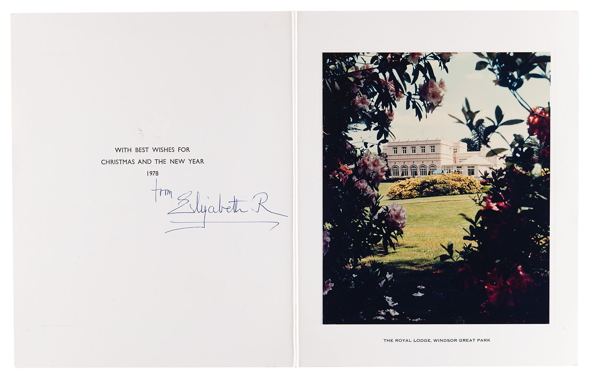 Christmas card from 1978 with an embossed crown on the front, measuring 14.5 x 9.25 open, the inside featuring a color photograph of the Royal Lodge, Windsor Great Park, signed on the adjacent page below the preprinted sentiment in blue ballpoint, "from, Elizabeth R." In fine condition.