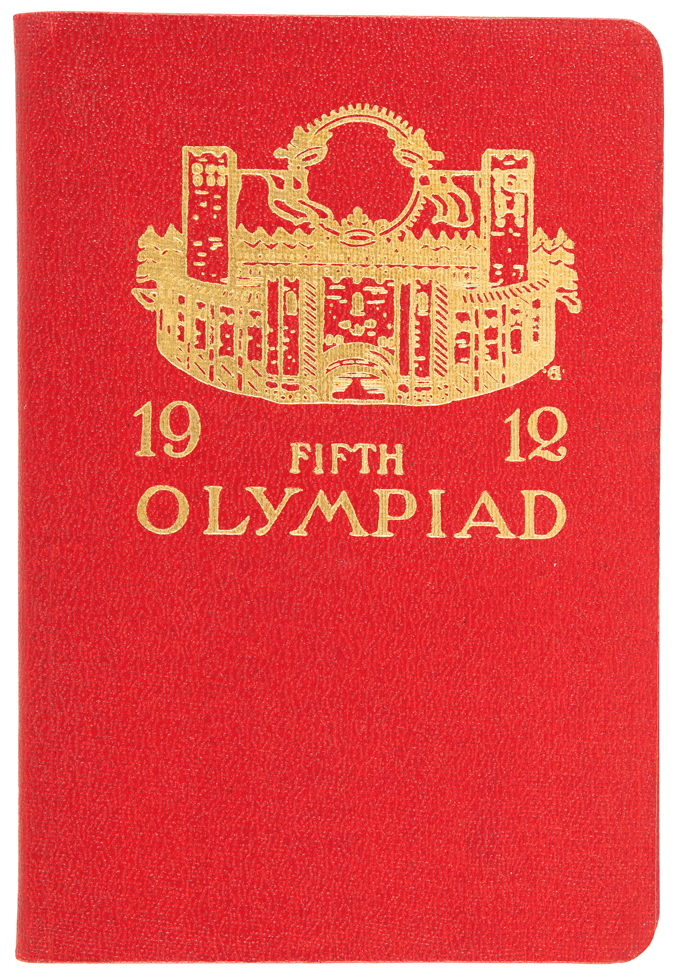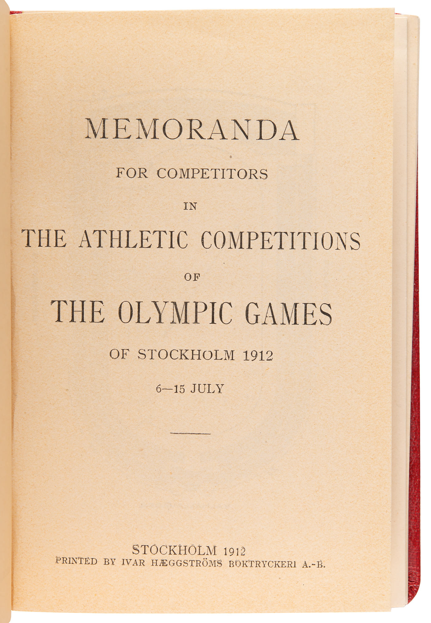 English-language pocket-sized booklet entitled "Memoranda for Competitors in the Athletic Competitions of the Olympic Games of Stockholm 1912, 6–15 July," 3 x 4.5, 50 pages, bound in stiff red linen wrappers with an attractive gilt design on the cover. The booklet offers extensive information for all athletics participants, documenting the organization and rules of the various athletics contests. In fine condition.