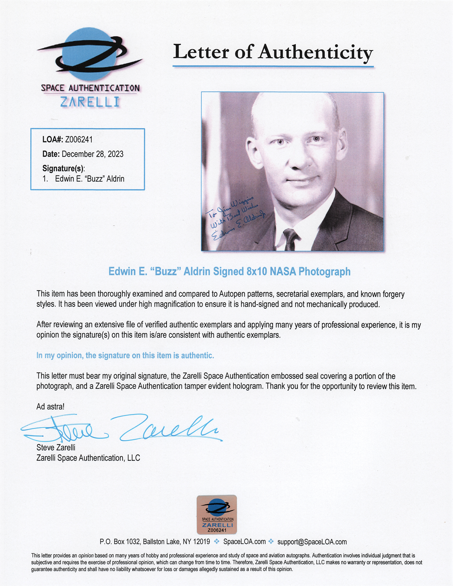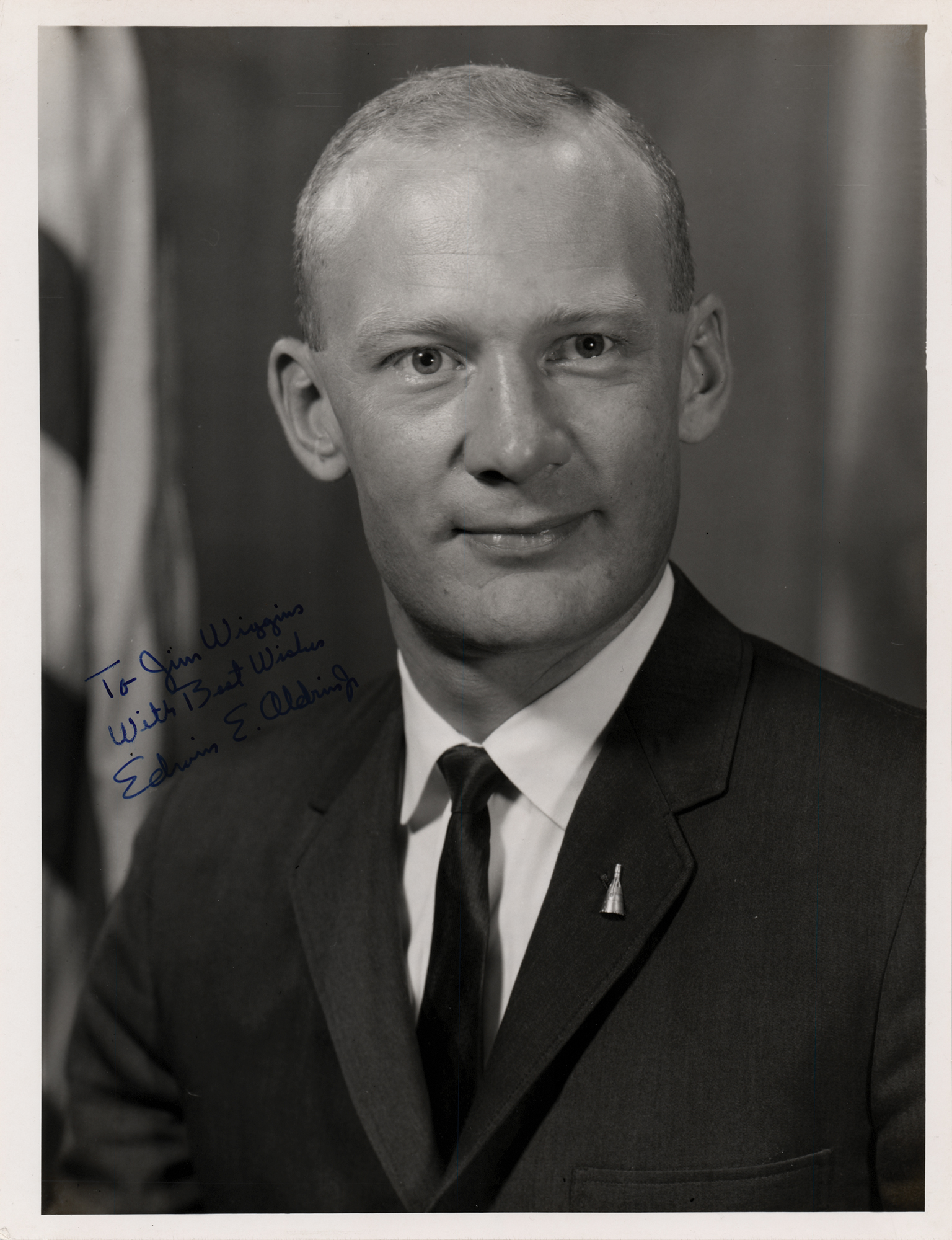 Excellent vintage official glossy 7.75 x 10 NASA press photo of Buzz Aldrin in a suit and tie, neatly signed and inscribed in fountain pen, "To Jim Wiggins, With Best Wishes, Edwin E. Aldrin, Jr.” Reverse bears purple NASA caption text. In fine condition. Accompanied by a full letter of authenticity from Zarelli Space Authentication.
