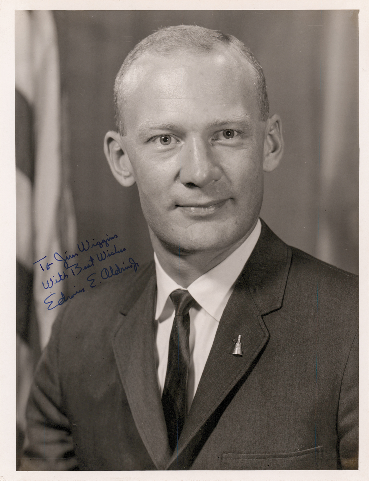 Excellent vintage official glossy 7.75 x 10 NASA press photo of Buzz Aldrin in a suit and tie, neatly signed and inscribed in fountain pen, "To Jim Wiggins, With Best Wishes, Edwin E. Aldrin, Jr.” Reverse bears purple NASA caption text. In fine condition. Accompanied by a full letter of authenticity from Zarelli Space Authentication.
