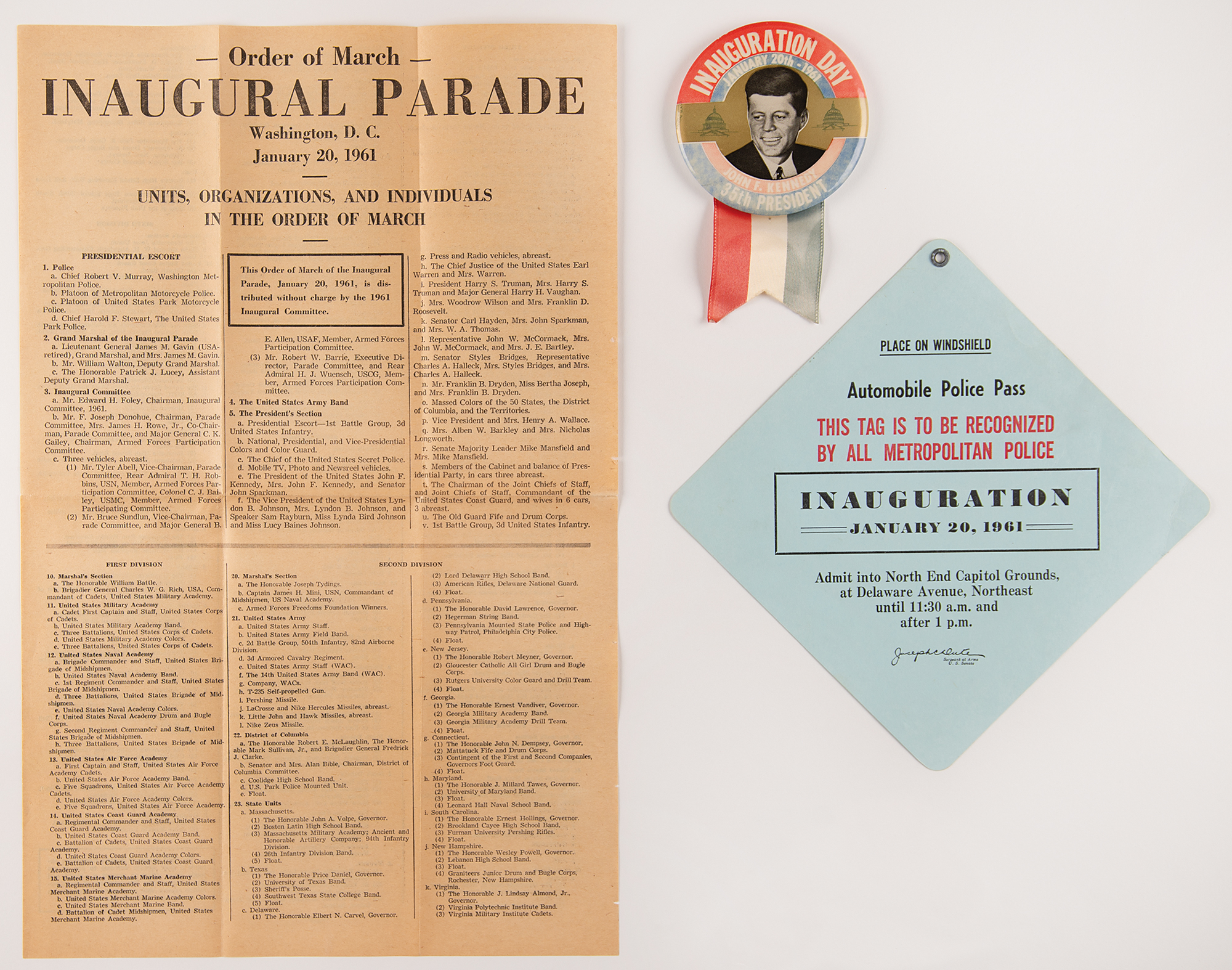 Three pieces of ephemera from John F. Kennedy's inauguration on January 20, 1961, including: a 7 x 7 "Automobile Police Pass" to be displayed on a vehicle's windshield, allowing admission "into North End Capitol Grounds" during the "Inauguration, January 20, 1961"; a 3.5˝ pinback button honoring "Inauguration Day, January 20th - 1961," portraying John F. Kennedy as the 35th president, with patriotic ribbon affixed below; and a double-sided 10.75 x 16.75 leaflet headed "Order of March, Inaugural Parade, Washington, D.C., January 20, 1961," printed for distribution by the Inaugural Committee. In overall fine condition, with fading to the button.