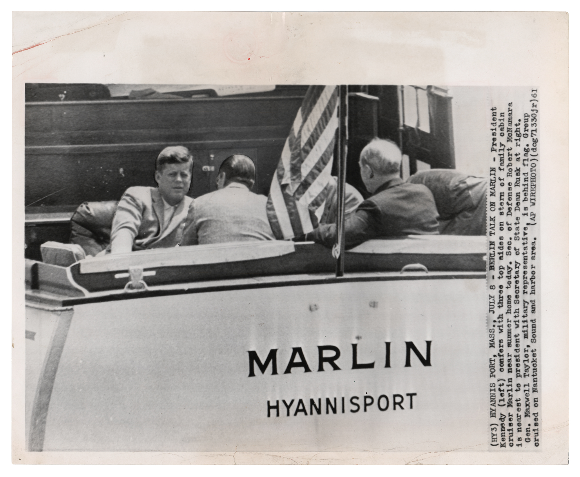 Original vintage glossy 10 x 8 AP wirephoto of President John F. Kennedy on board the family yacht 'Marlin' near Hyannisport in July 1961, captioned: "President Kennedy…confers with three top aides en stern of family cabin cruiser Marlin…Sec. of Defense Robert McNarmara is nearest to president with Secretary of State Dean Rusk at right. Gen. Maxwell Taylor, military representative, is behind flag." Reverse bears an affixed newspaper clipping, stamp-dated June 9, 1961. In very good to fine condition, with creases to corners and some rippling to the top edge.