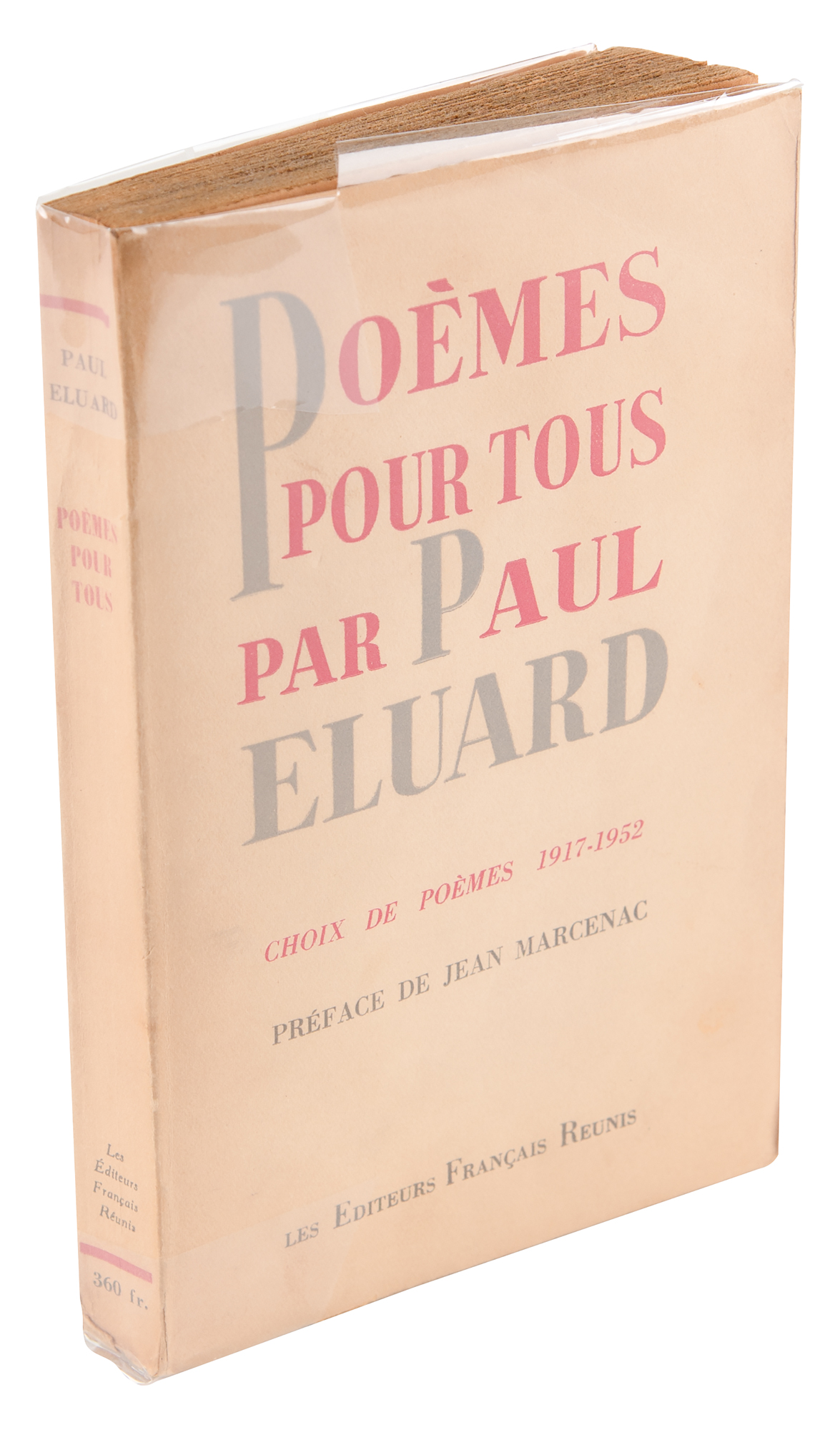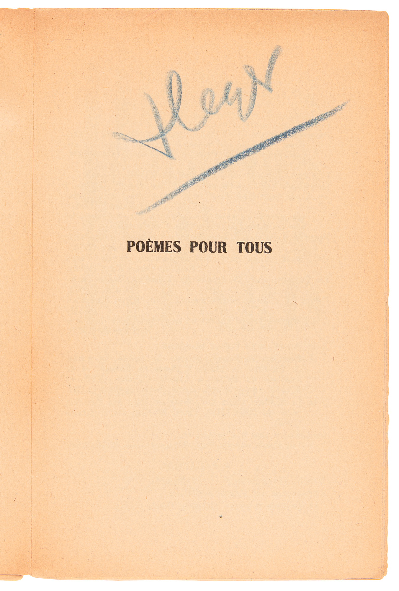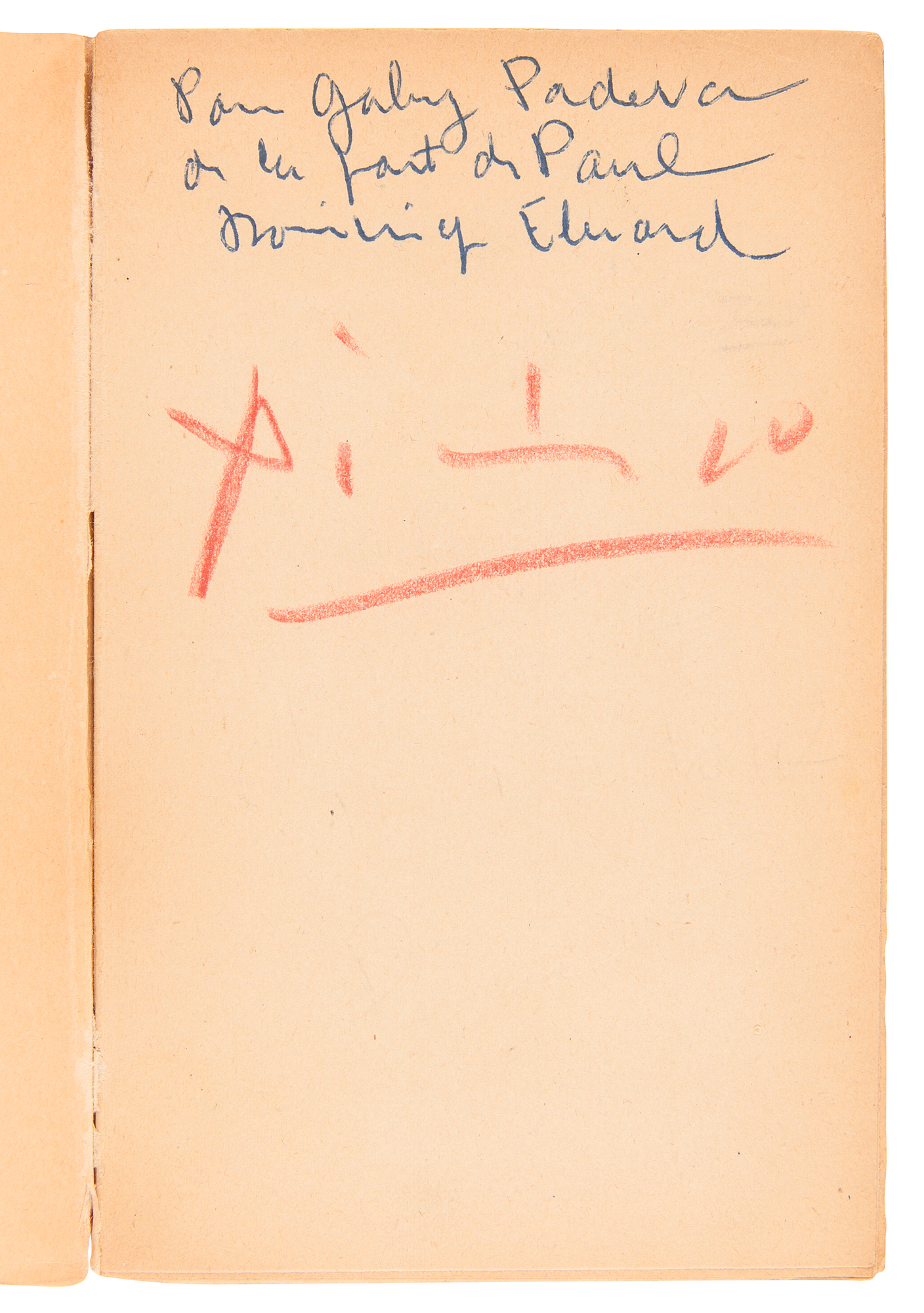 Signed French-language book: Poèmes pour tous par Paul Eluard: Choix de 1917-1952. First edition. Paris, France: Editeurs Francais Reunis, 1952. Softcover, 4.75 x 7.5, 233 pages. Signed prominently on the first free end page in red artist pencil, "Picasso," and in ballpoint by Eluard's widow, Dominique Lemort. The half-title page is signed in blue artist pencil by fellow French artist Fernand Leger. Autographic condition: fine, with some light surface impressions in the lower blank area of the signed page. Book condition: VG/None, with minor creasing to spine and uniform toning to textblock and wrappers. A desirable book signed by two of France’s most esteemed and influential creators, their ‘artist pencil’ signatures a fitting tribute to the book’s late author, Paul Eluard, a fellow master of the surreal who was close friends with both Picasso and Leger.