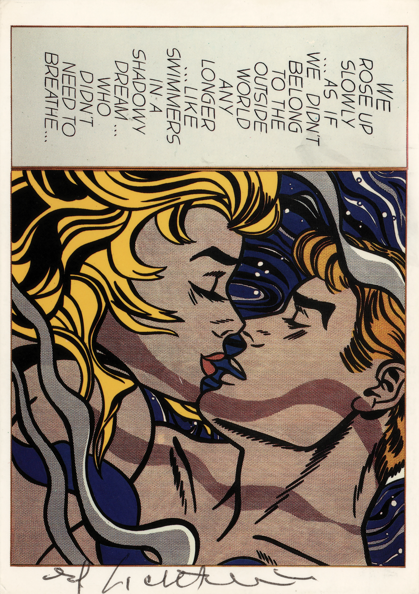 Color 5.75 x 4 postcard from Frankfurt’s Museum of Modern Art of Roy Lichtenstein's 1964 artwork entitled 'We Rose Up Slowly,' signed vertically in the right margin in black ballpoint by the artist. In very fine condition.