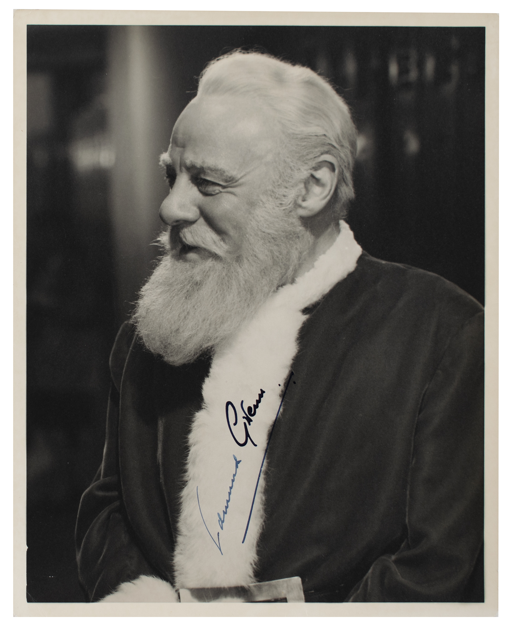 Vintage matte-finish 8 x 10 photo of Edmund Gwenn as Kris Kringle in the 1947 Christmas classic Miracle on 34th Street, signed neatly in fountain pen. In very fine condition. One of the finer Gwenn photos we have ever offered, an example highlighted by its large size, great image, and lack of inscription. A superb signed photo of the only actor to have won an Academy Award for playing the role of Santa Claus.